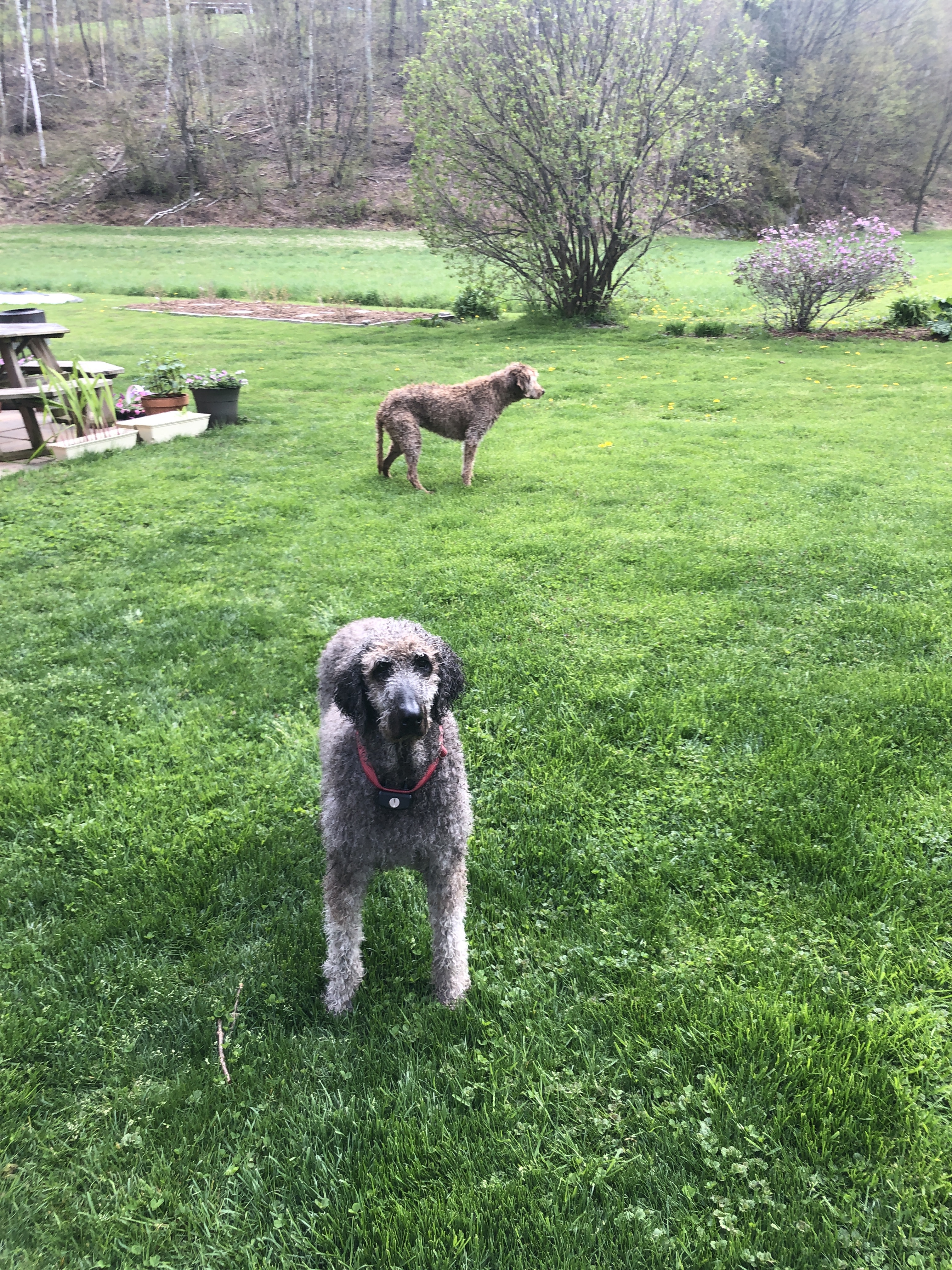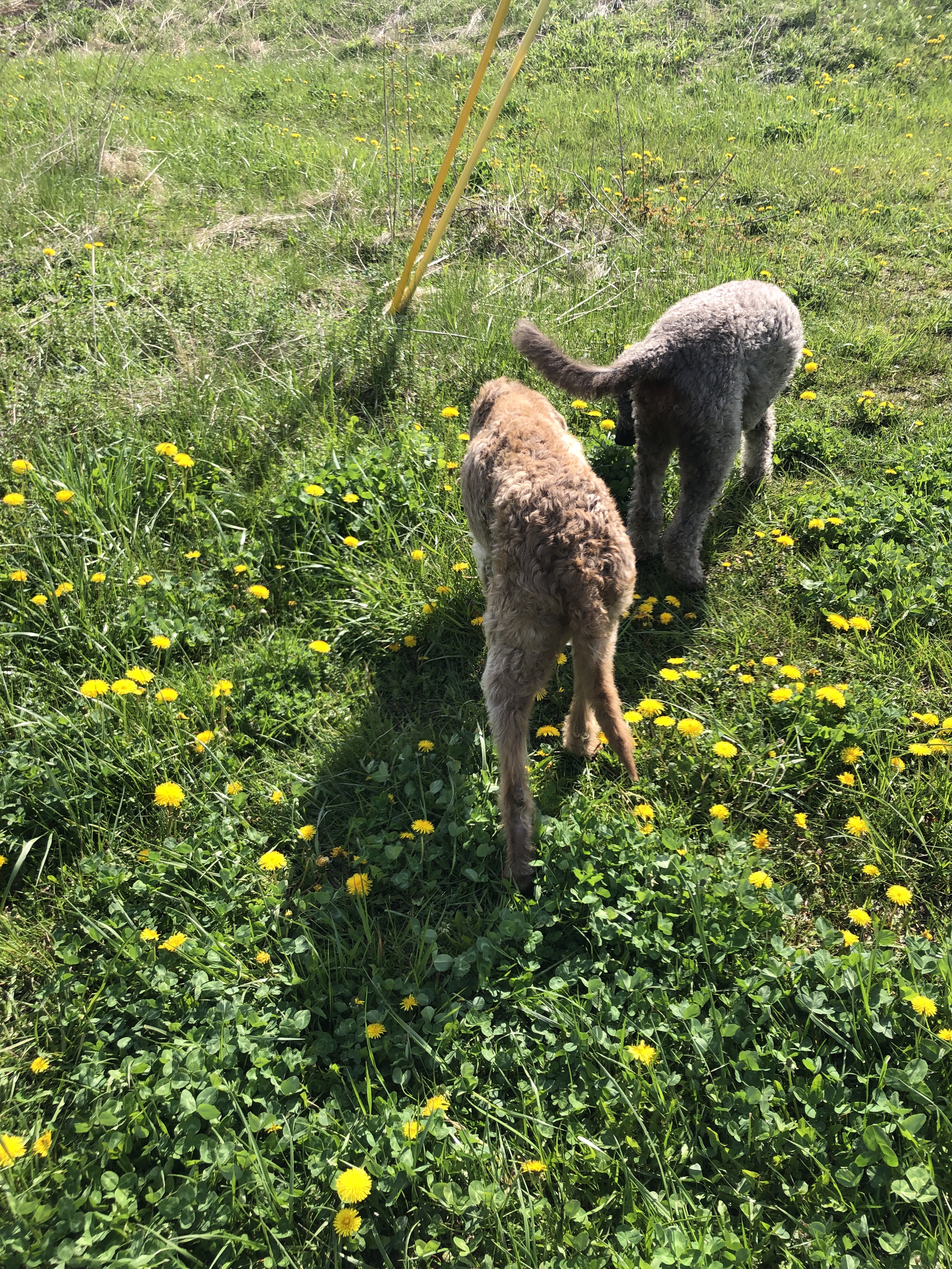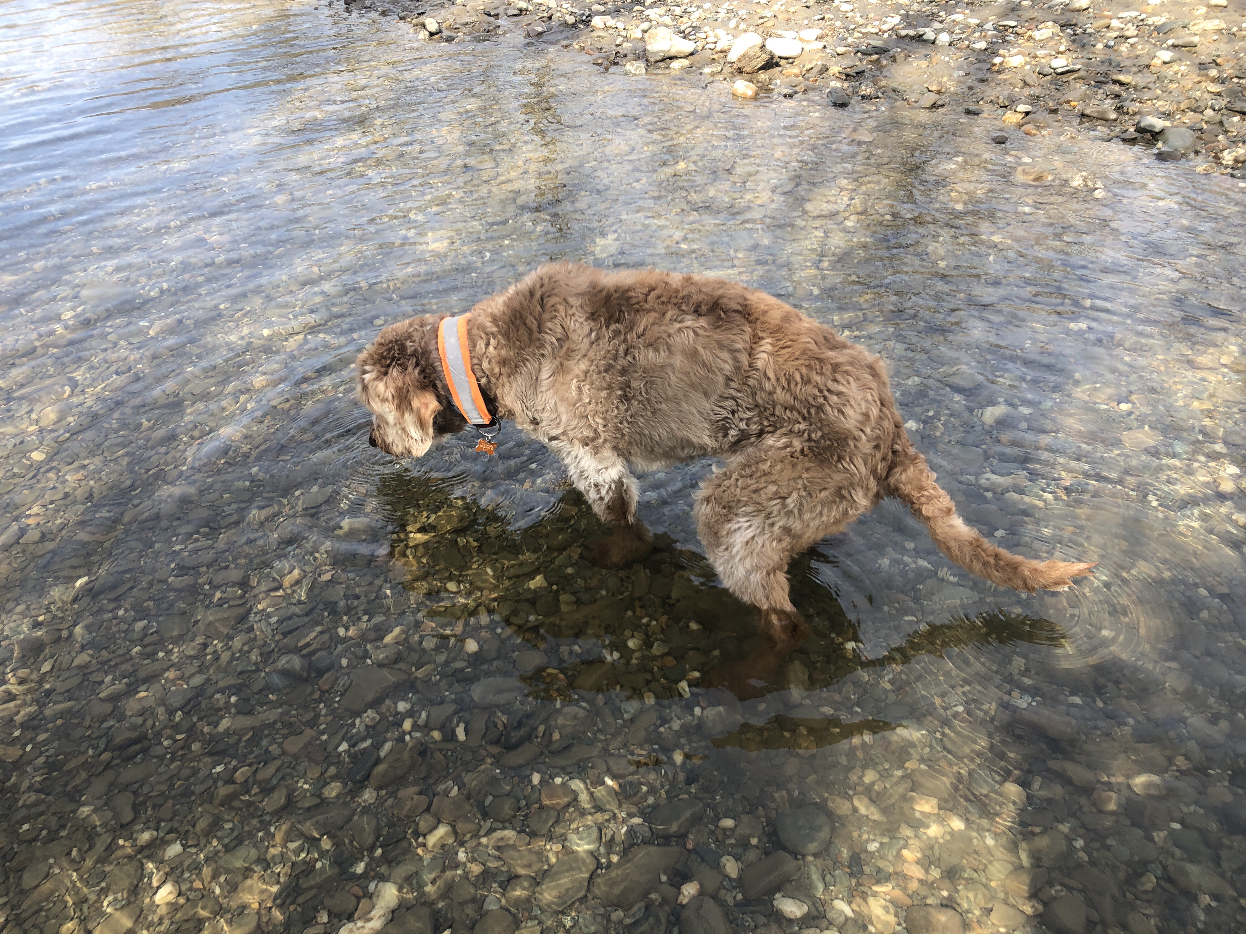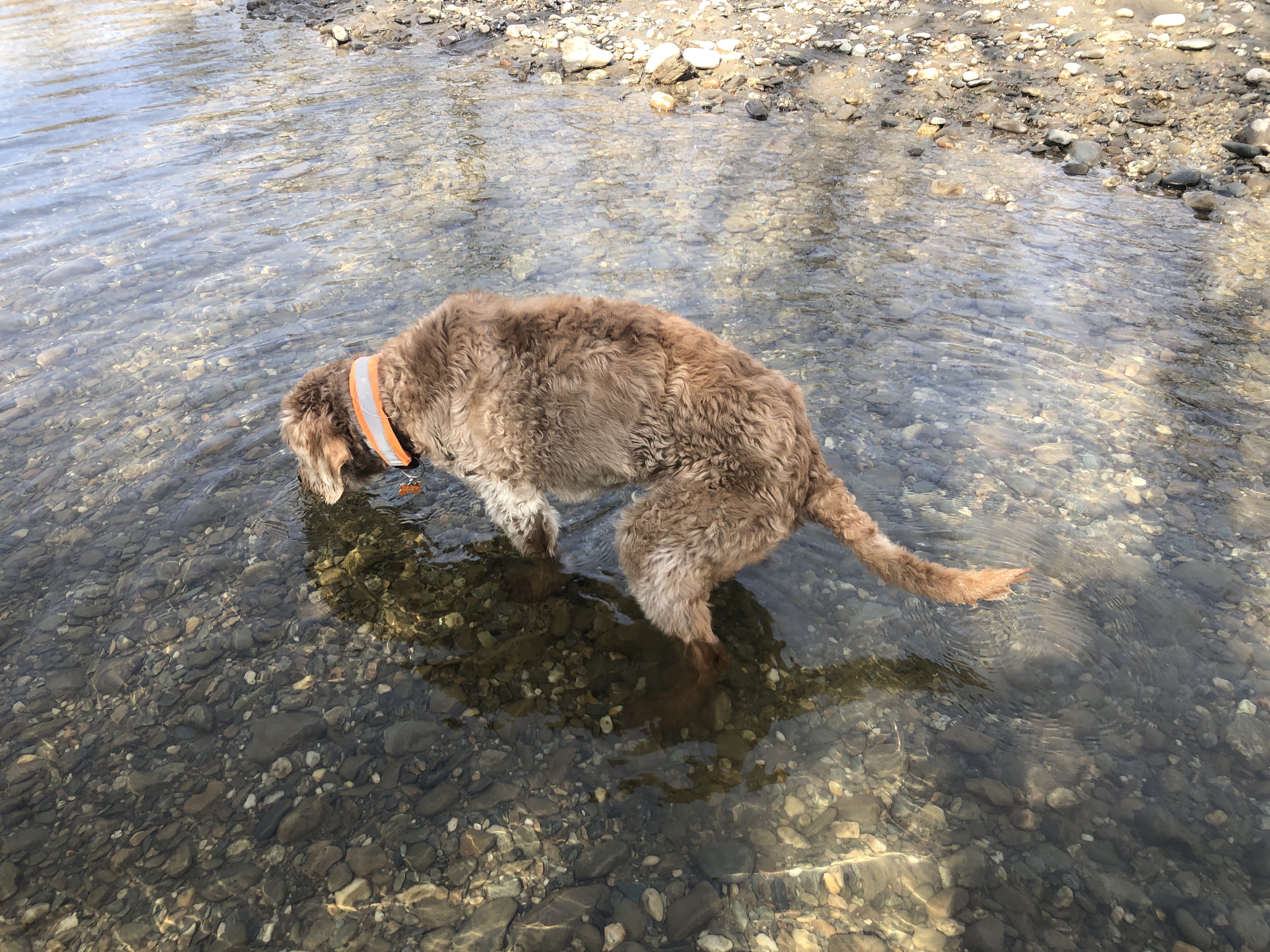 Super nice Sunday. Kind of hot and muggy… Almost hit 70. I’m not ready for that yet. Diane and I got the storm windows down downstairs and got the screens and all the windows… That helps.… Got the girls out for a walk in the field across the street. Chai was determined to get in the river…