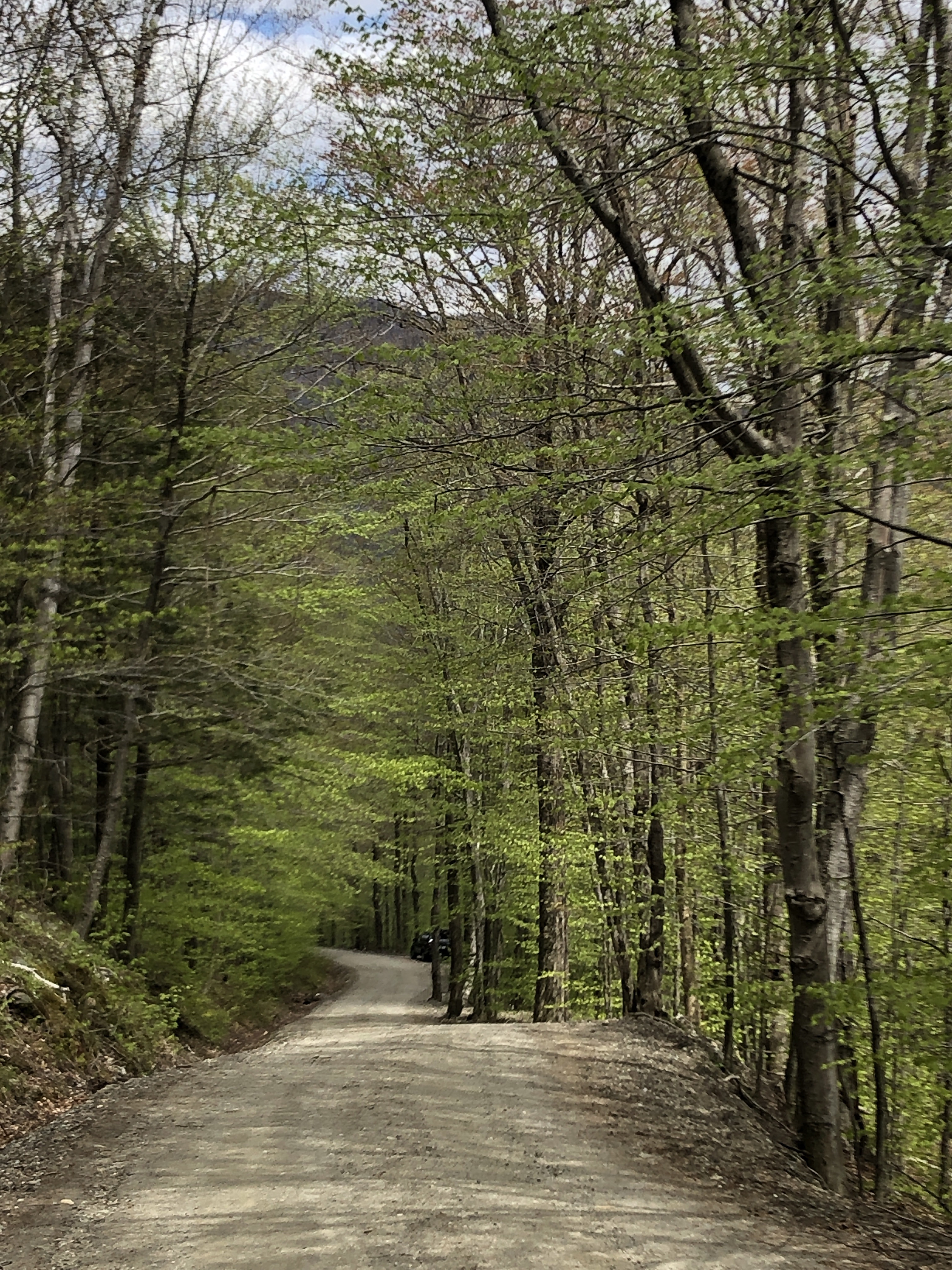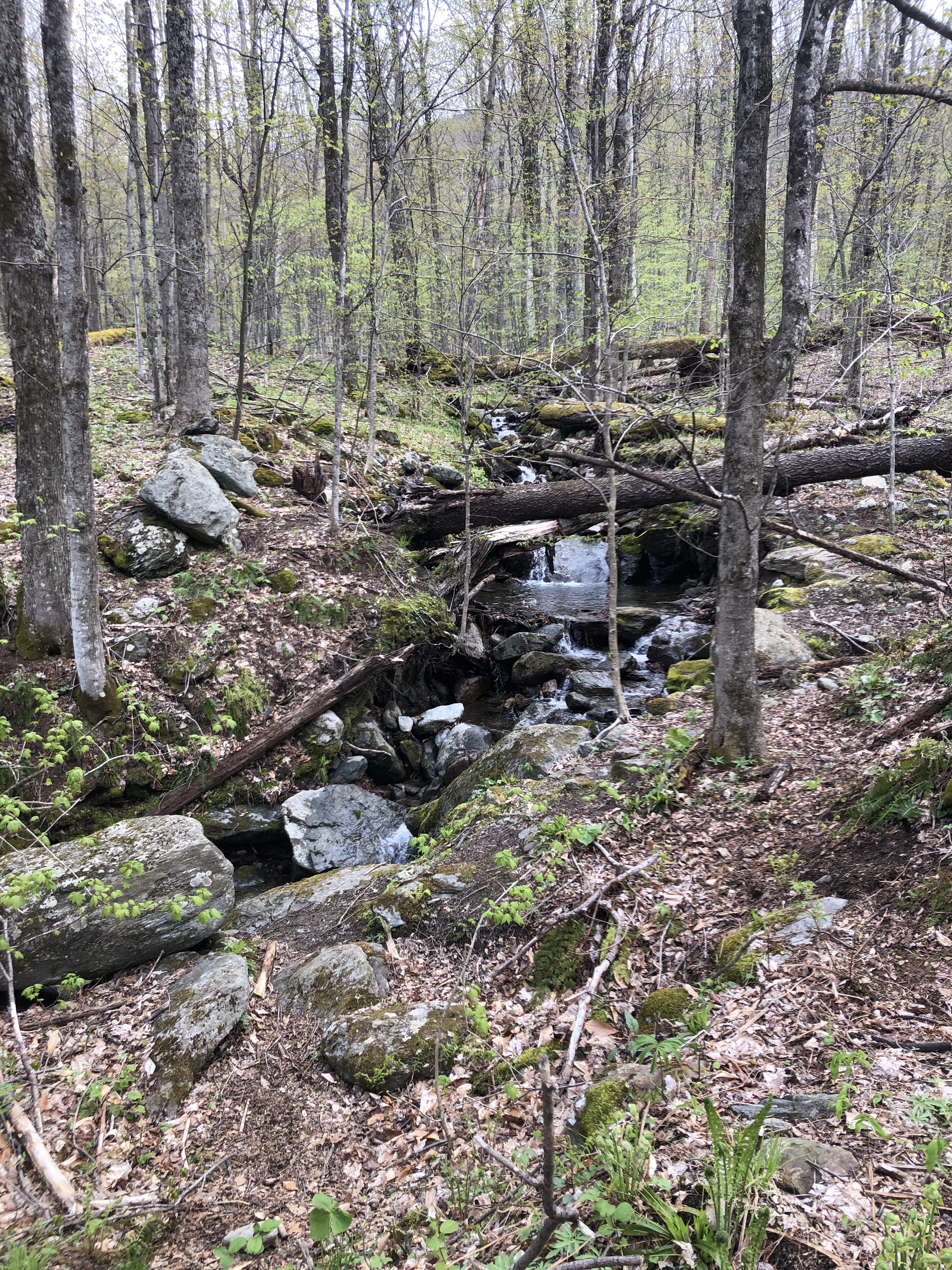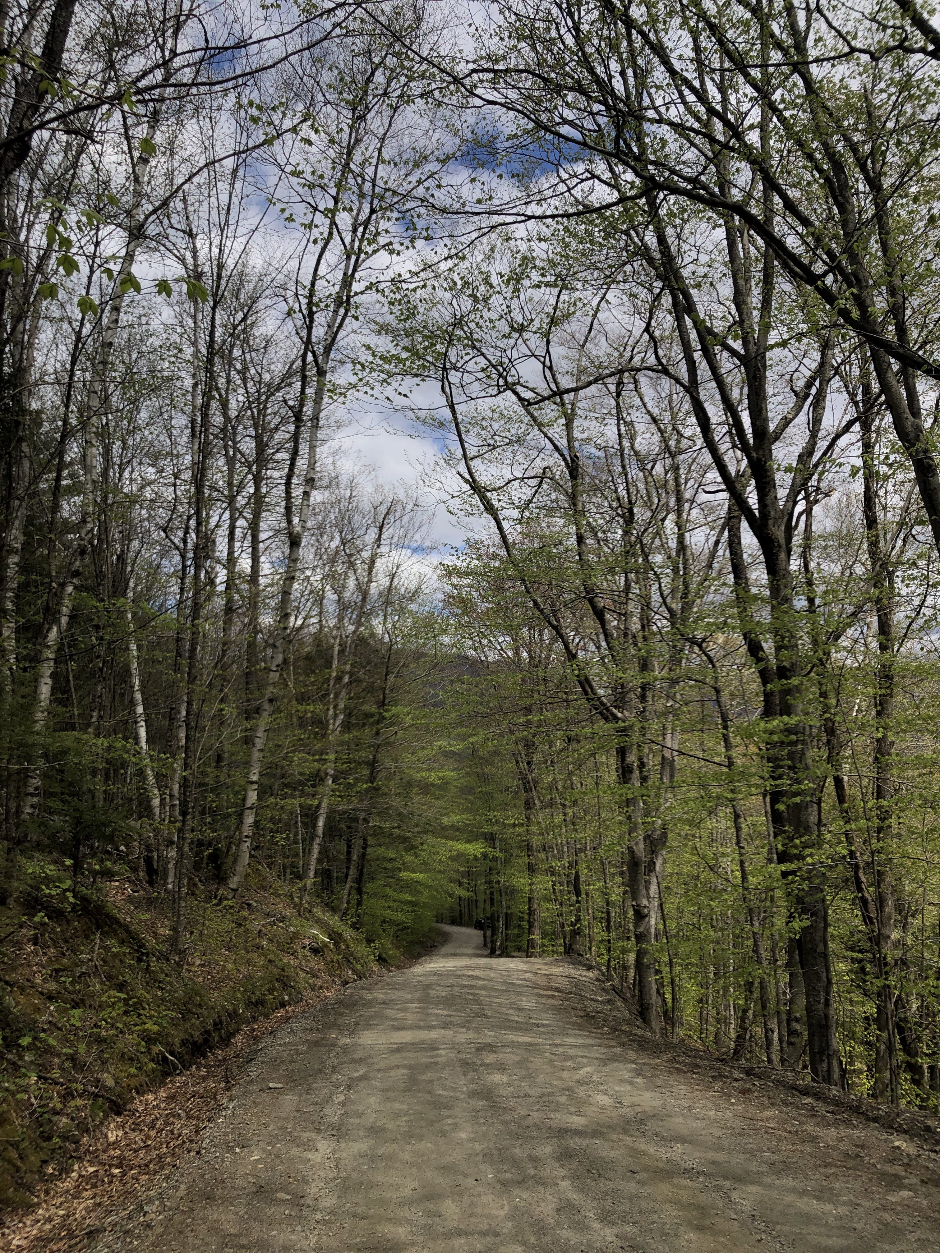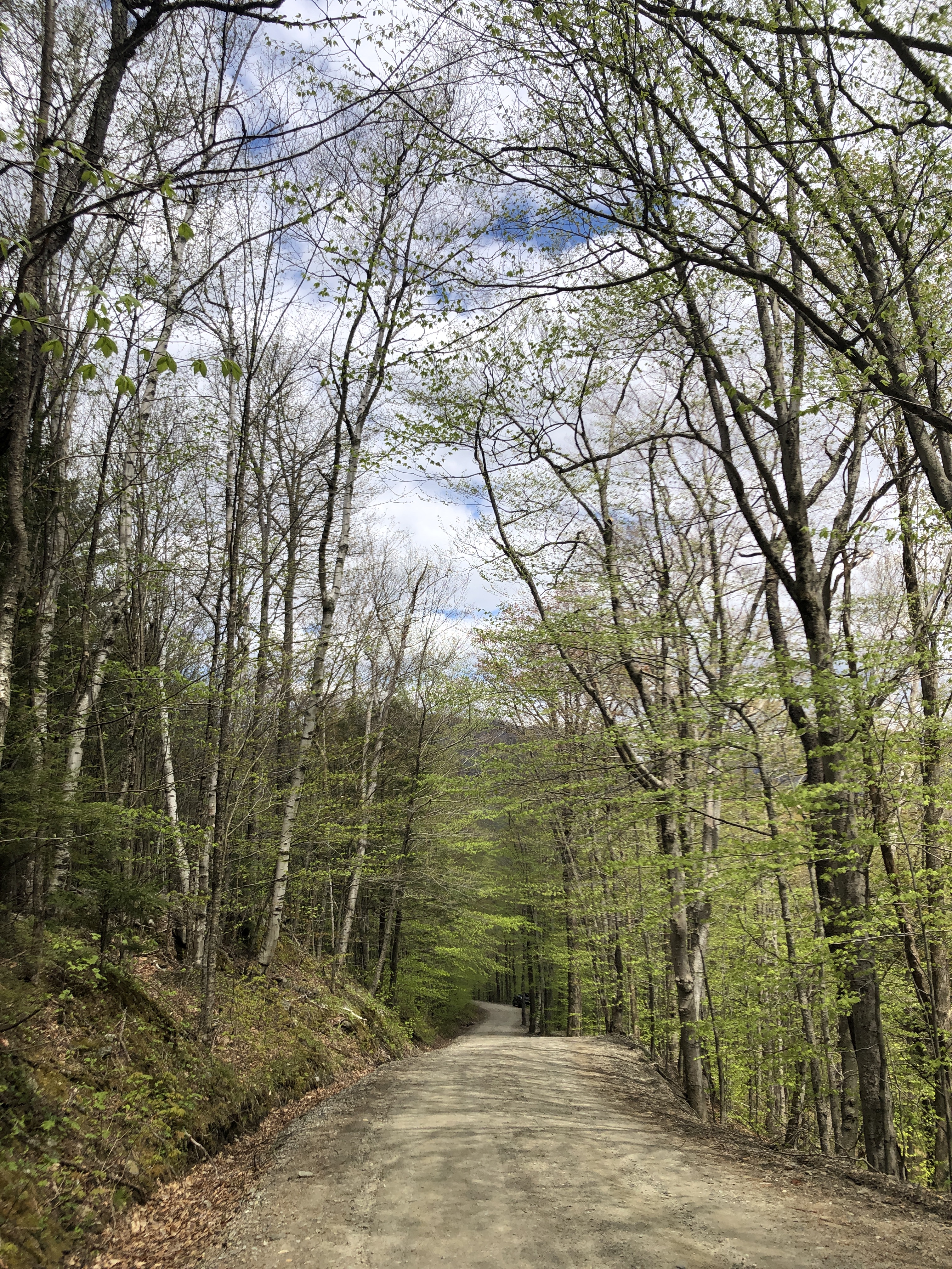 Late morning Diane and I did one of our favorite hikes in reverse. We walked/ran Up the catamount trail and down Honey Hollow. The trees had managed to sprout leaves in the last week so everything had that bright spring green.