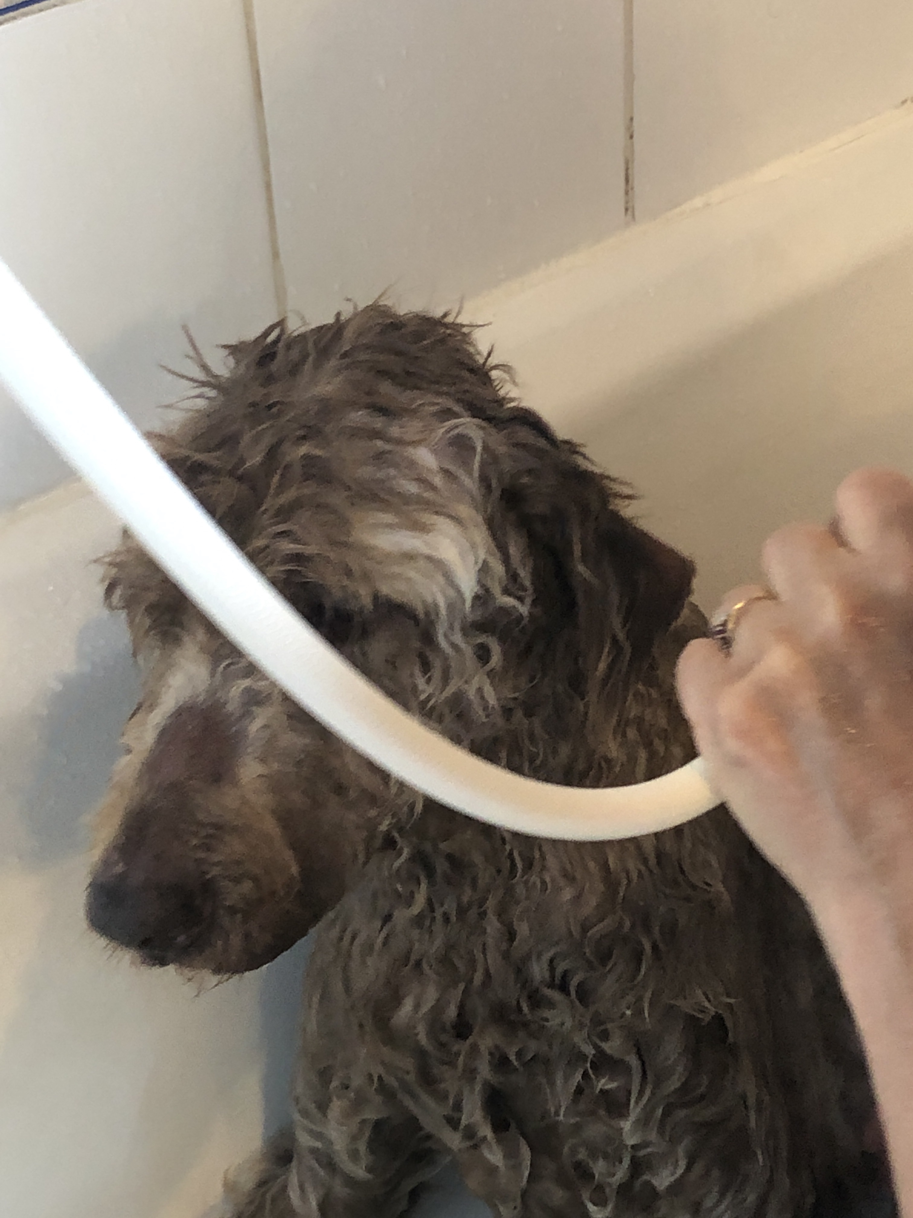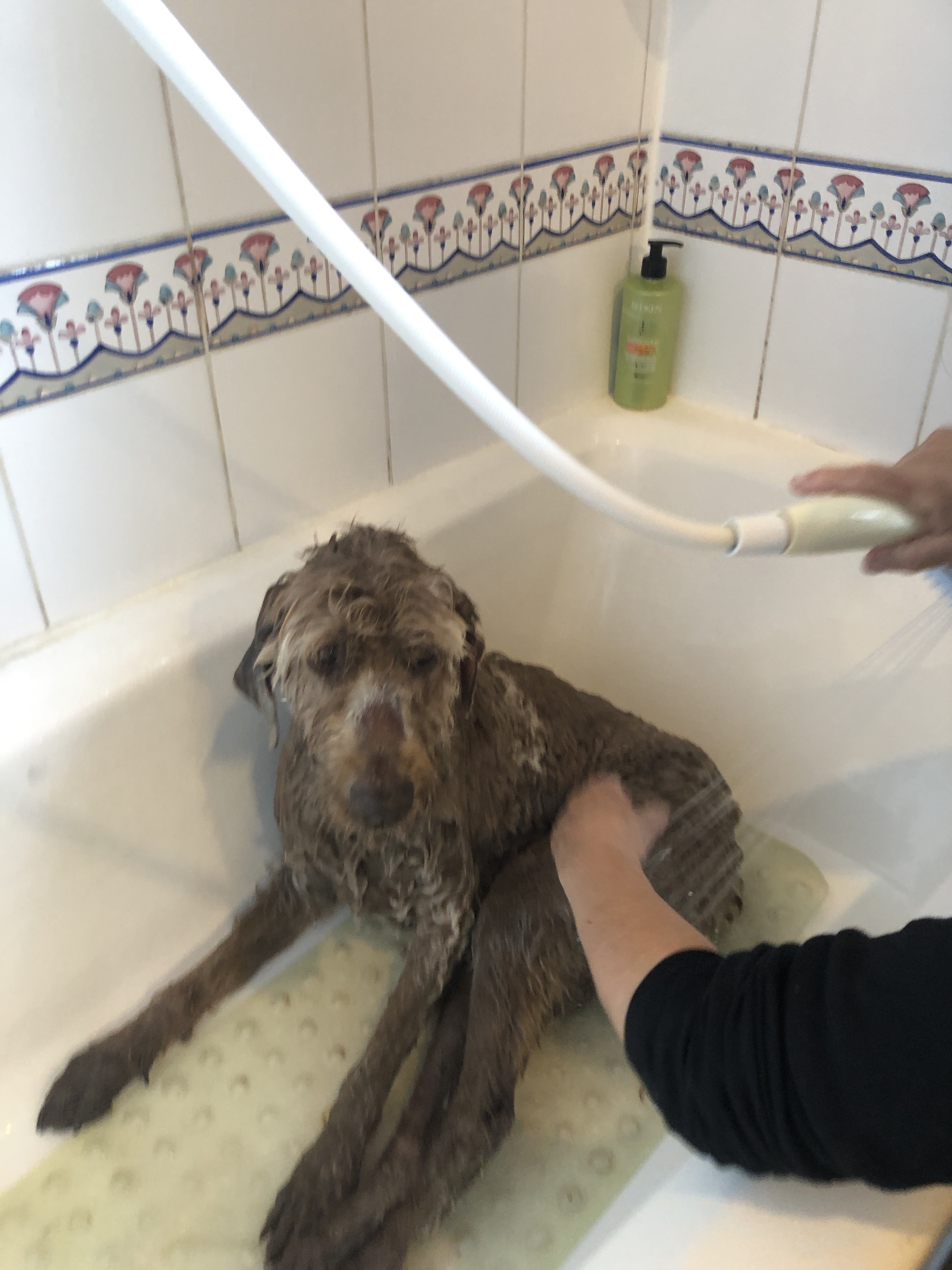 Once we got home it was time to give the dogs a bath. They both really needed it. At this point I have to carry Jay up the stairs… But she seem to not mind getting scrubbed down.… Of course we played them both with treats