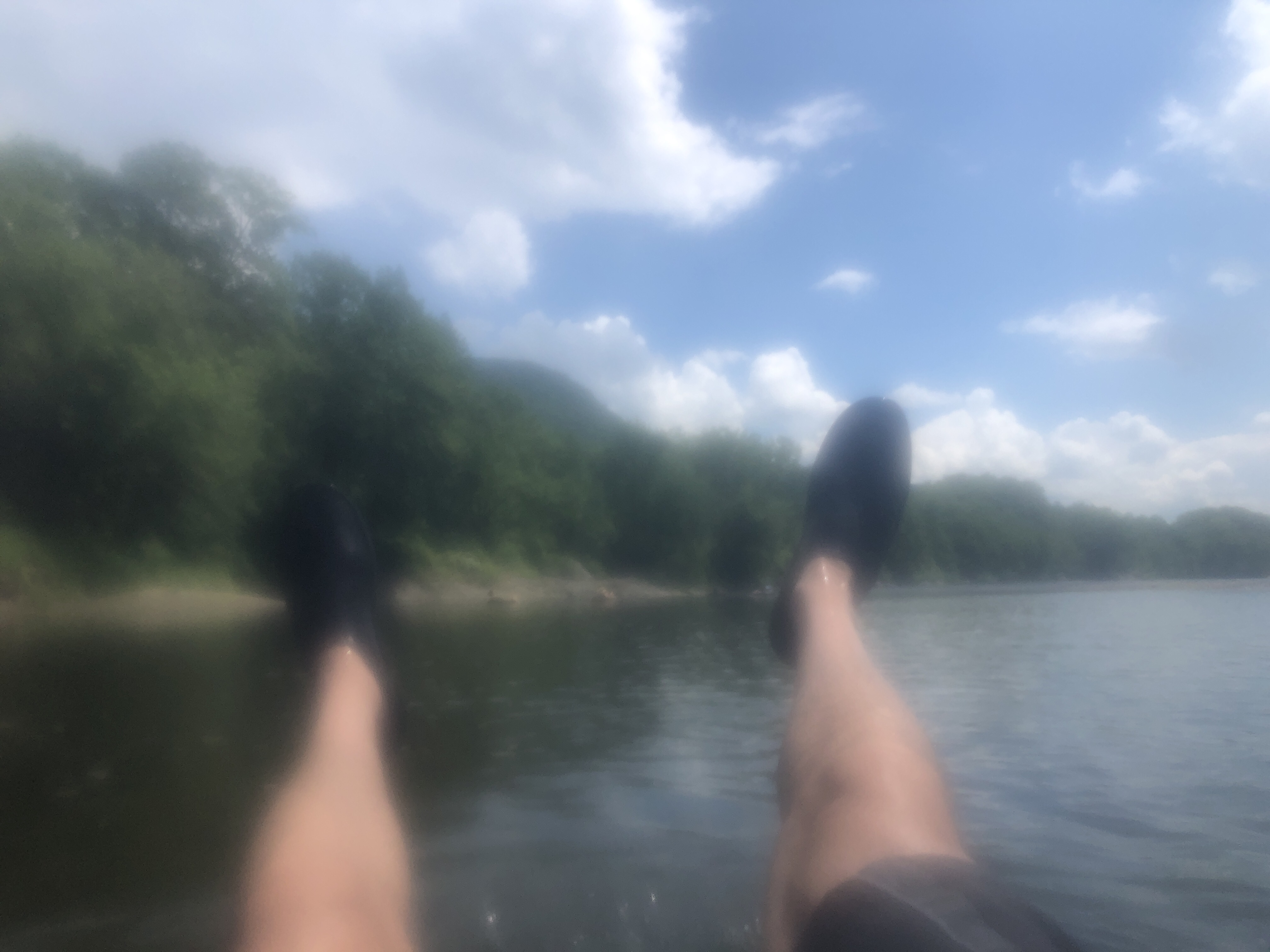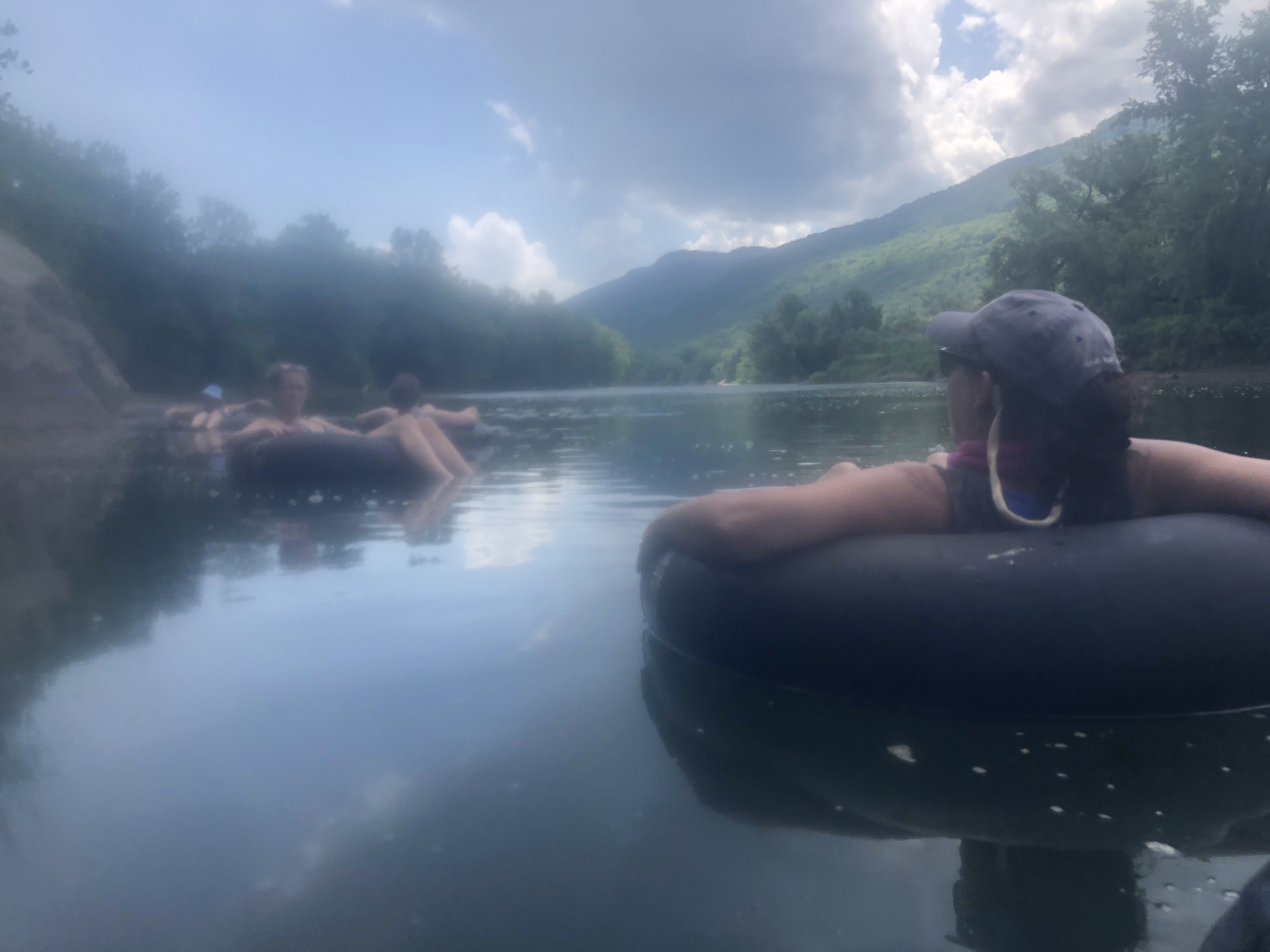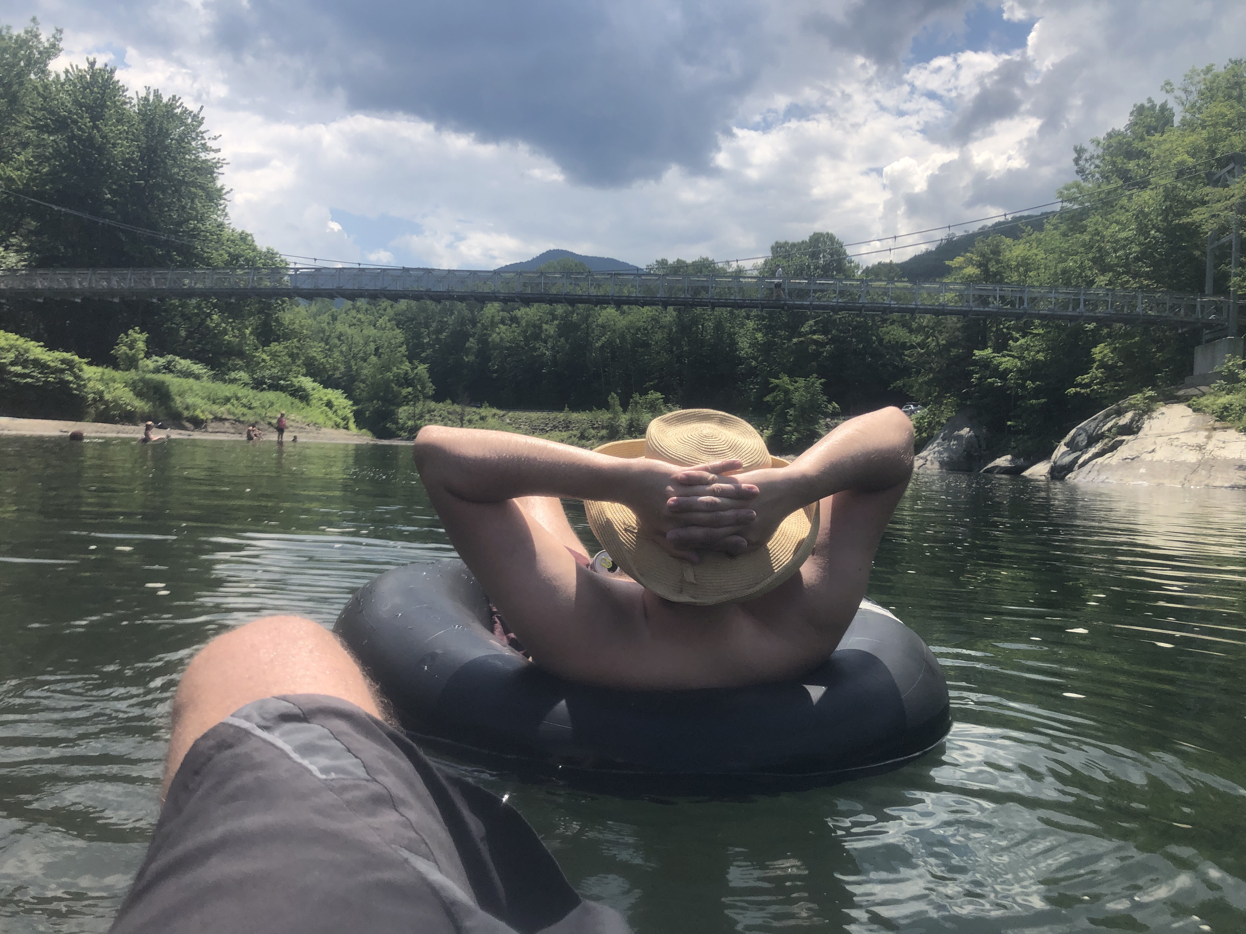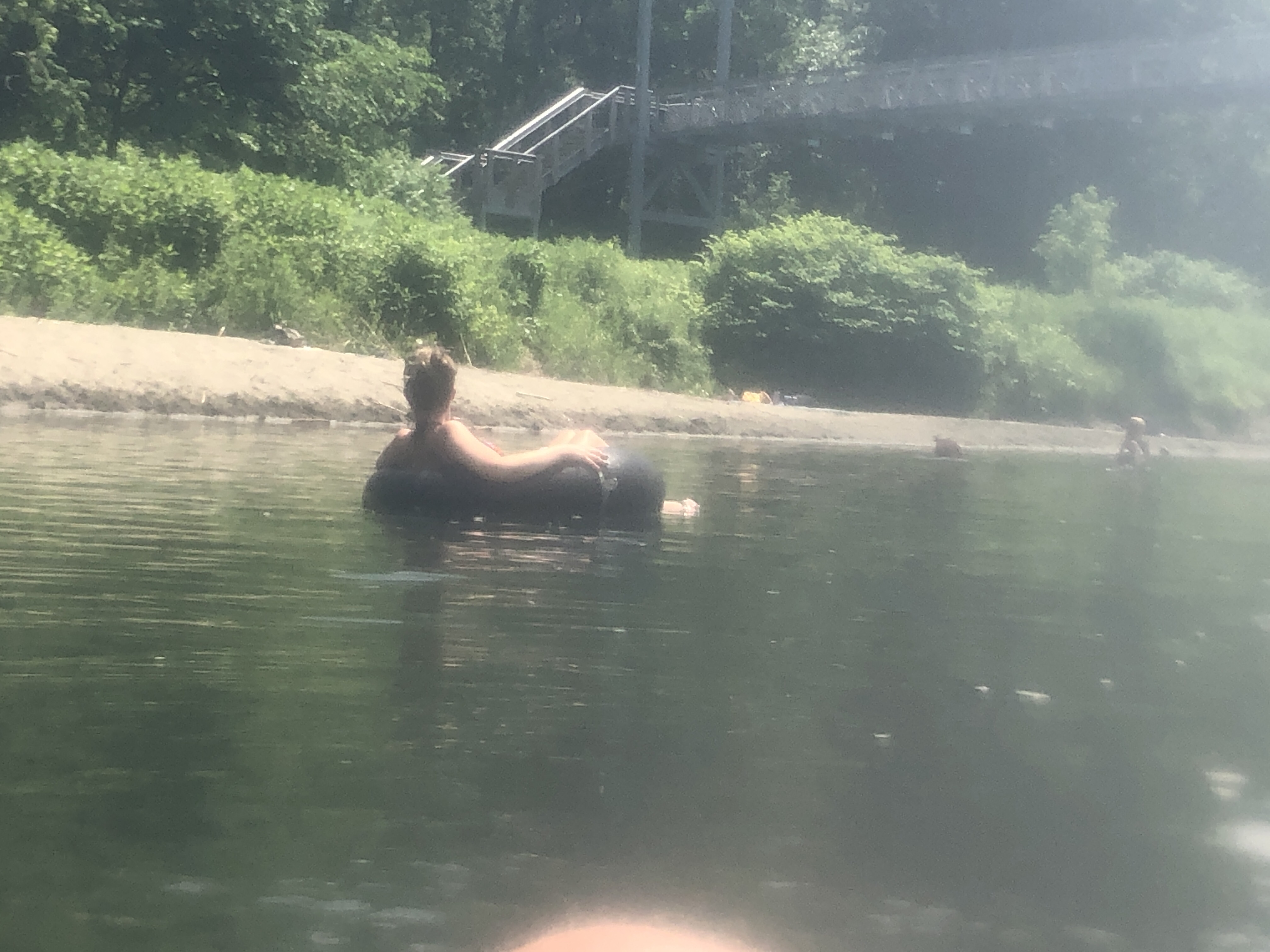 We mark the day really well. We started out with a great pink fish breakfast… And then went tubing on the Winooski with our friends Ellen, ‘Will and Julia. We put in about 2 1/2 miles up river and floated back home. It was a beautiful hot and sunny day. And the water was very low and slow so it took a good long while. Fantastic fun