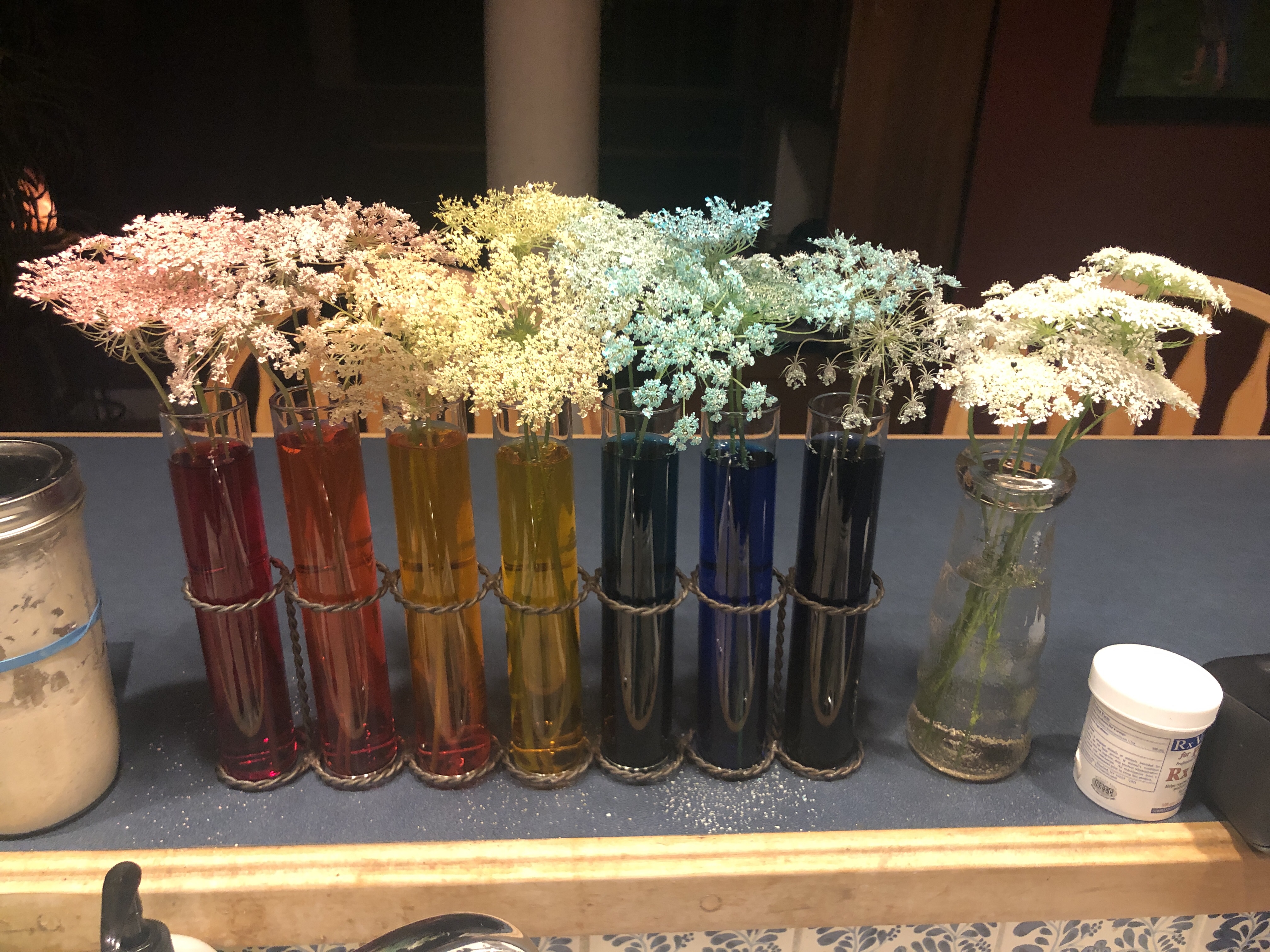 We’re getting prepared for a Sunday science moment with our friends Lucie and victor. Diane harvested some Queen Anne’s lace that she found in the field and did our annual coloration experiment. It’s really simple. He put the cut flowers in colored water and they take the color out. So simple and so cool