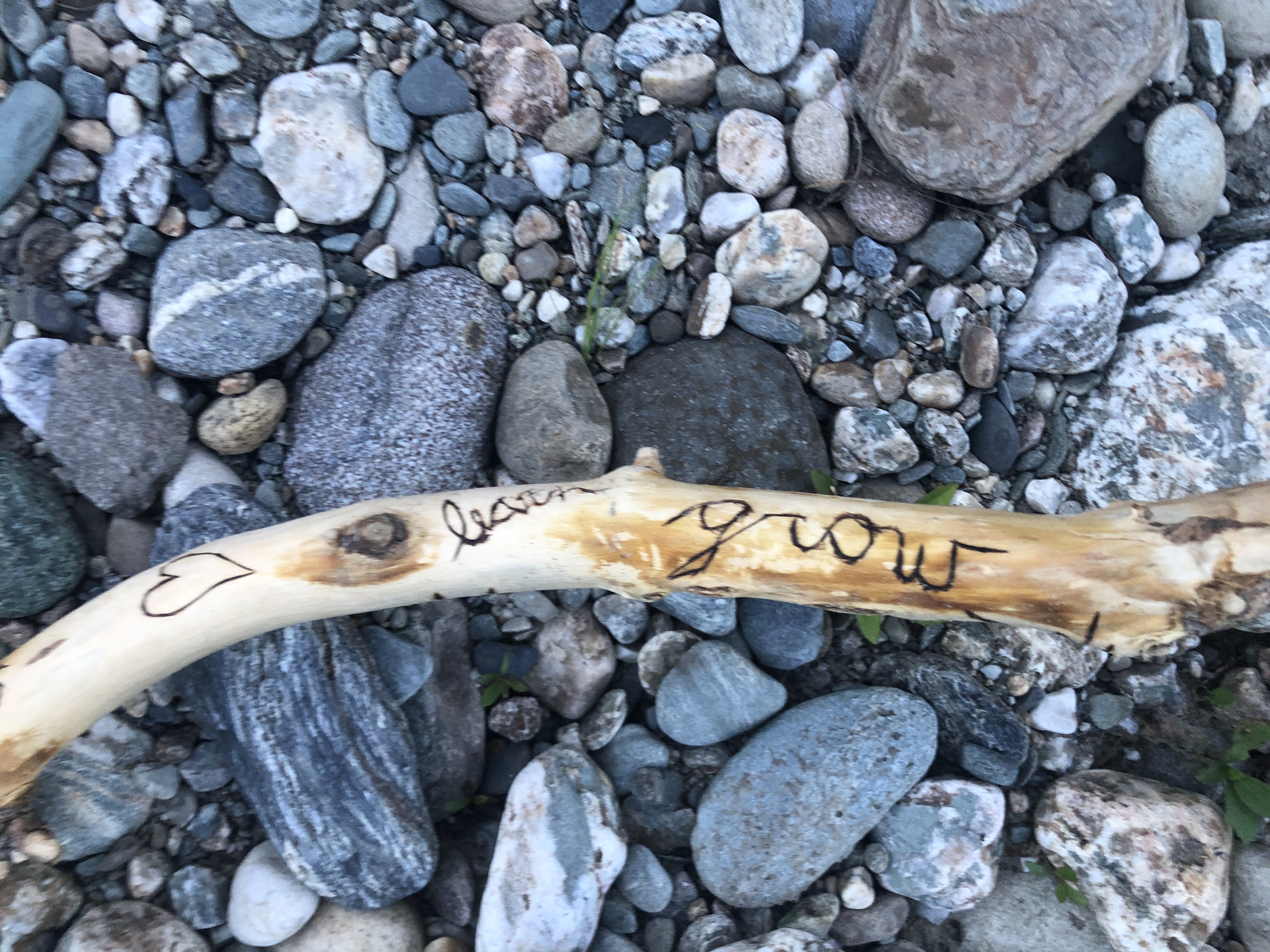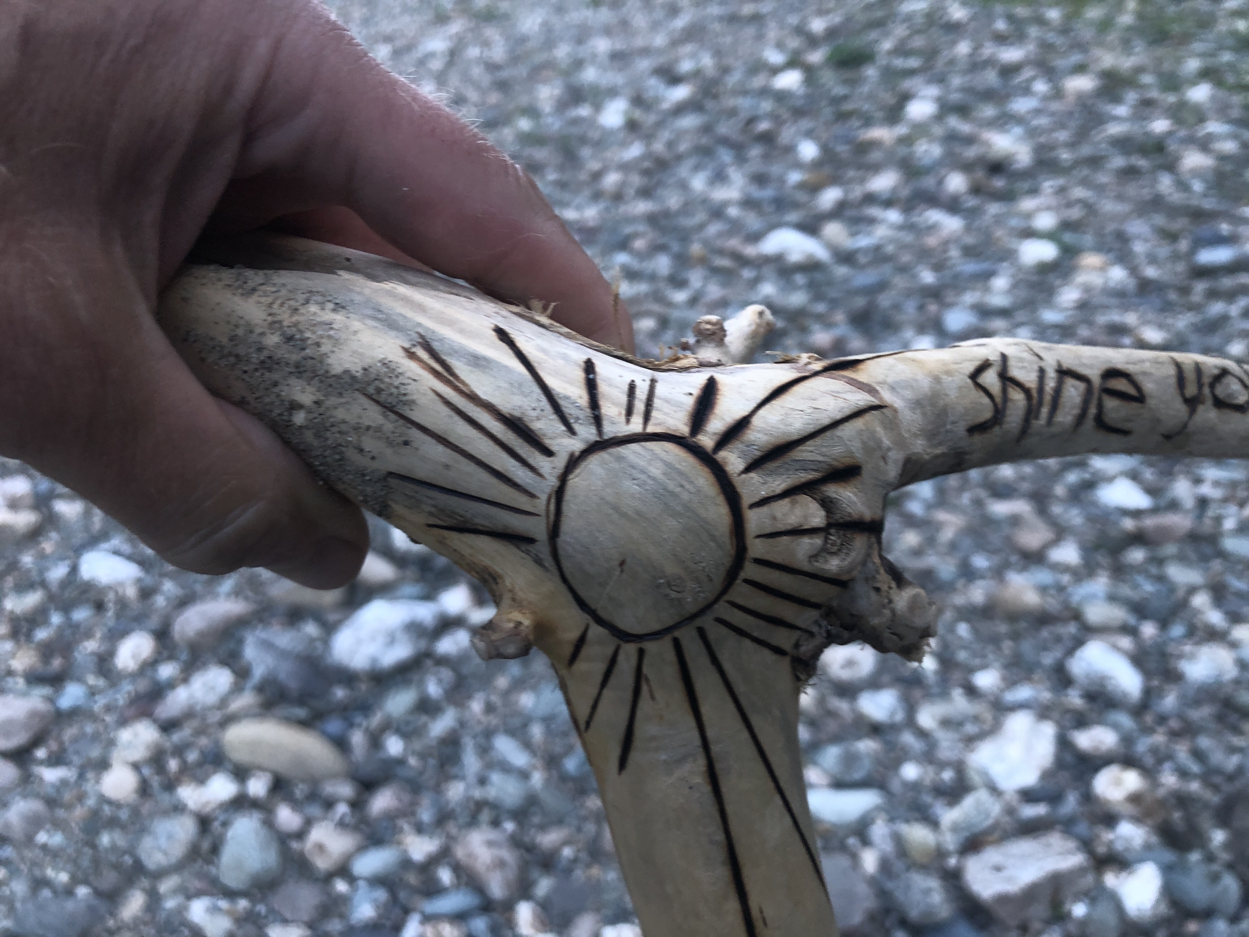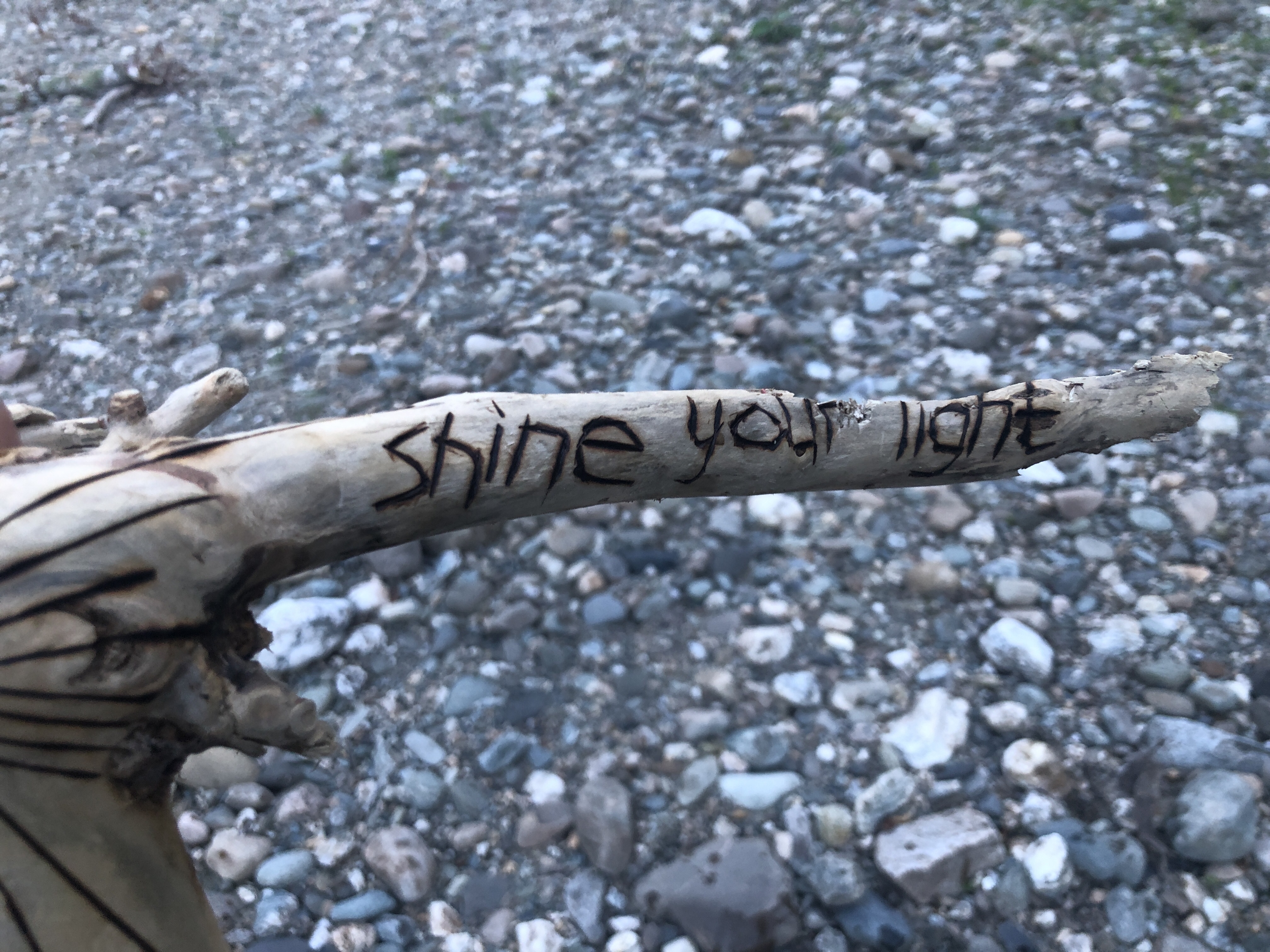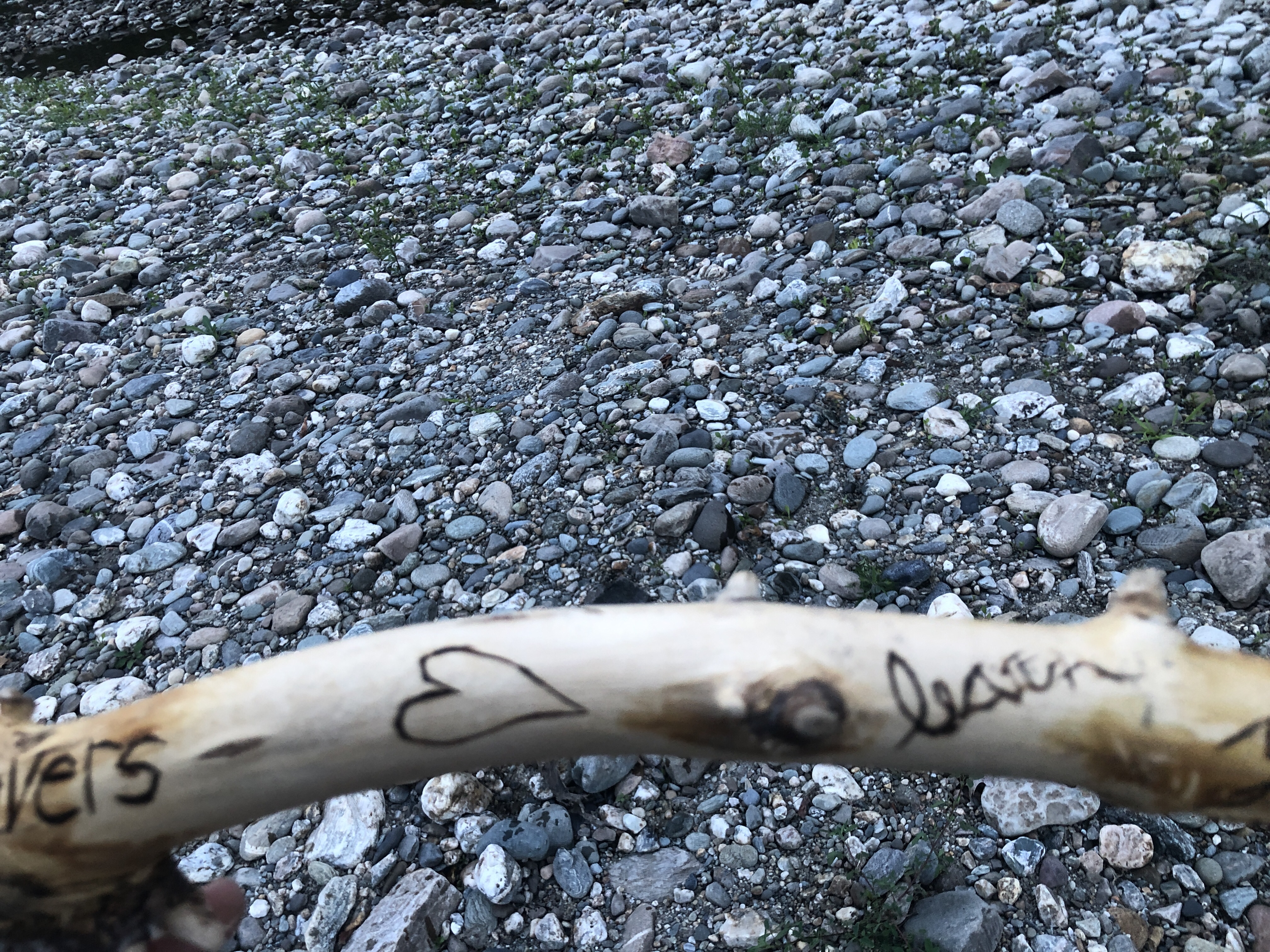 Last night when I was taking chai to the river… Still so strange with just her… I saw an amazing piece of natural art. It was a stick with several burned inscriptions. It was roughly done… But it was obviously left there for someone to find… It had several inscriptions including a hashtag