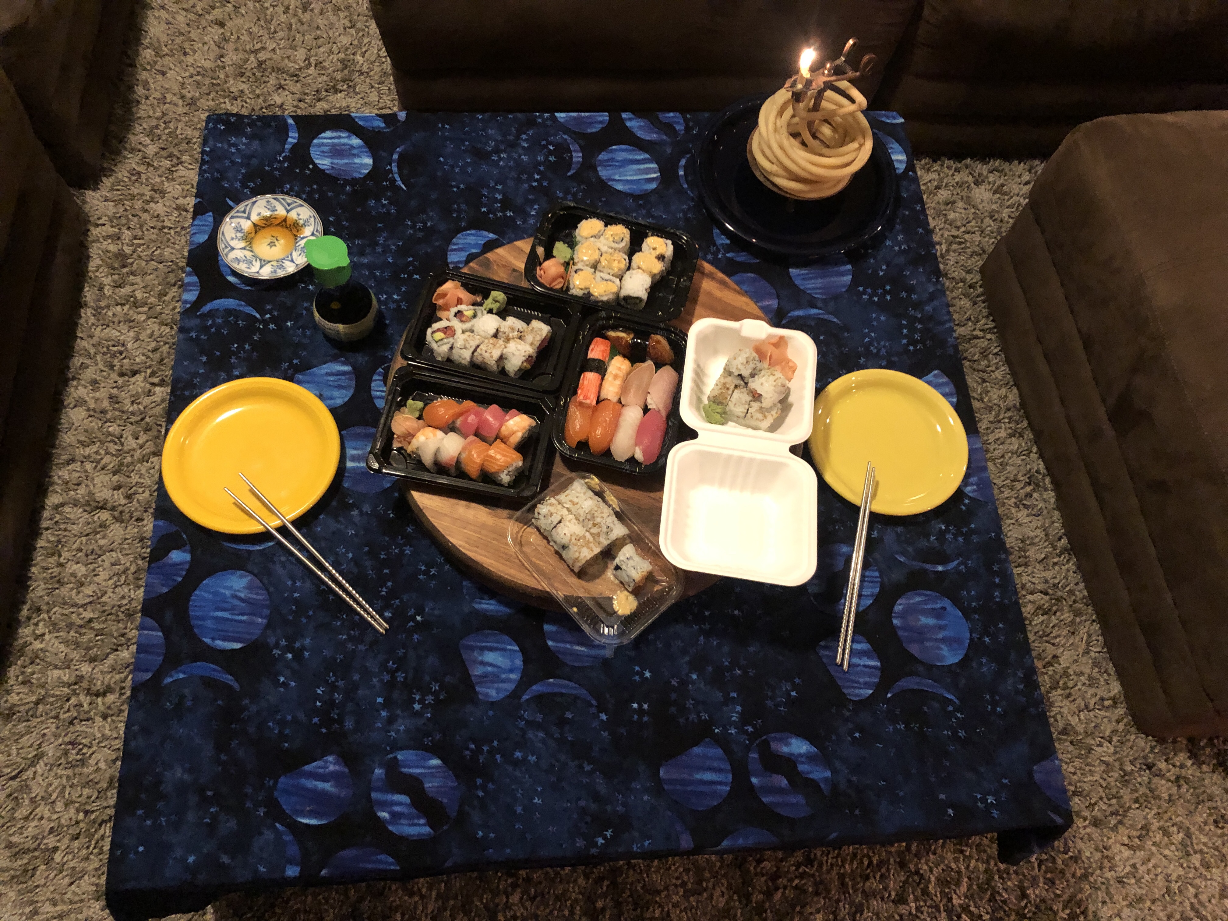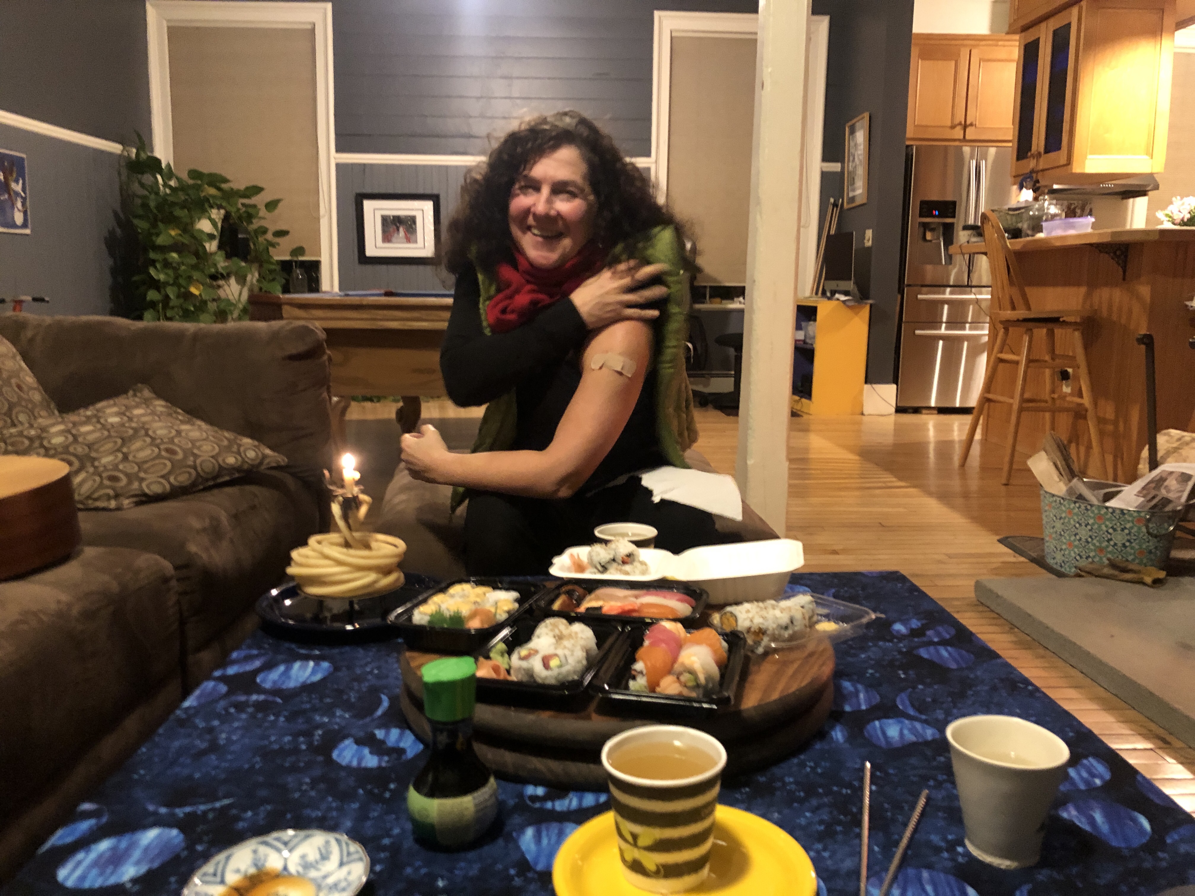 Here’s our celebratory sushi… Along with Diane’s badge of honor for her successful shingles shot