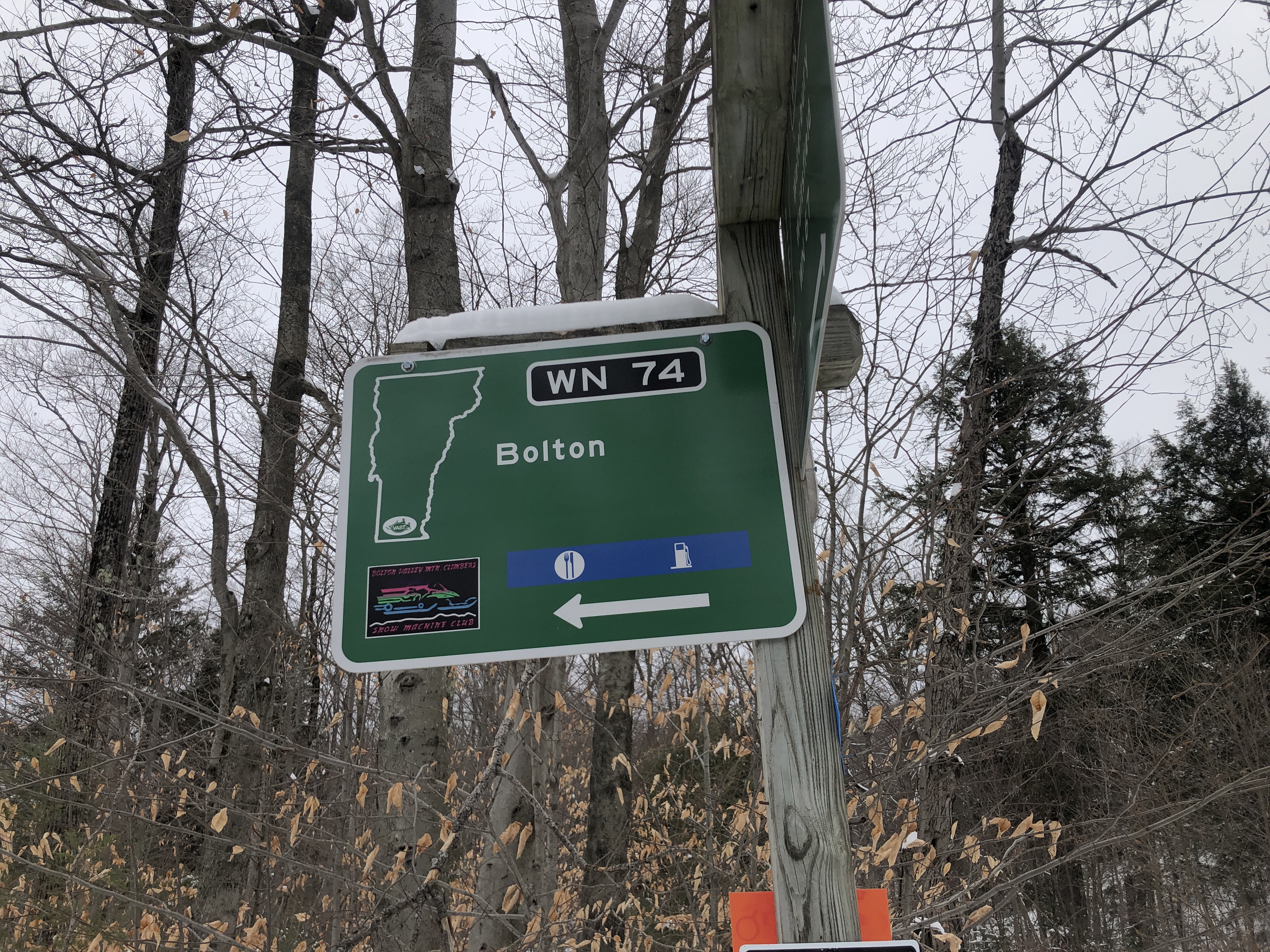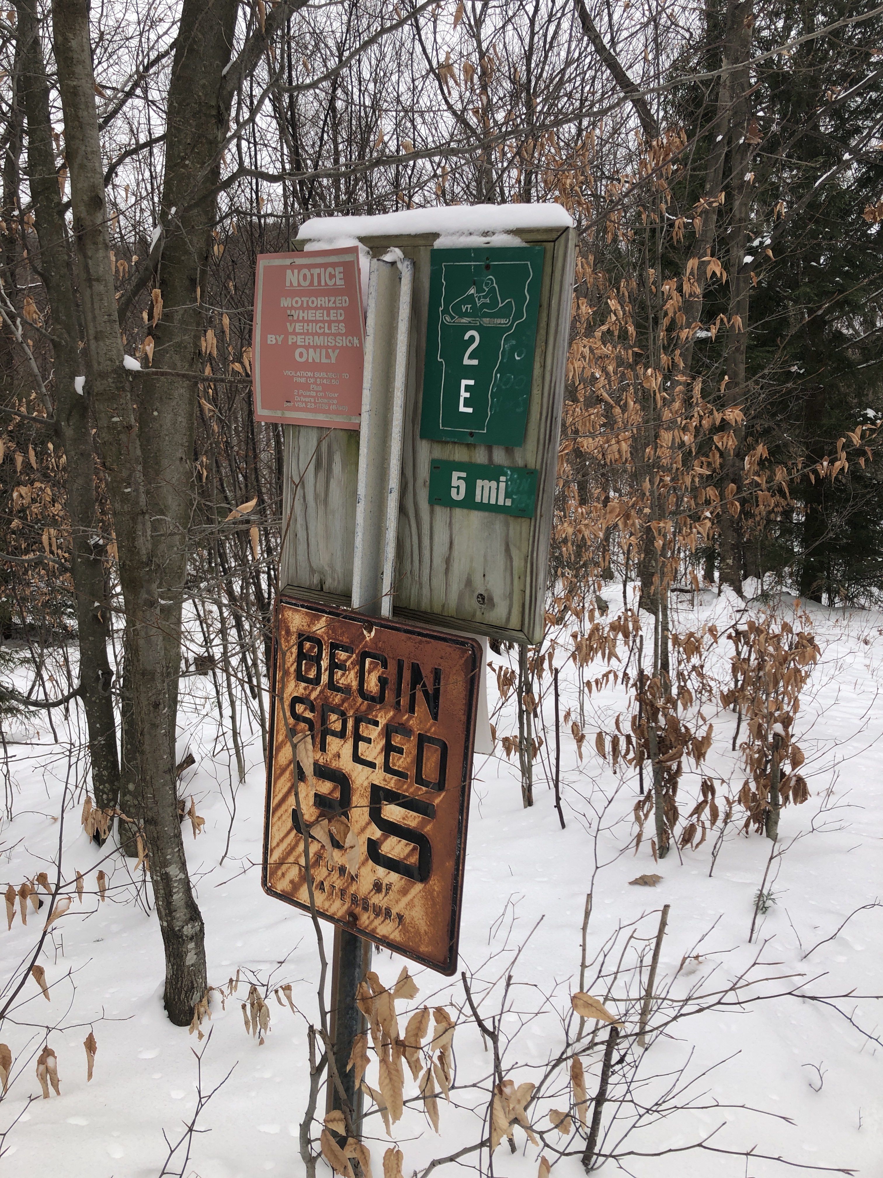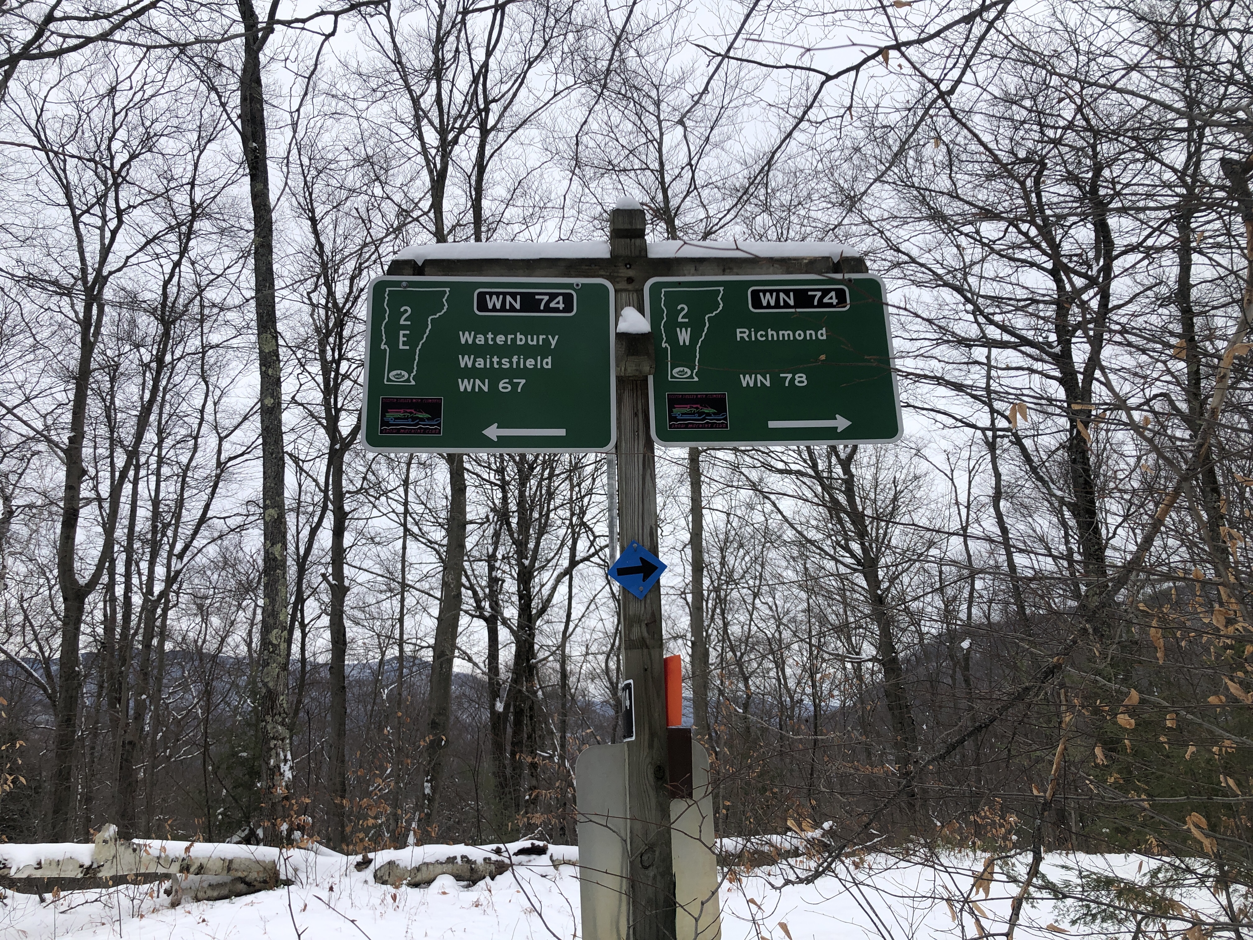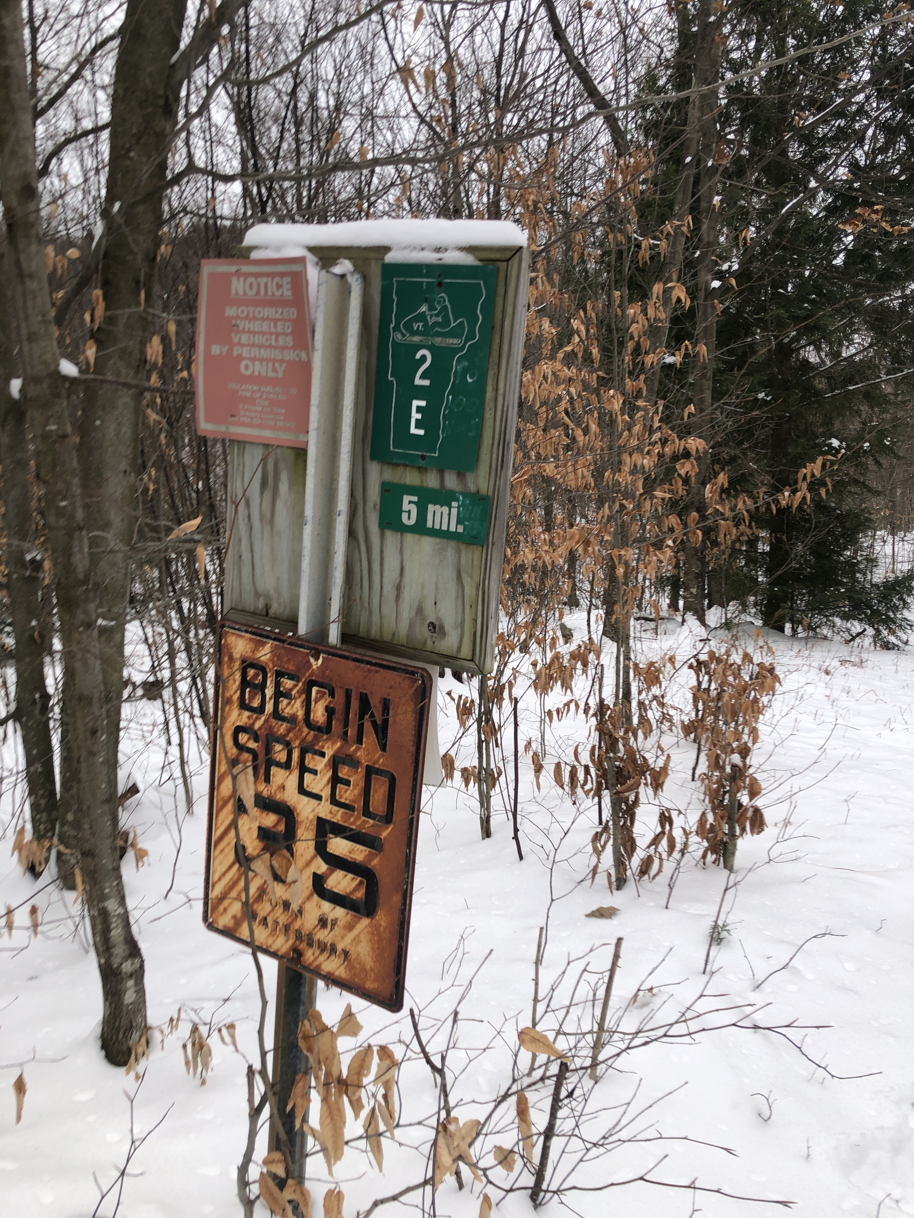 The catamount trail shares some of its route with the VAST (Vermont Association of snow travelers) Snowmobile trails.… Well it’s not always peaceful to be hiking or skiing or snow mobiles… We certainly appreciate the care they put into putting these trails in and maintaining them.… We walked about 2 1/2 miles into the woods and it’s always surprising to see the road signs at the intersection of these trails.