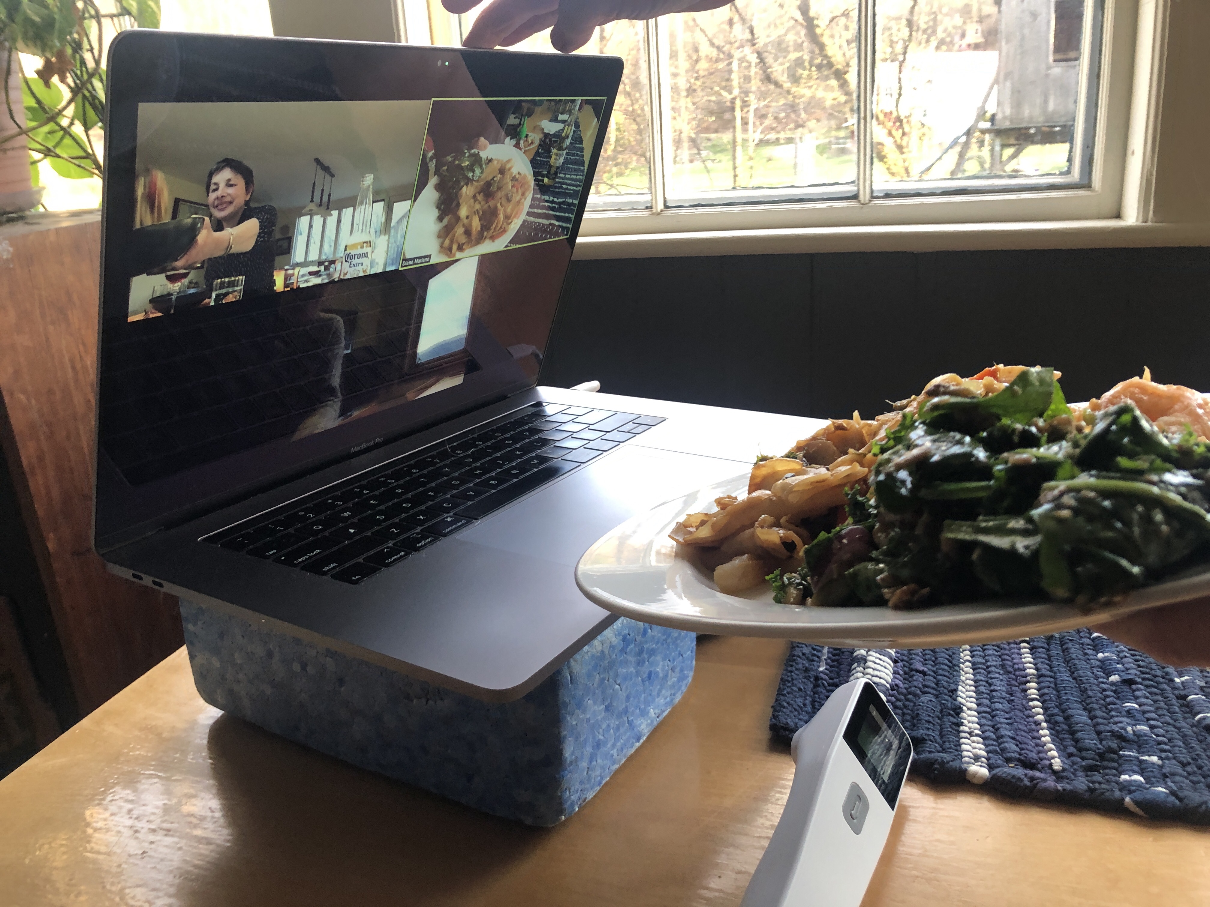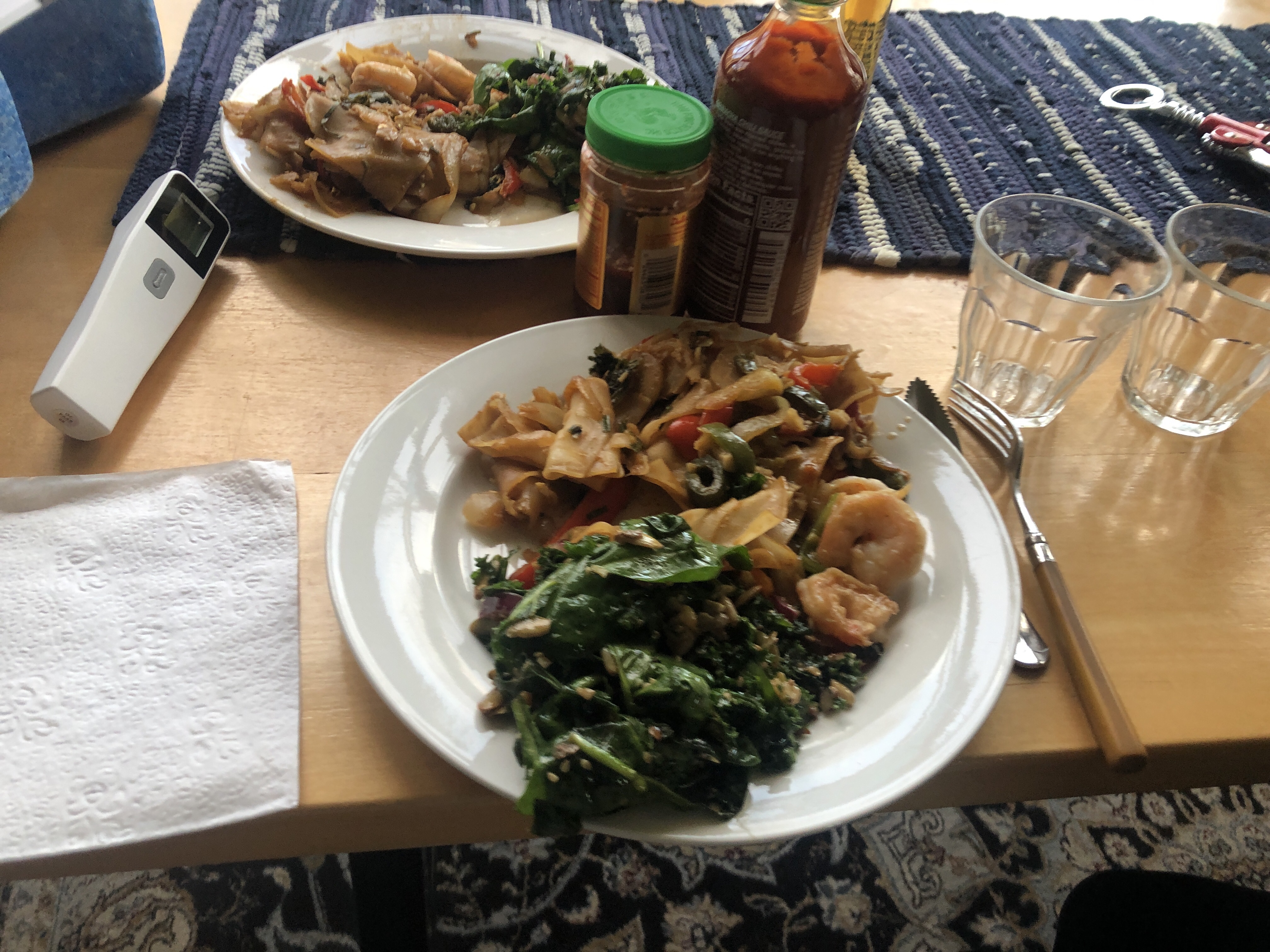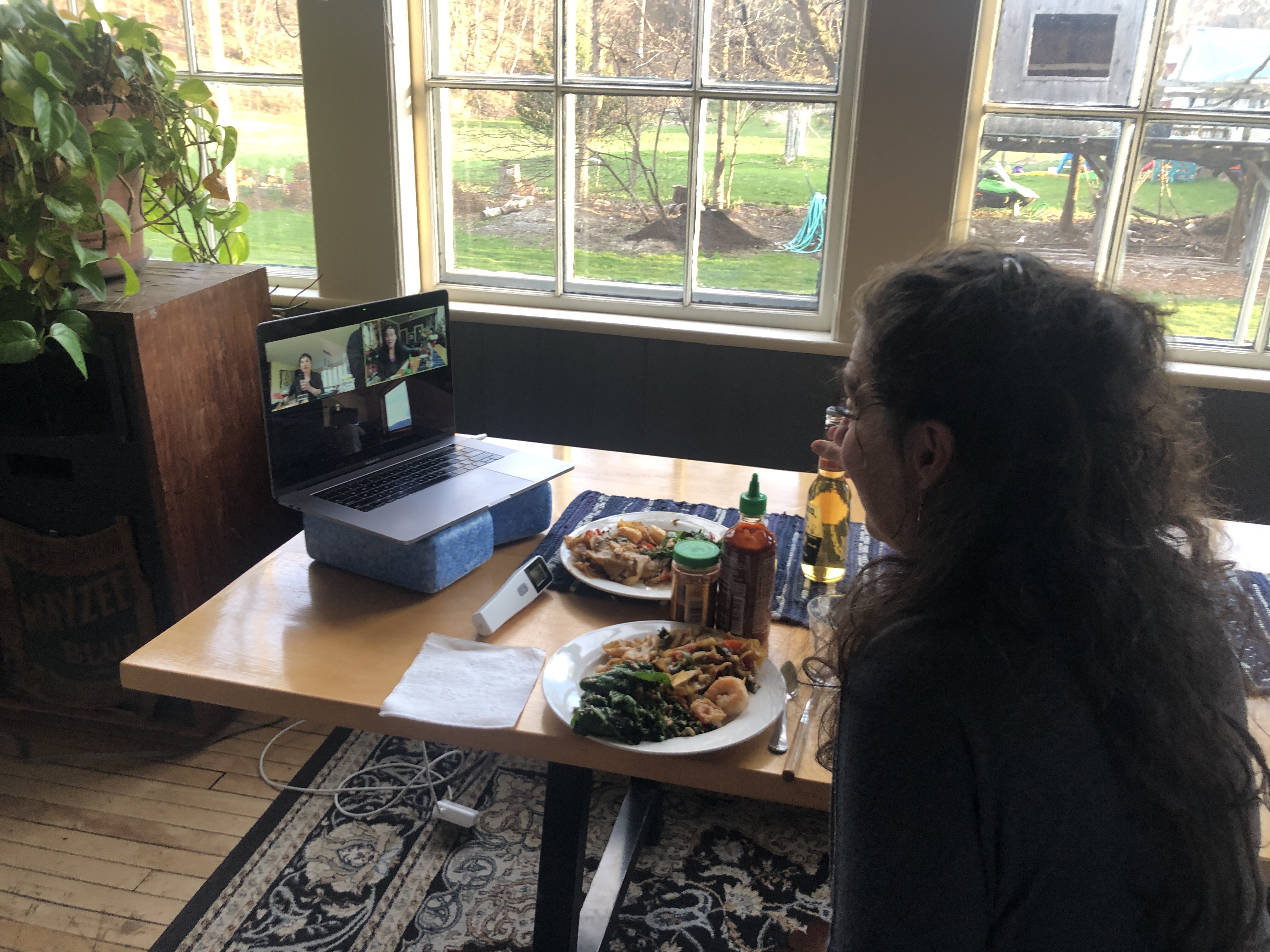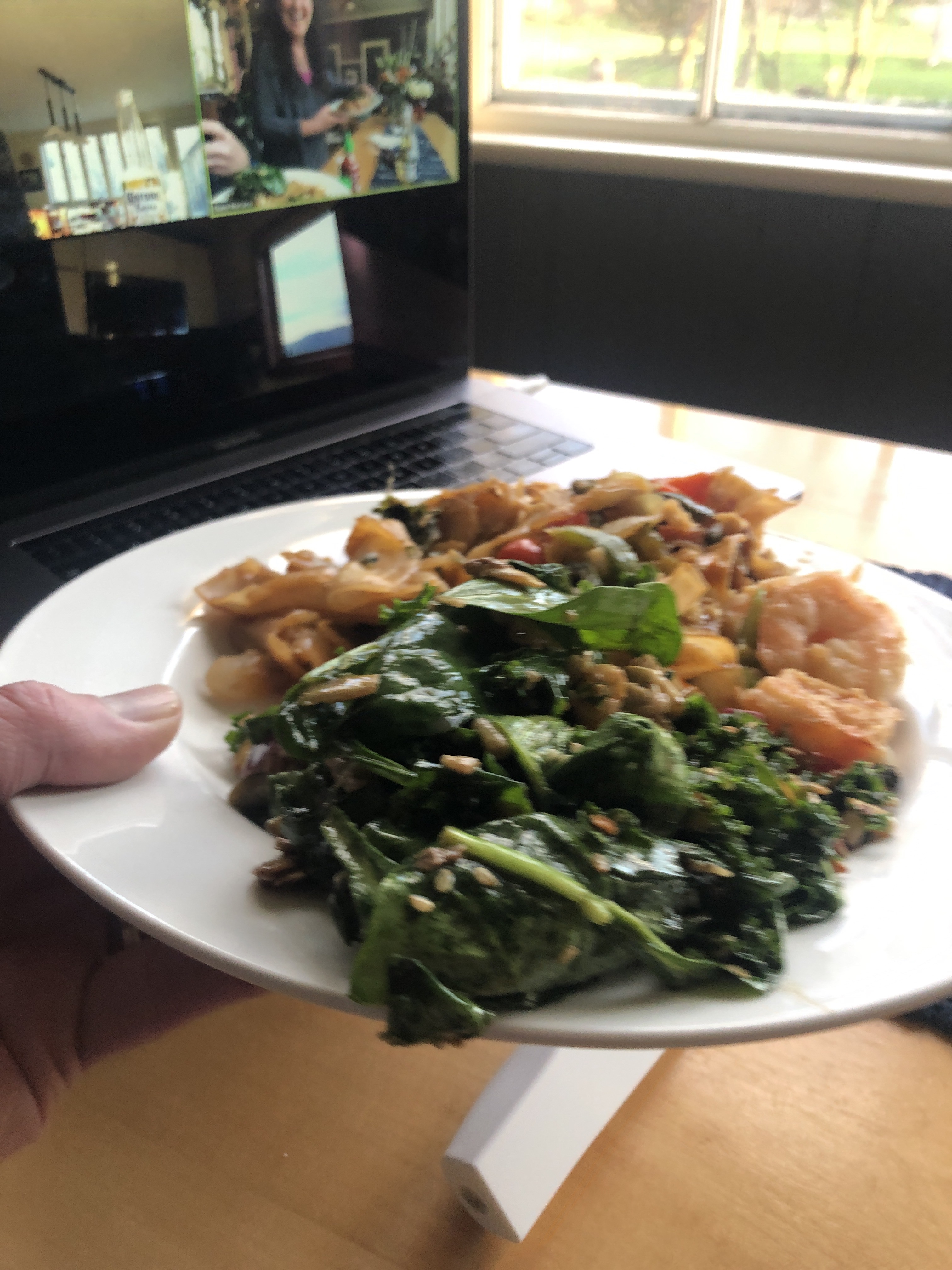 Dinner is always a welcome break… That means I could take a few hours off. Today we had agreed to meet with our friends Deb, AnnMarie and Steve for a “Cinco de Thai-o’ Video dinner. We each agreed to cook pretty much the same thing and eat it together on Zoom. It was really fun. Diane made wonderful drunken noodles and it’s amazing kale salad… It was great just getting together and having some nice fresh spicy food.… We also I’ll drink corona… A little bit of refreshing irony