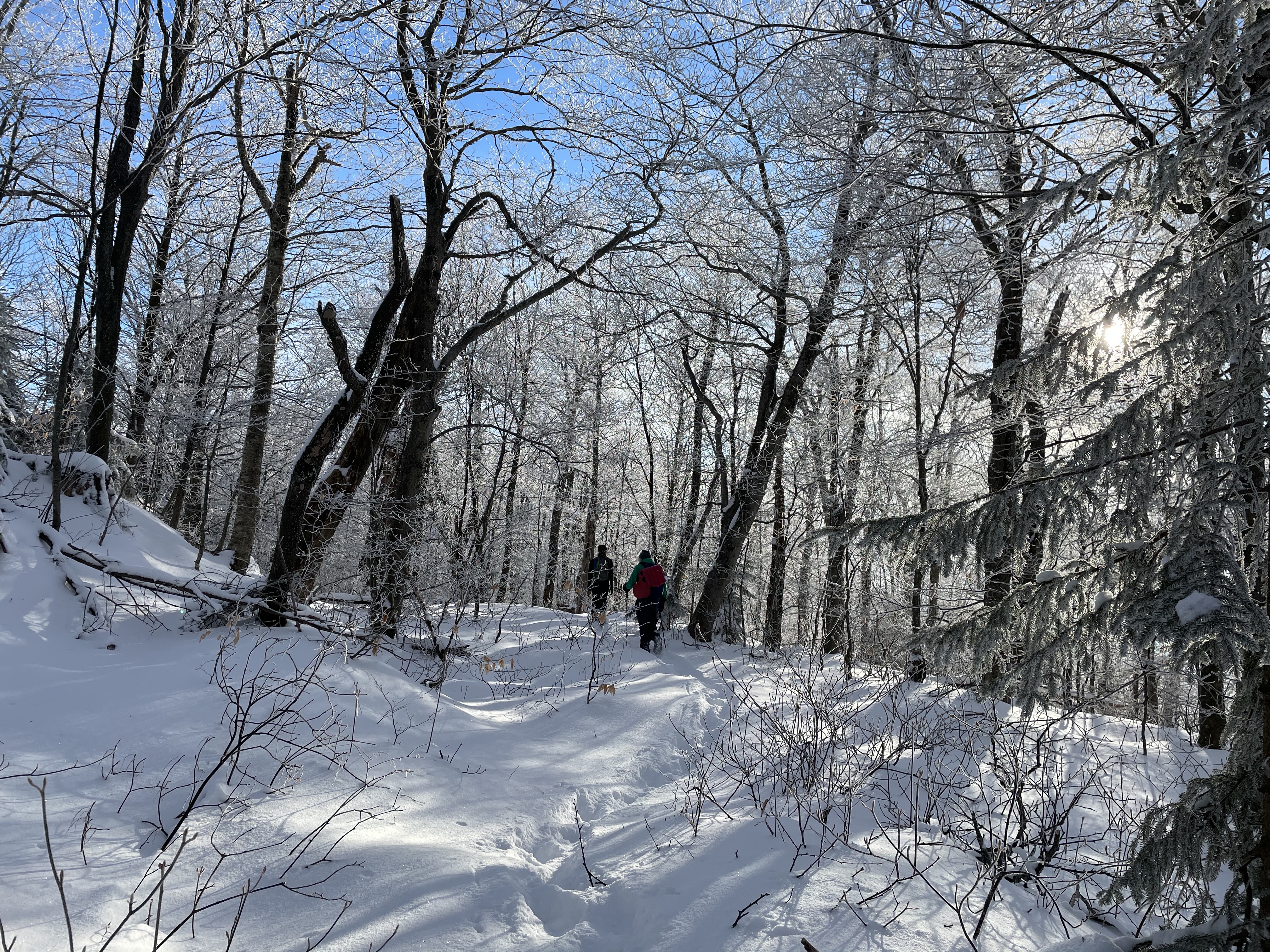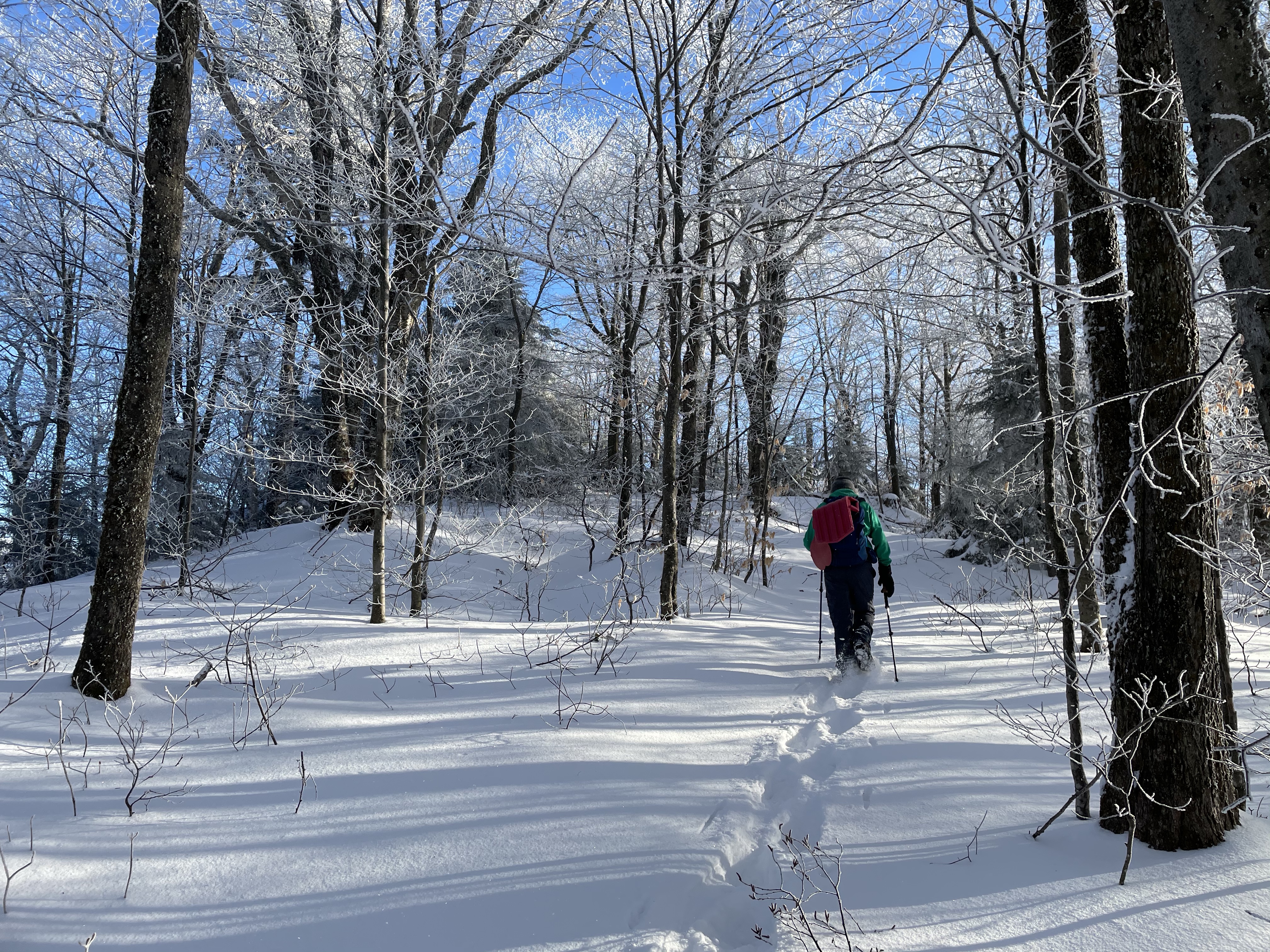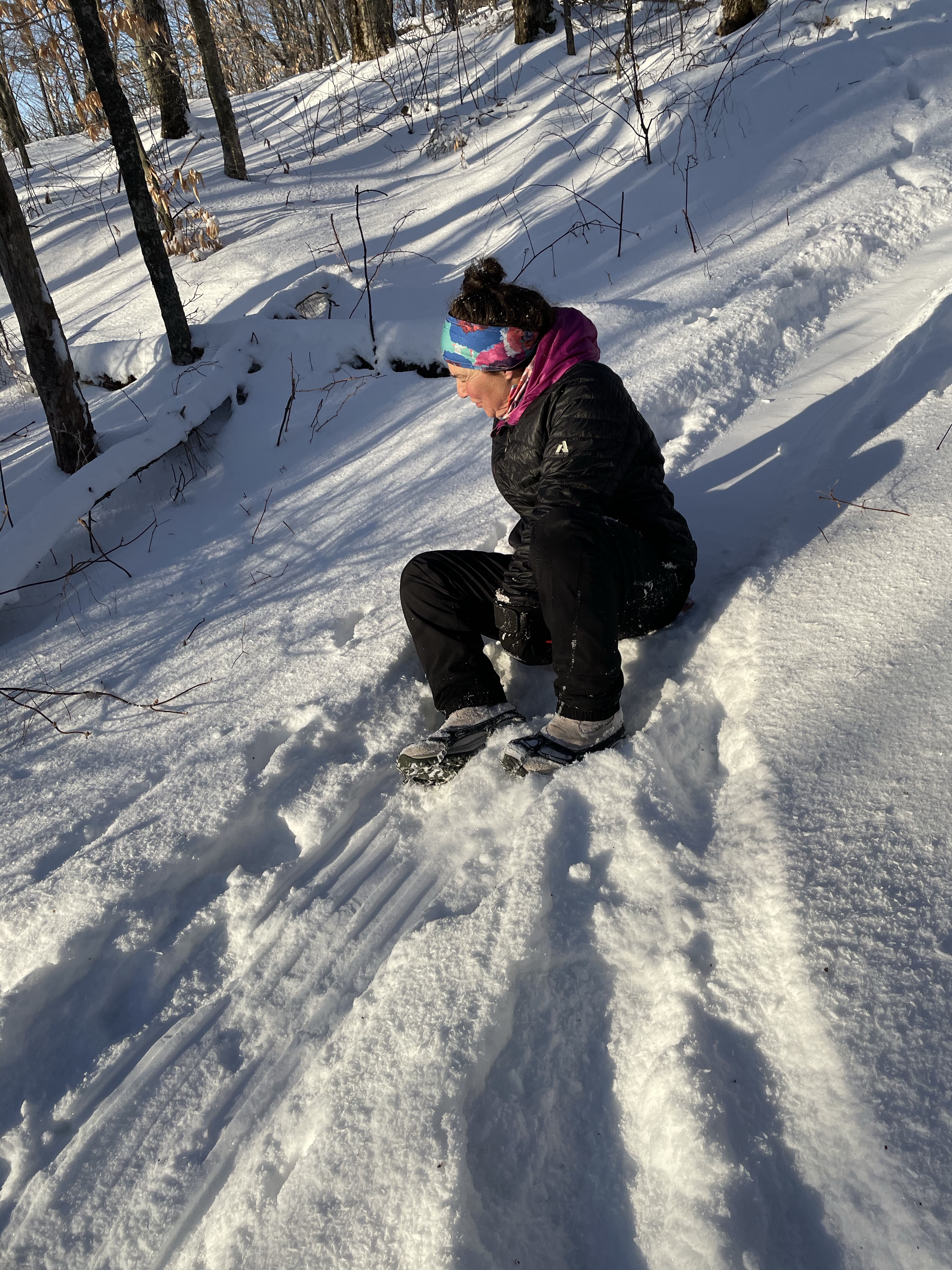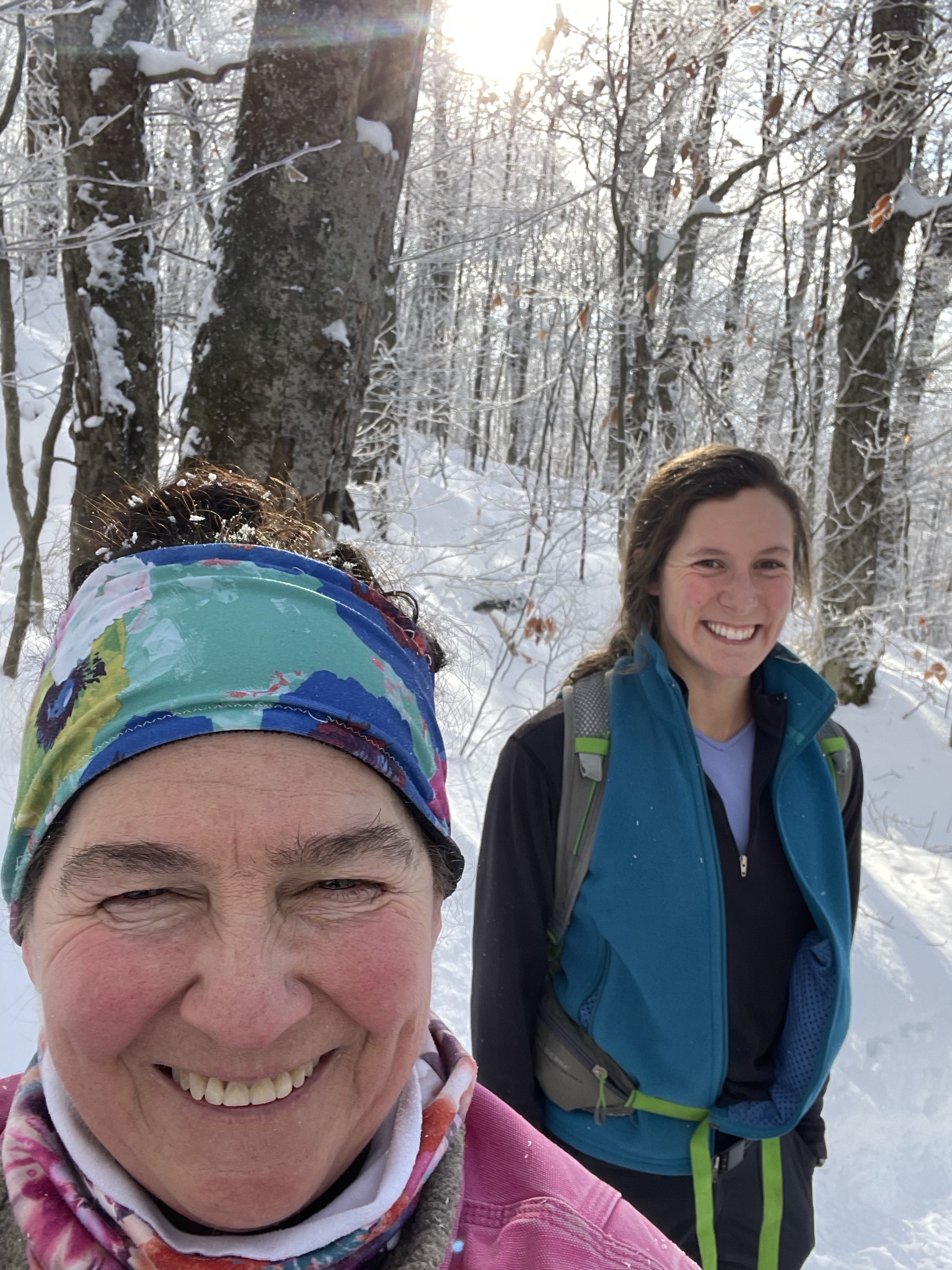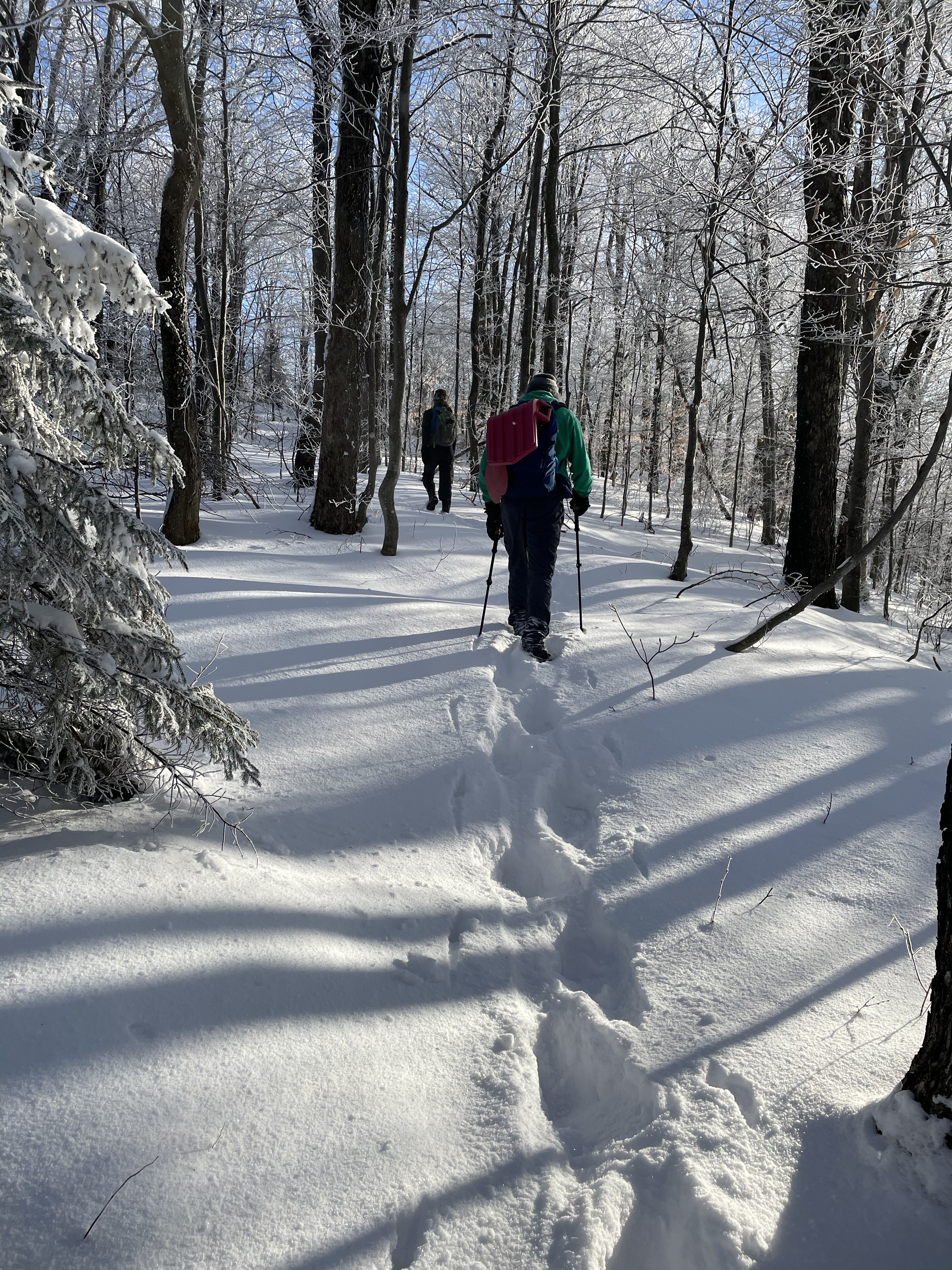 We also took a 6 mile hike . We started up the notch road and hiked up to the long trail on the ridge between notch and Bolton access road . There was more than a foot of snow up there .. much of it fresh tracks , we had two sleds with us which was so fun