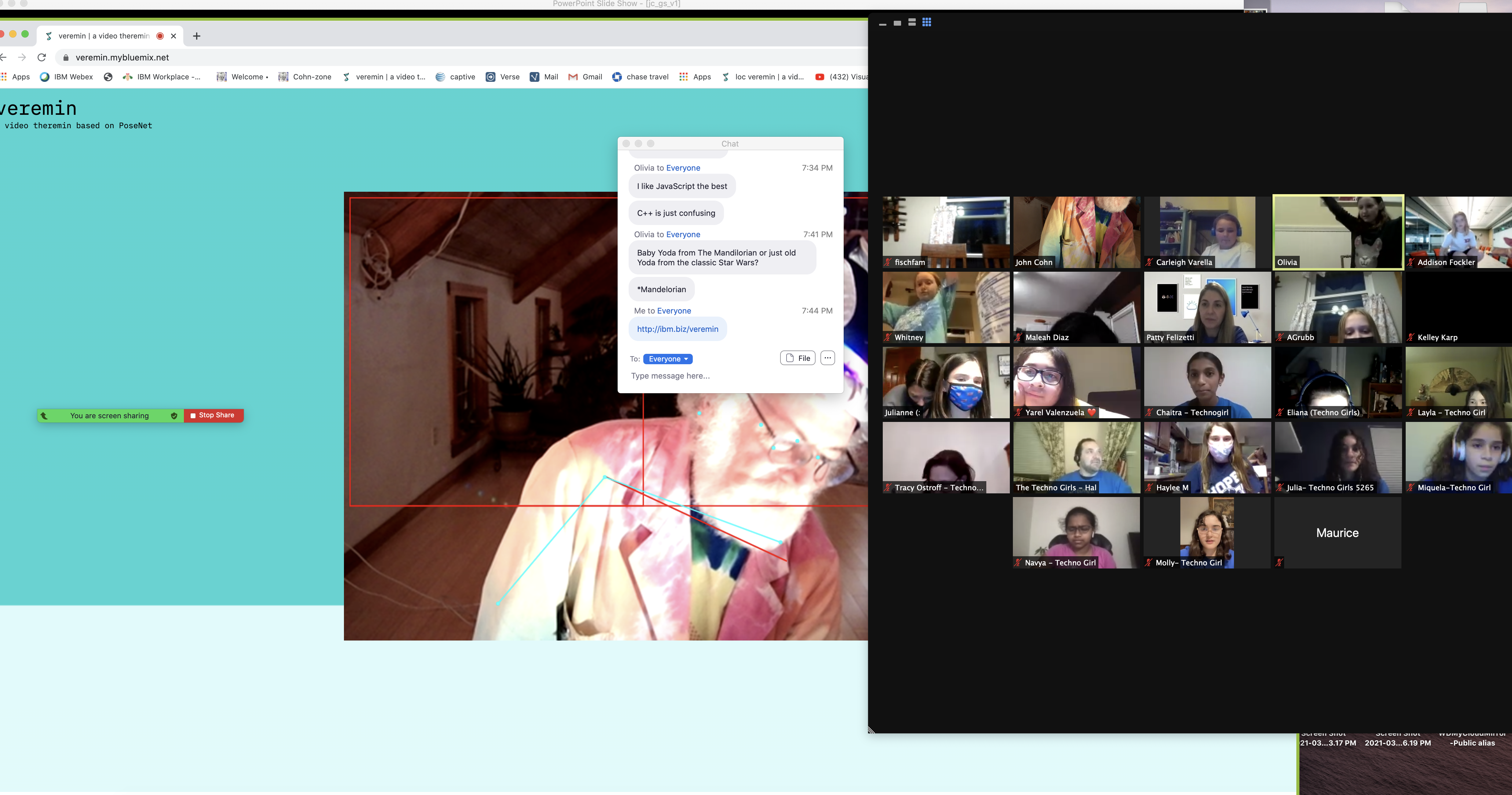 Tonight I had a virtual event for a group of40 Girl Scouts down in Madison Valley New York. I did a short interactive presentation about the vermin the musical theremin device that me and my friend Va created http://ibm.biz/veremin