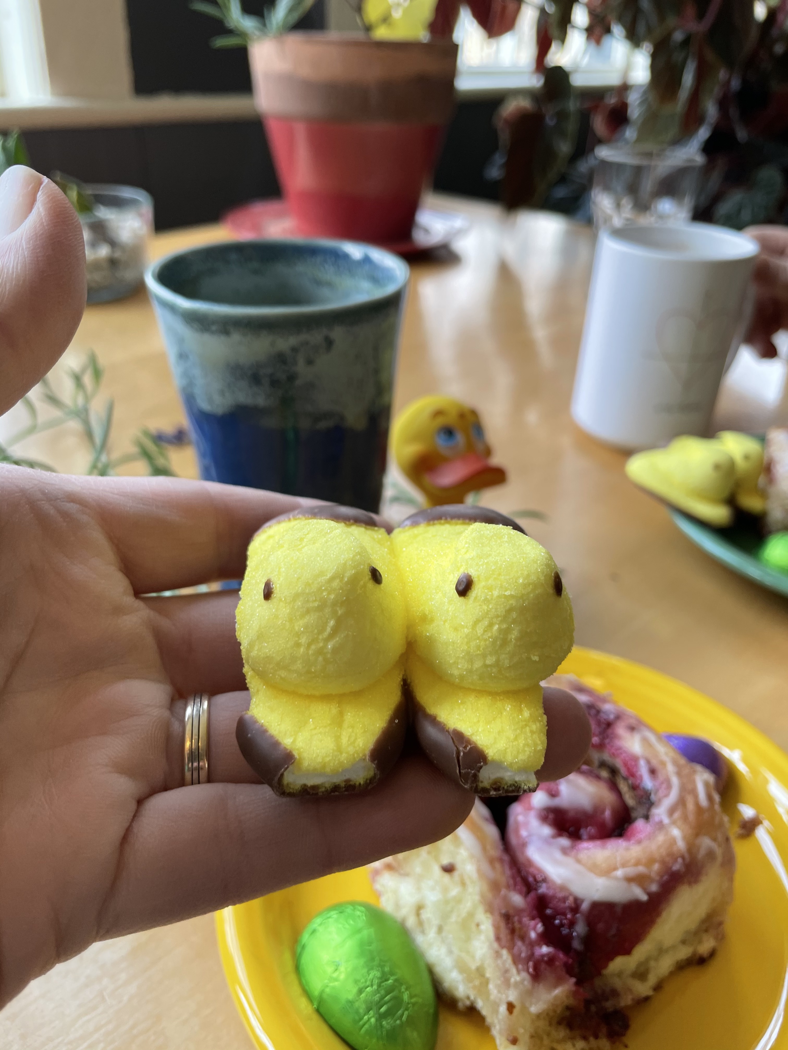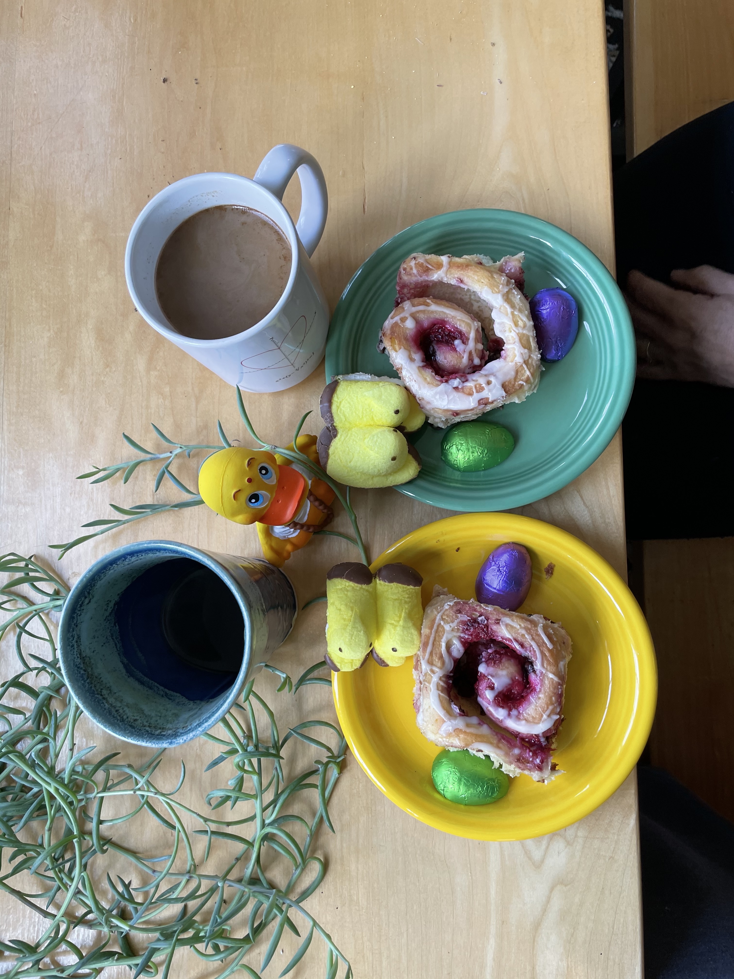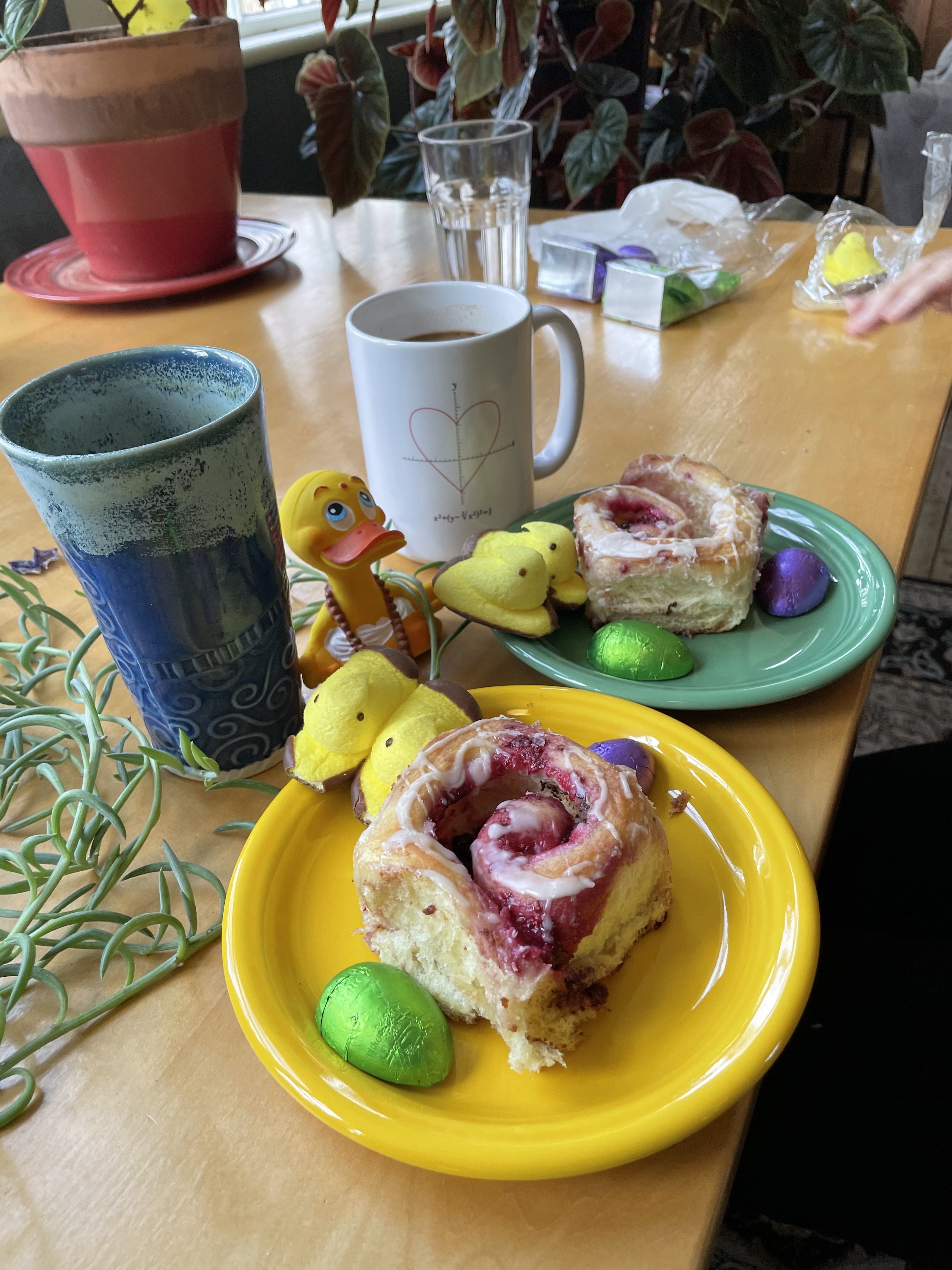 Happy Easter folks… ‘Diane was well prepared. She made cinnamon and chocolate raspberry sticky buns for breakfast today… It was so delicious