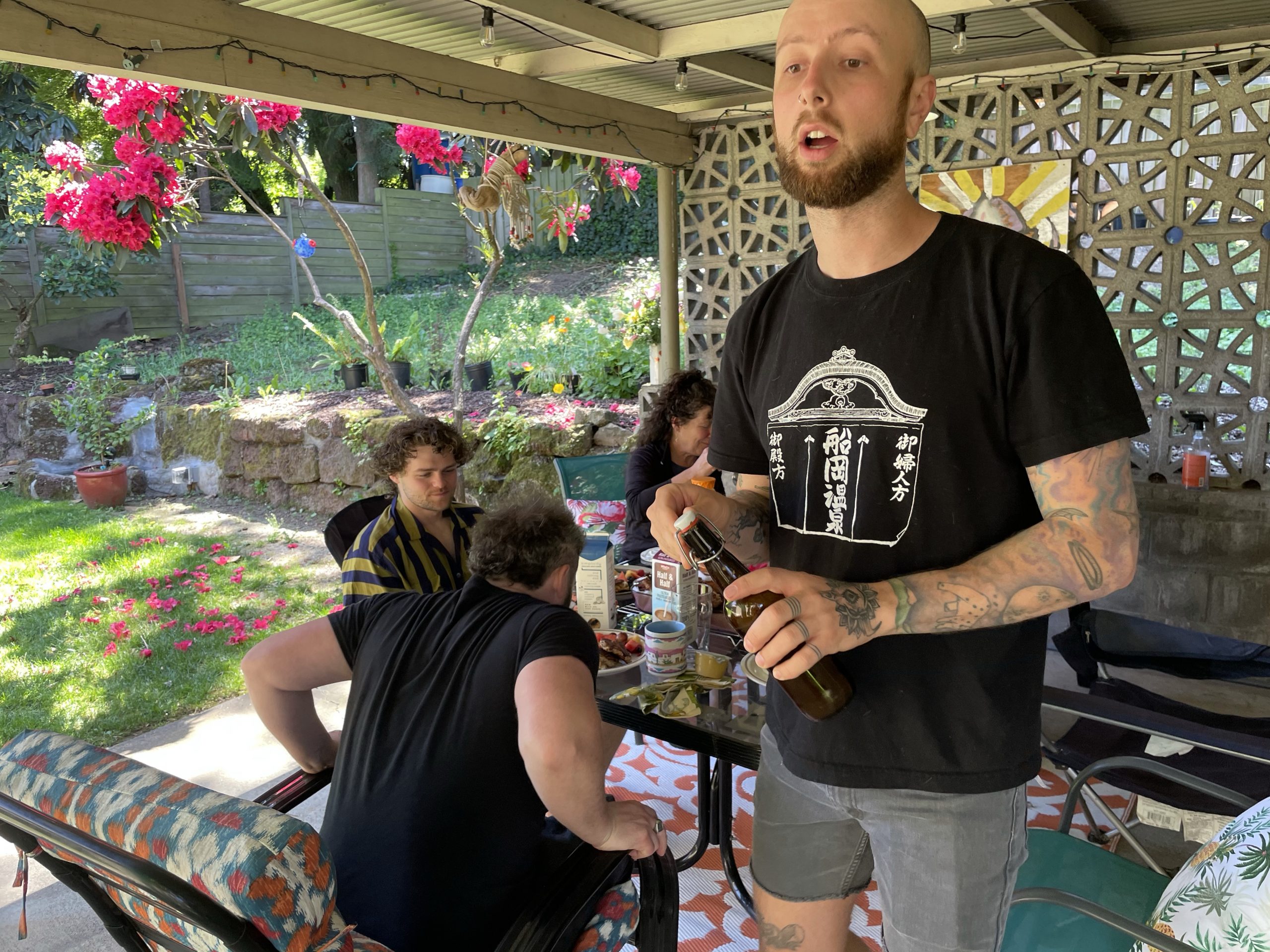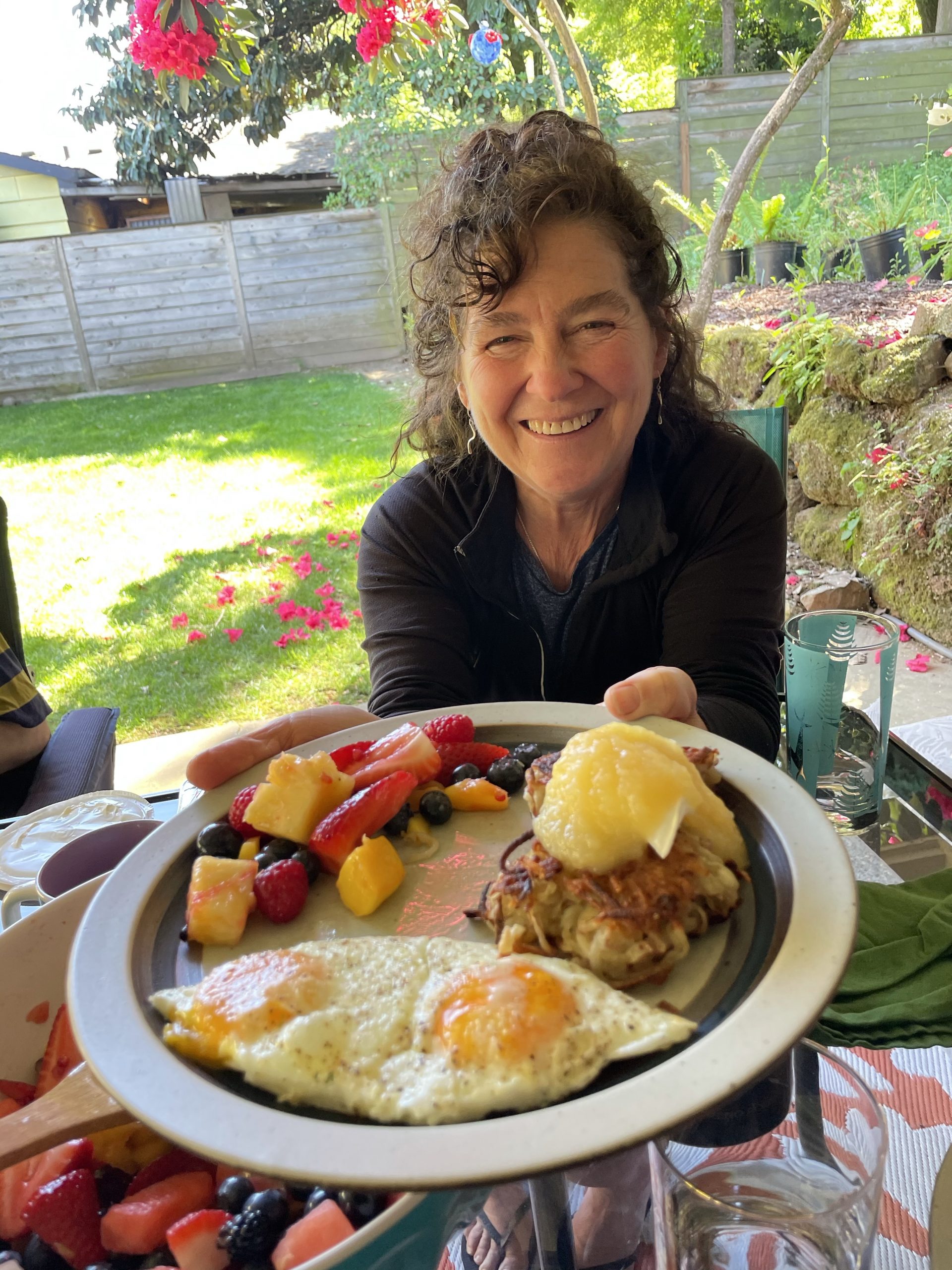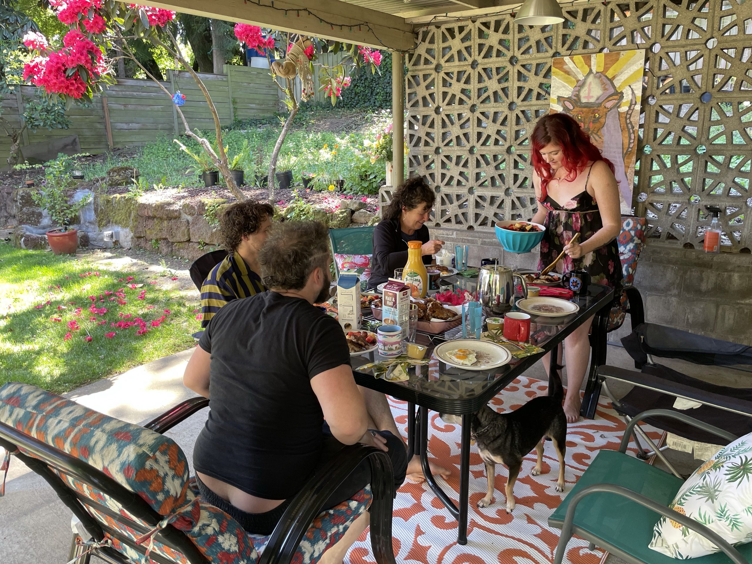 Busy but low stress day here in the rose city. Diane and I walked to the store on the way to Gabe’s and picked up supplies for the day. We got to Hanes in time for a short work out.. the. We walk headed to abbot and Amy’s very cool retro house . It was built in the early 1960/ as an example of the modern all electric home it has electric ceiling heat,. Electric oven and built in electric mixer . They’ve decorated it in exotic retro . It’s such a fun place . They made Latkes with home made hot sauce .. really yummy. We also got to see their dog Ripley