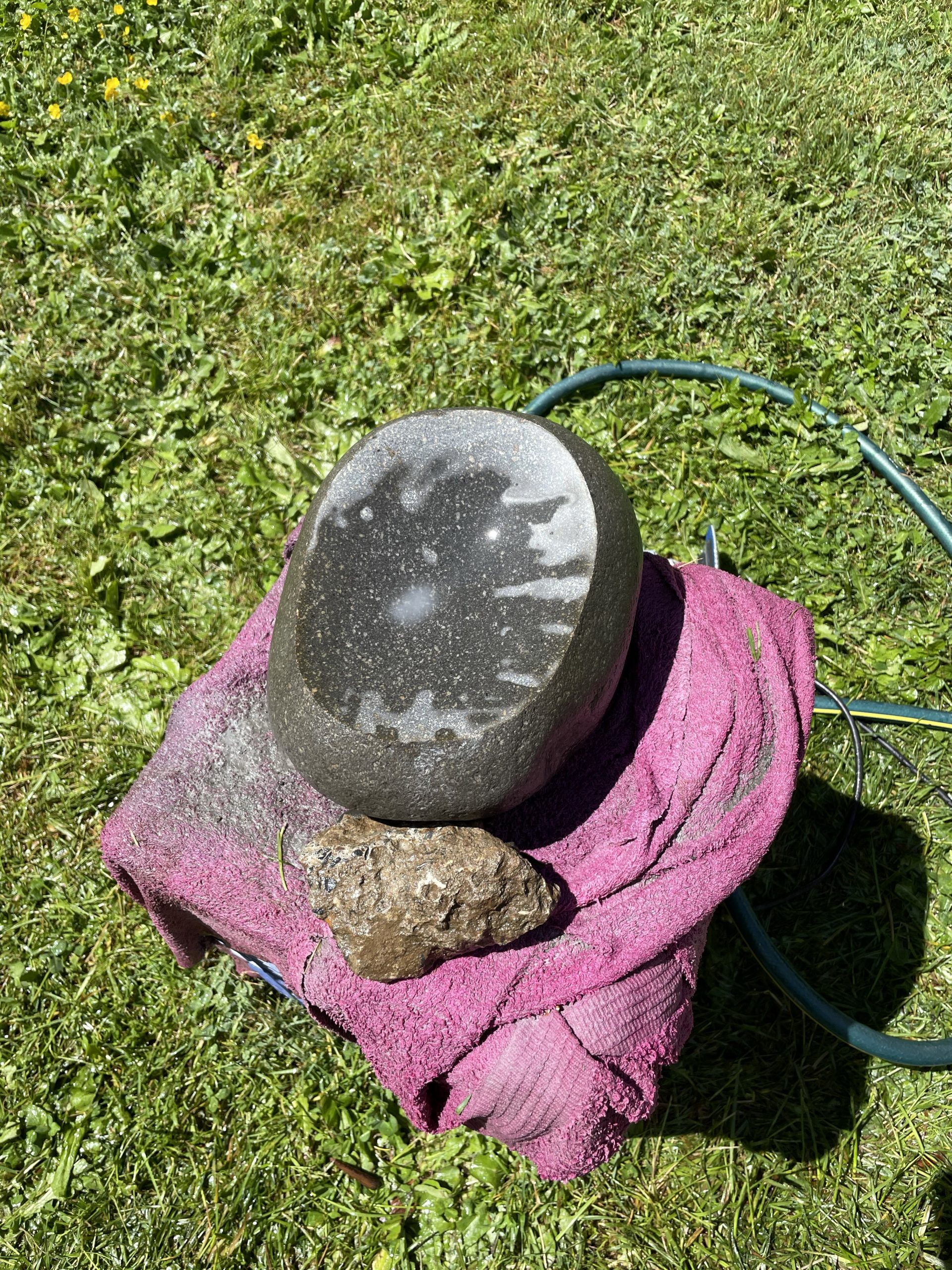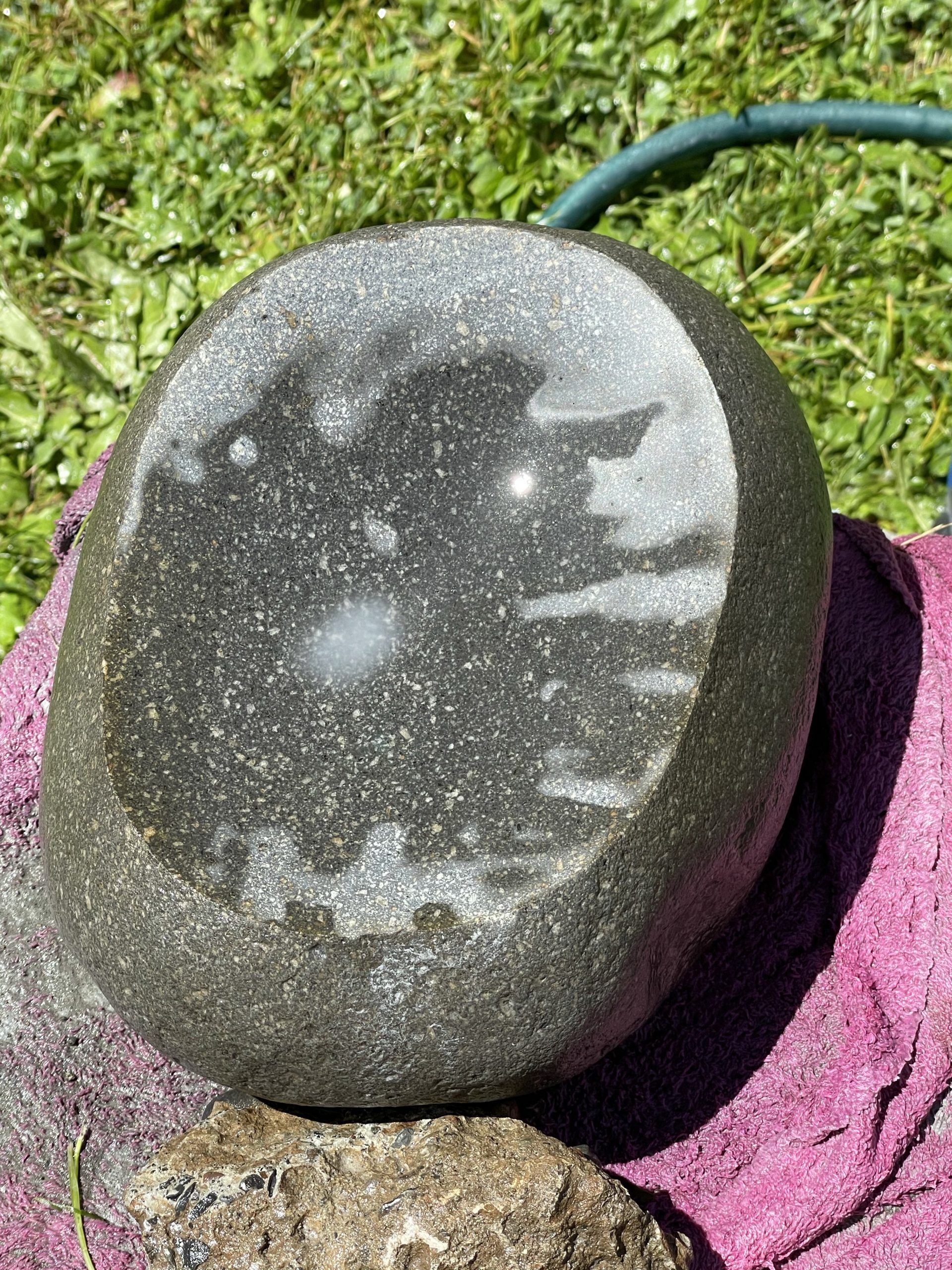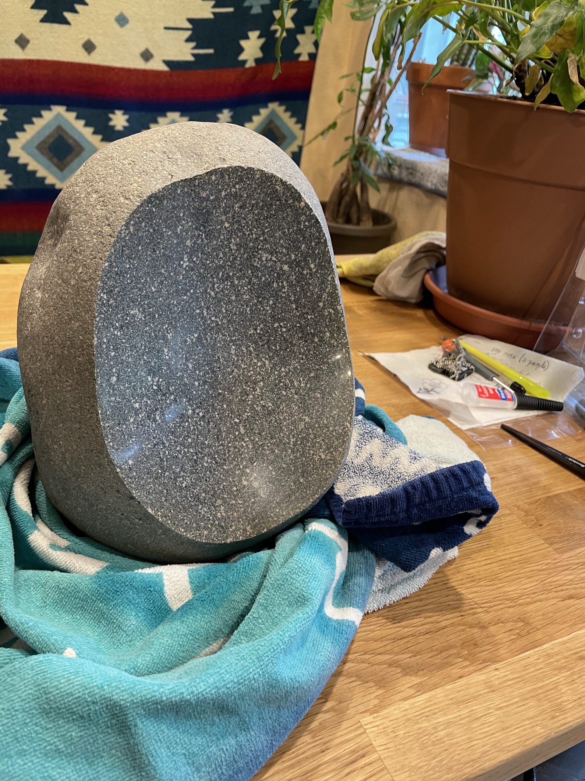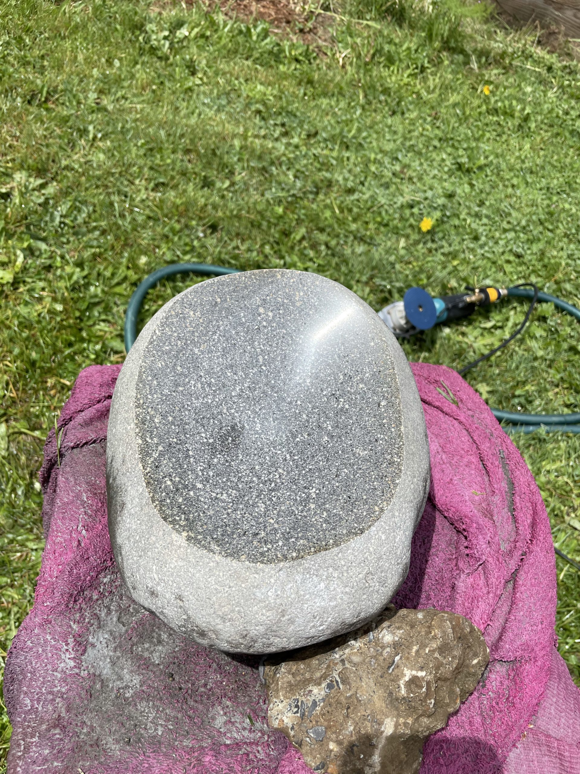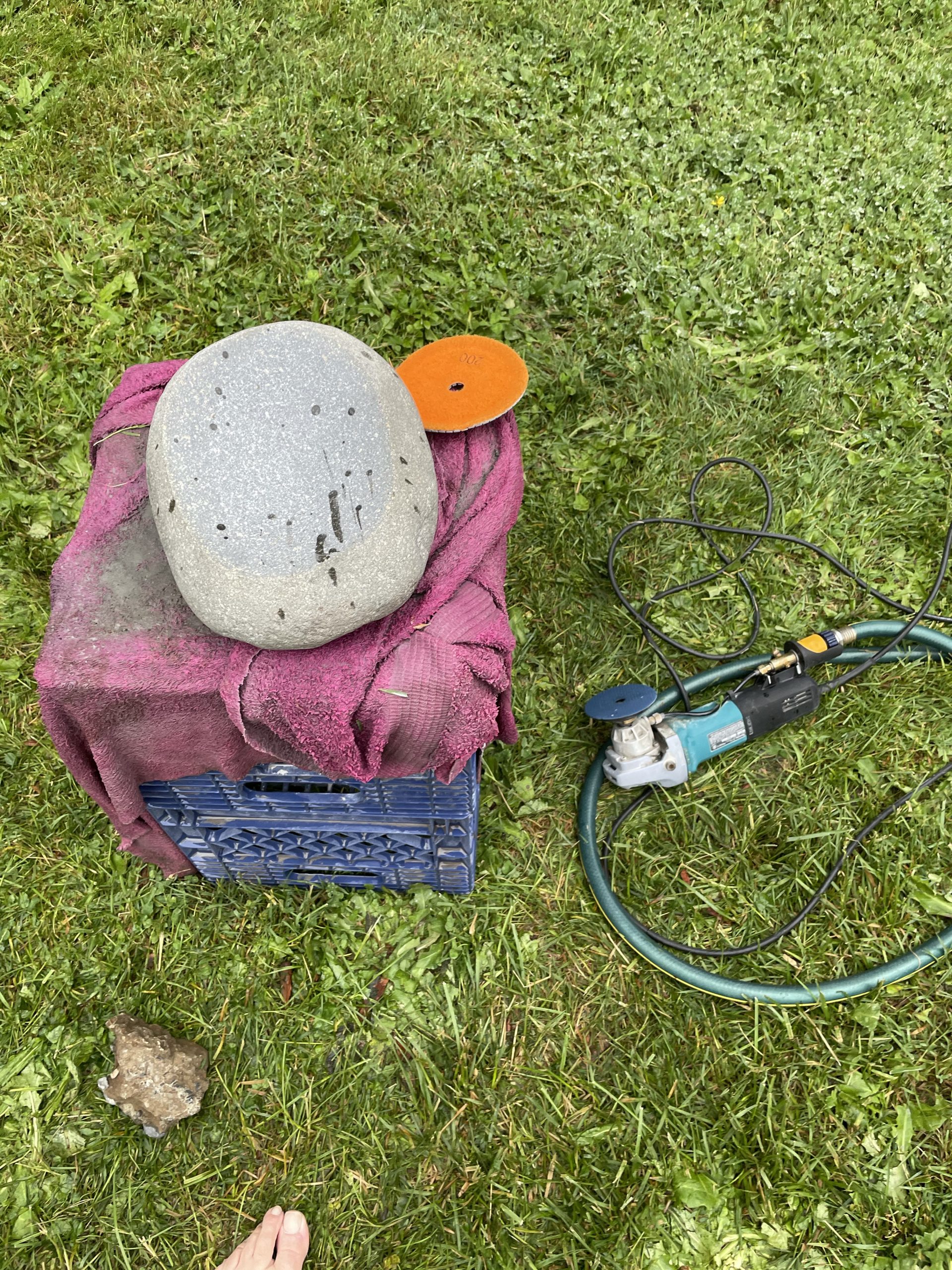 One of the high points of the trip… Beyond just being with family… Was the game taught me to cut, grind and polished stone. I made my first bear birdbath under his expert tutelage.… First I had to find the right stone… Then I had to crisscross it with cuts from a diamond cut off wheel. From that I had to knock The things I cut out with a rock chisel and hammer… To basically shape the rough parts of a bowl. From that I used a 30 grade diamond grinding bit to take down all the roughness that the chiseling have left. From that point it was a progression of 100 to 200 to 500 to 1000 to 1500 to 3000 to buffing Using a water cooled electric grinder…