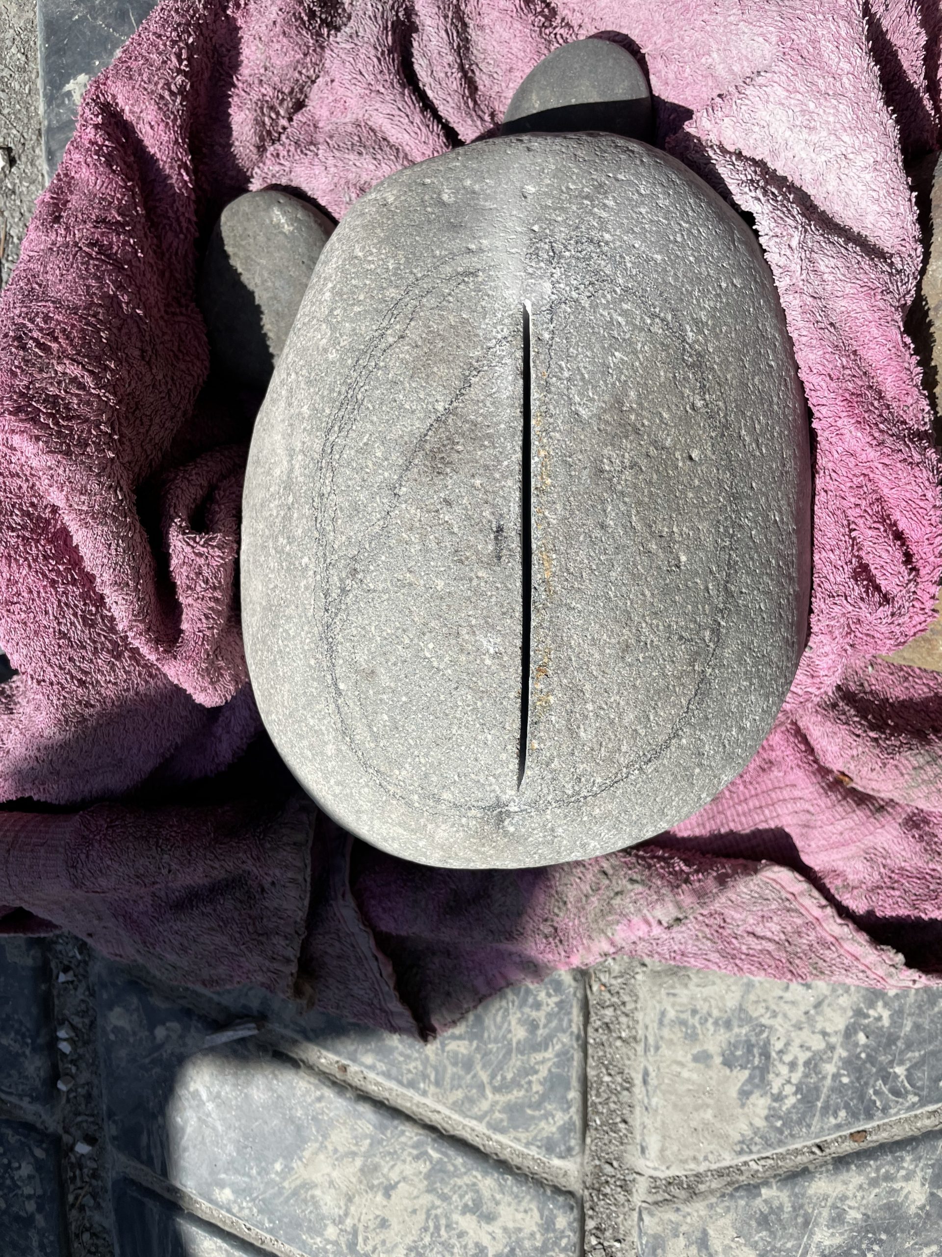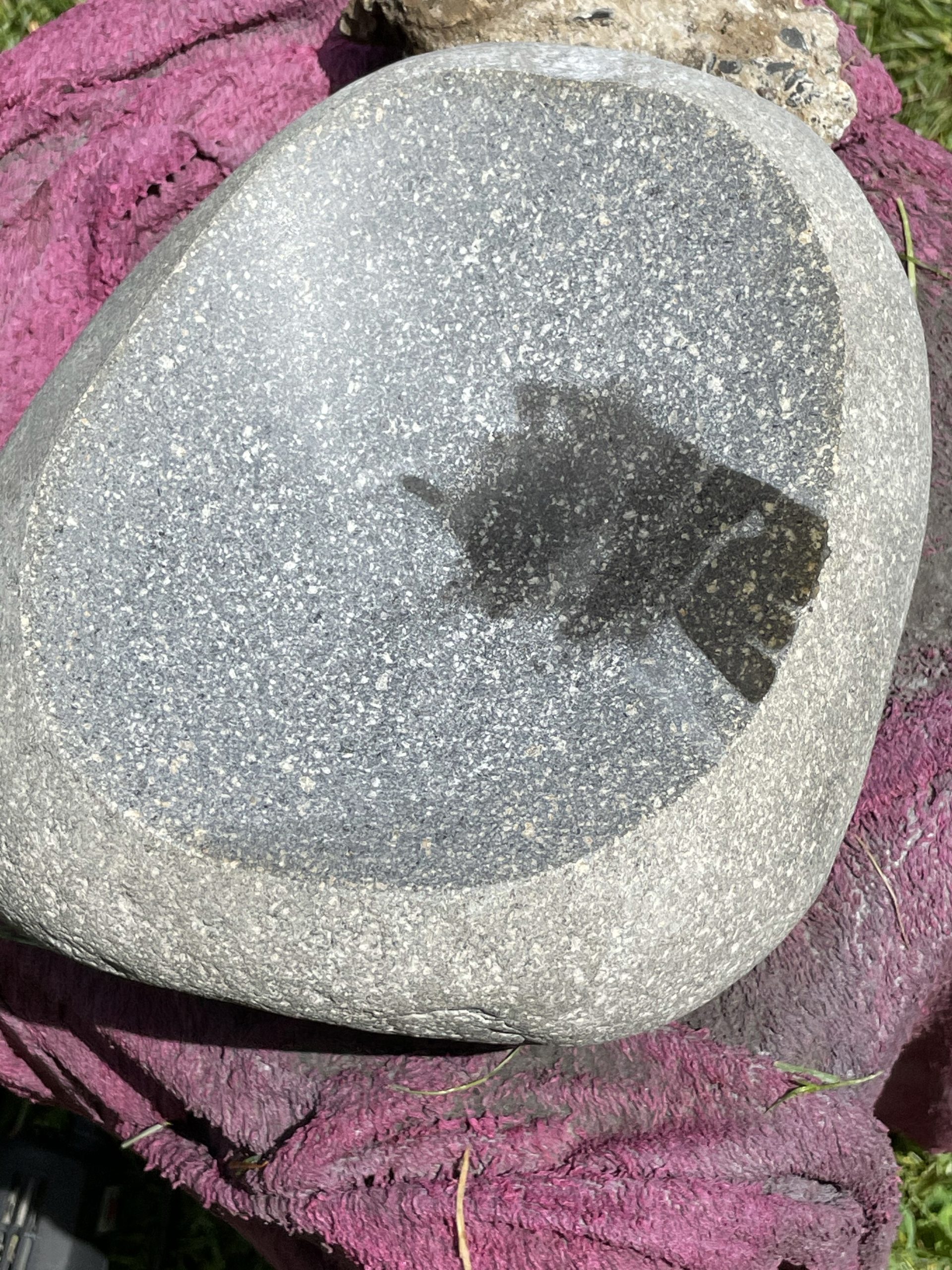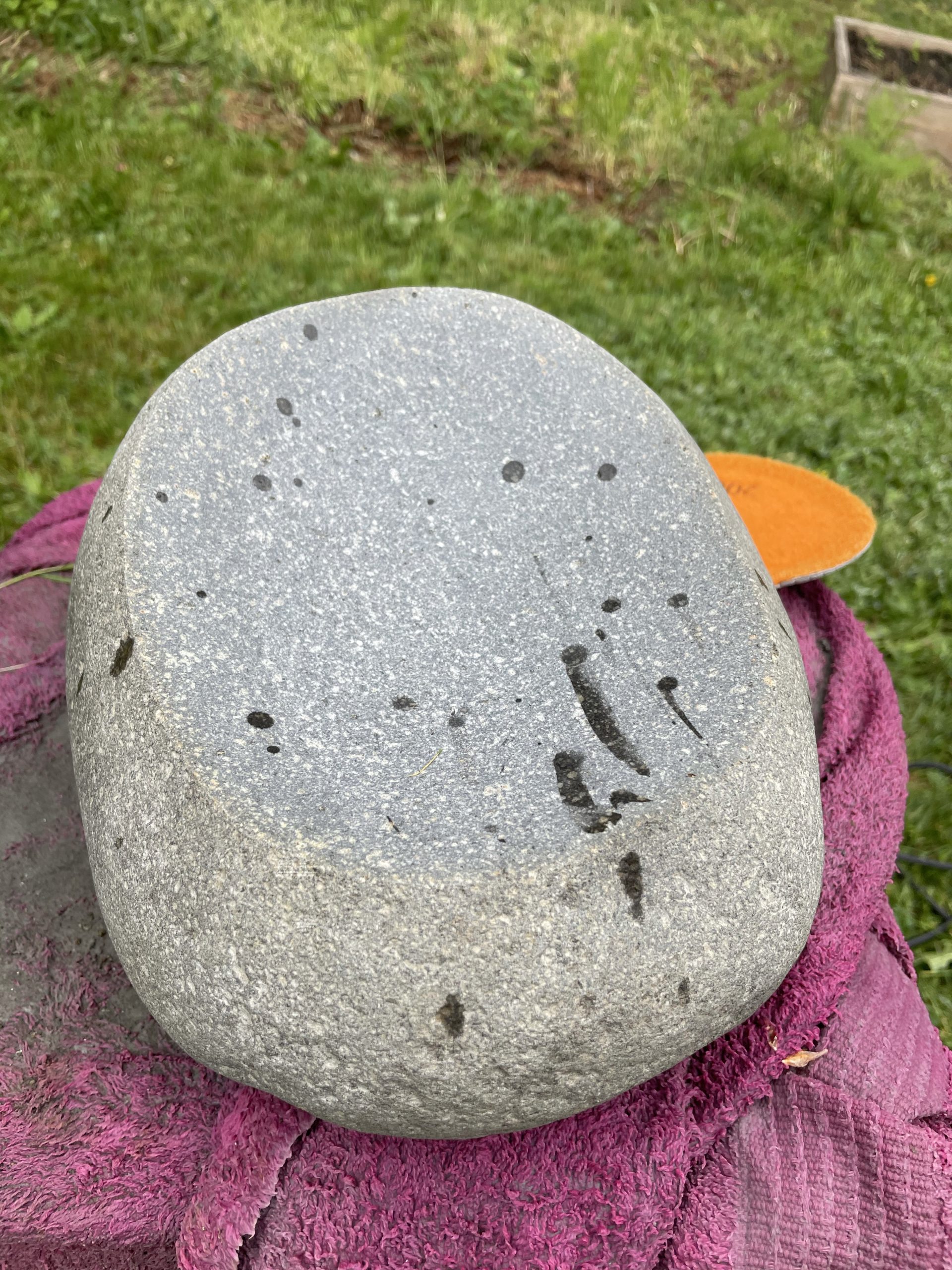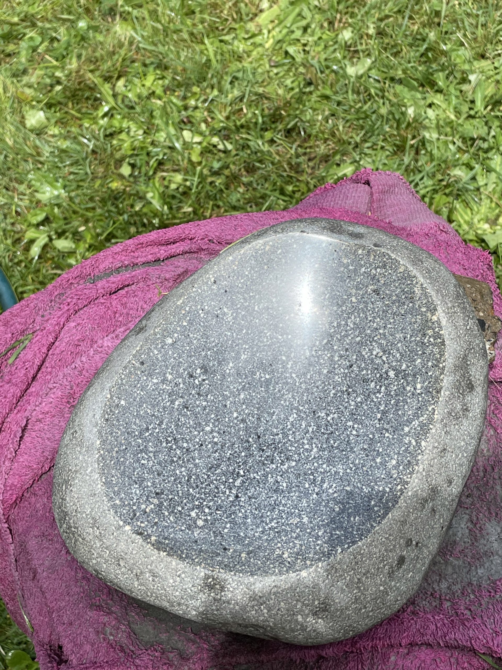One of the high points of the trip… Beyond just being with family… Was the game taught me to cut, grind and polished stone. I made my first bear birdbath under his expert tutelage.… First I had to find the right stone… Then I had to crisscross it with cuts from a diamond cut off wheel. From that I had to knock The things I cut out with a rock chisel and hammer… To basically shape the rough parts of a bowl. From that I used a 30 grade diamond grinding bit to take down all the roughness that the chiseling have left. From that point it was a progression of 100 to 200 to 500 to 1000 to 1500 to 3000 to buffing Using a water cooled electric grinder…