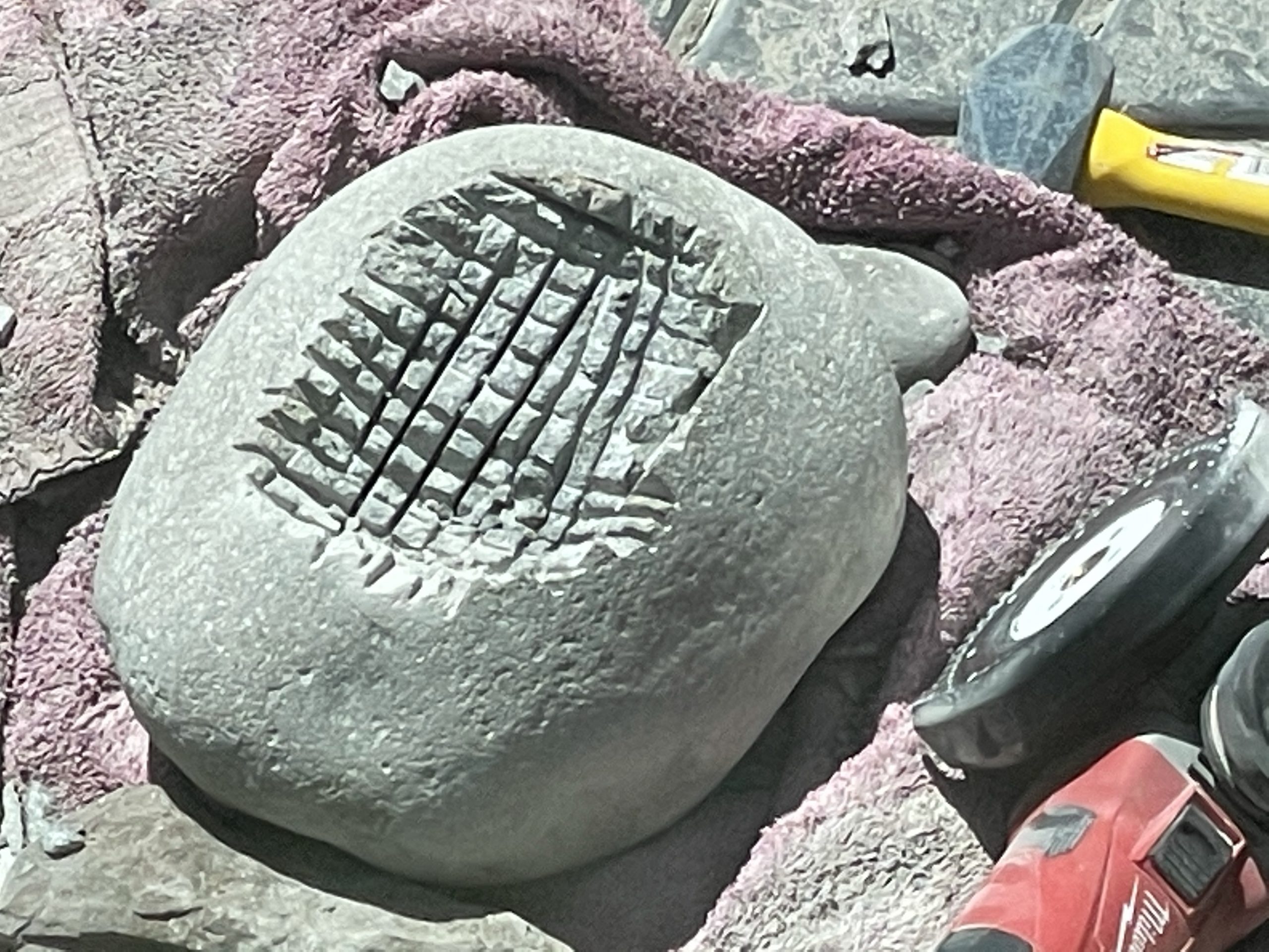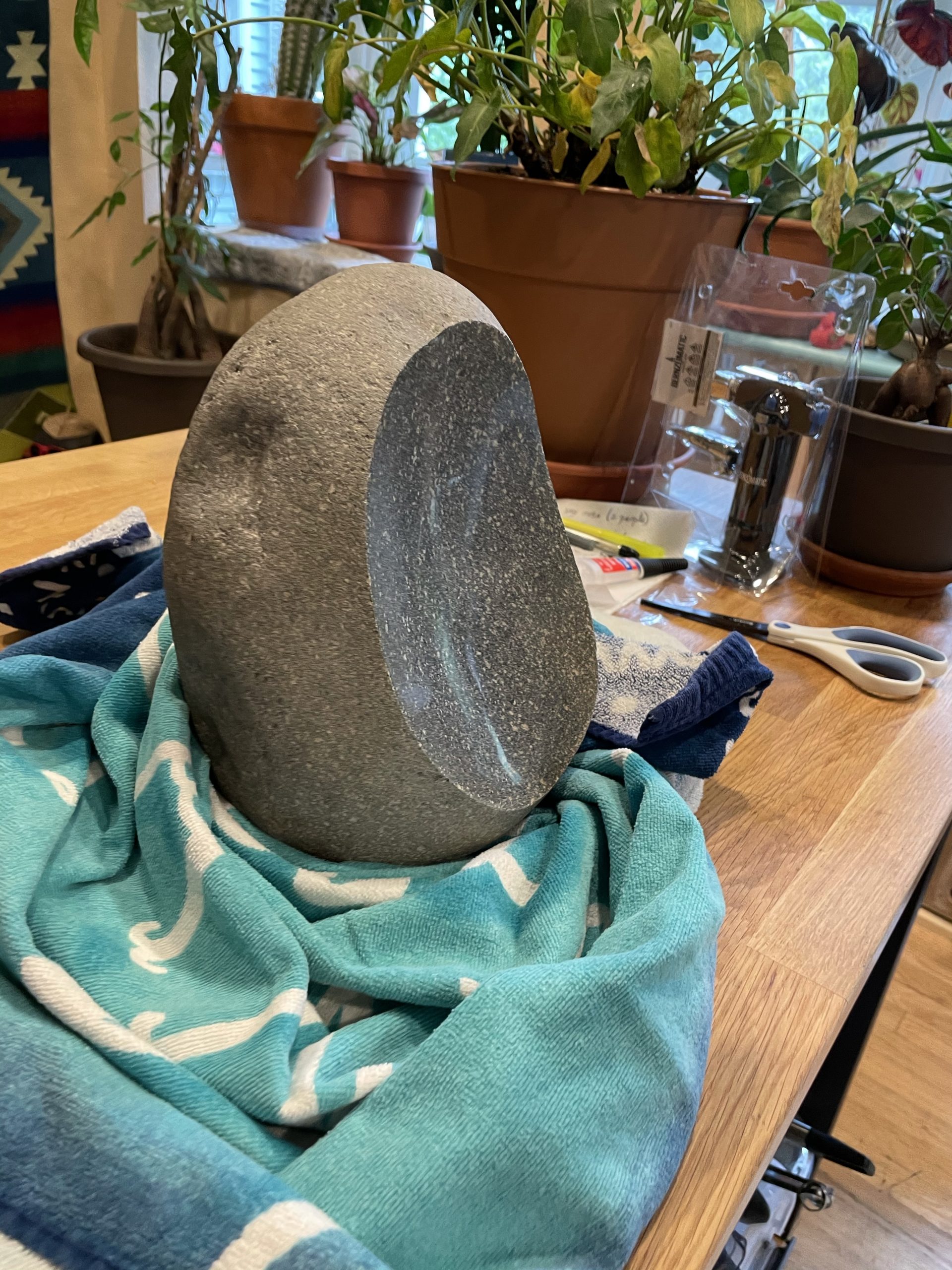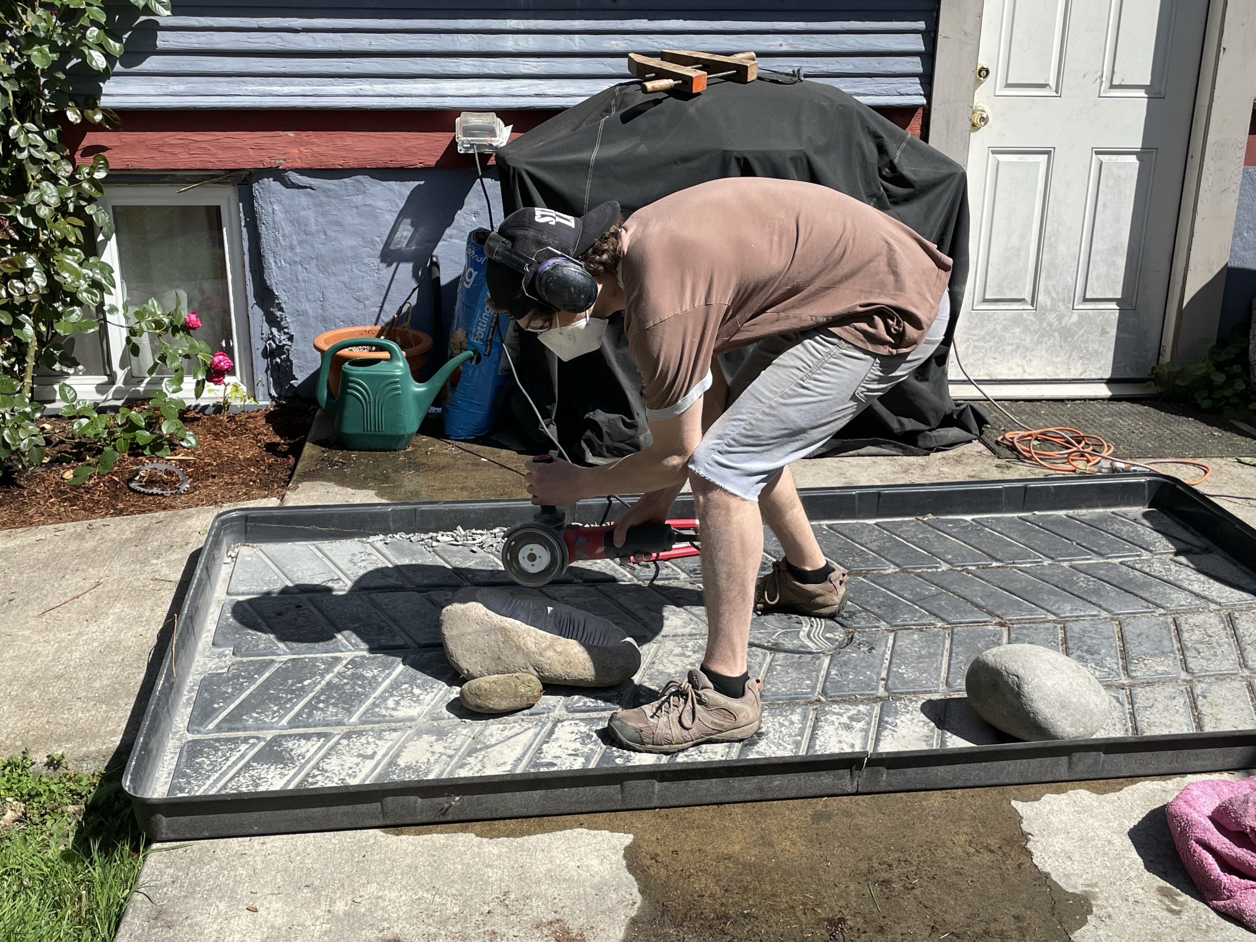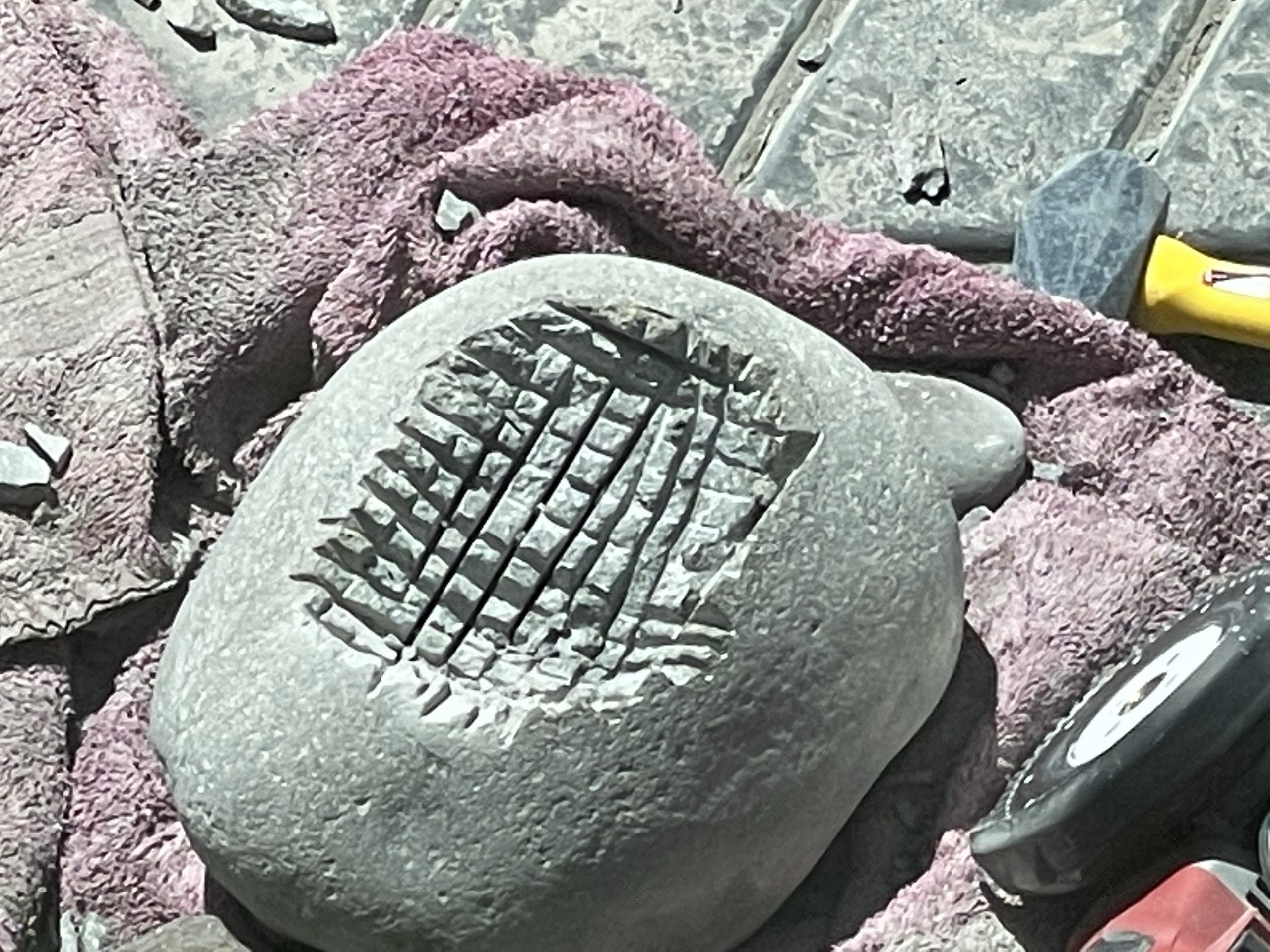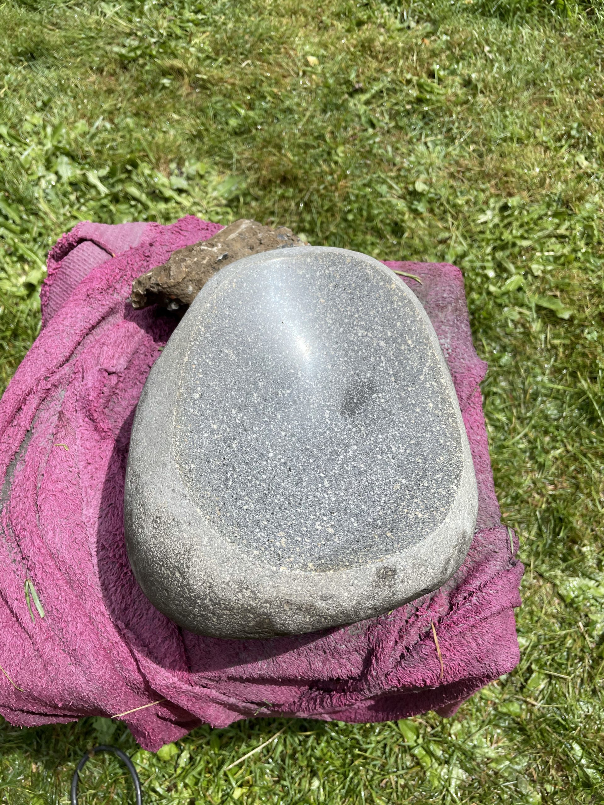 One of the high points of the trip… Beyond just being with family… Was the game taught me to cut, grind and polished stone. I made my first bear birdbath under his expert tutelage.… First I had to find the right stone… Then I had to crisscross it with cuts from a diamond cut off wheel. From that I had to knock The things I cut out with a rock chisel and hammer… To basically shape the rough parts of a bowl. From that I used a 30 grade diamond grinding bit to take down all the roughness that the chiseling have left. From that point it was a progression of 100 to 200 to 500 to 1000 to 1500 to 3000 to buffing Using a water cooled electric grinder…