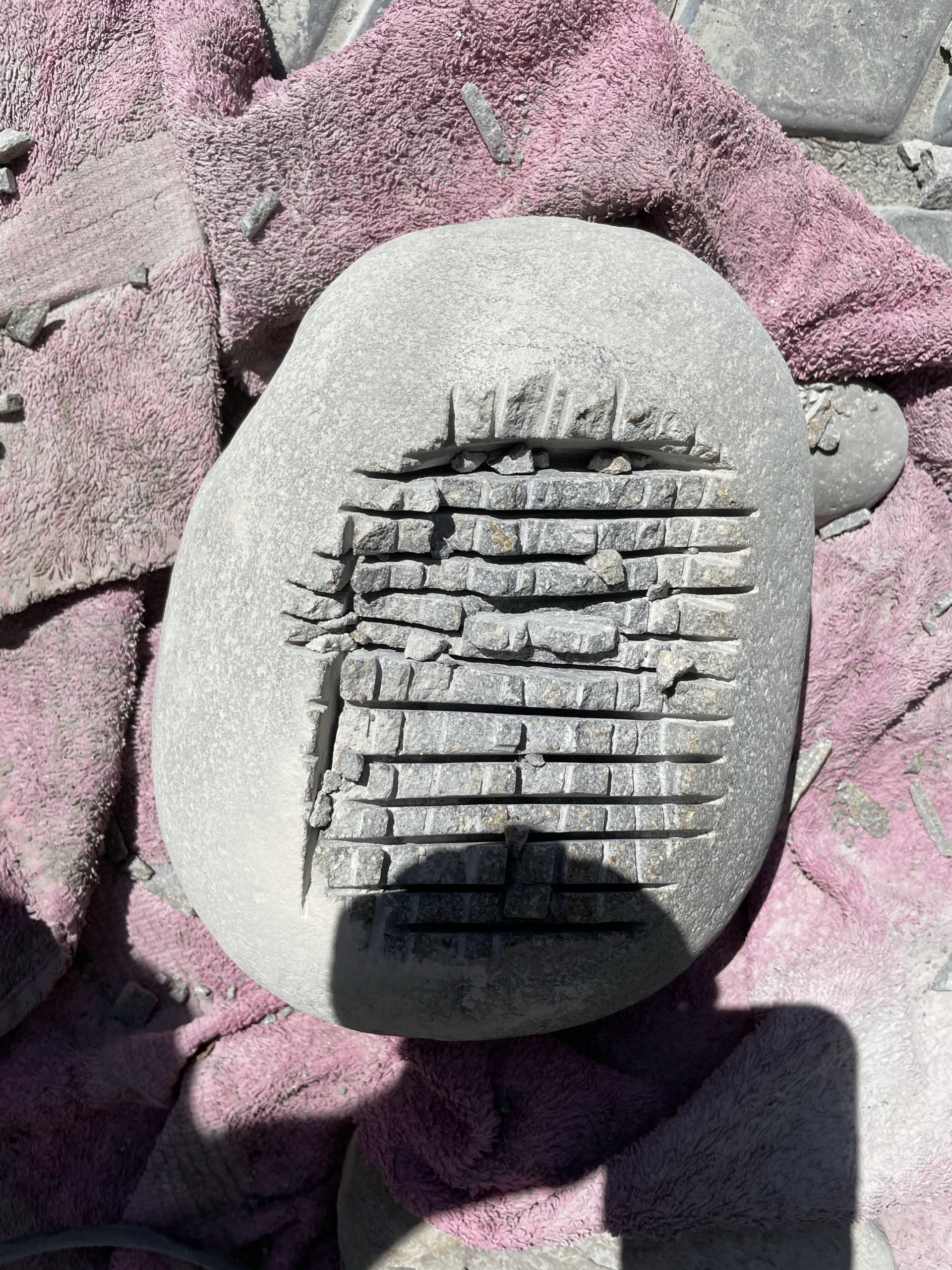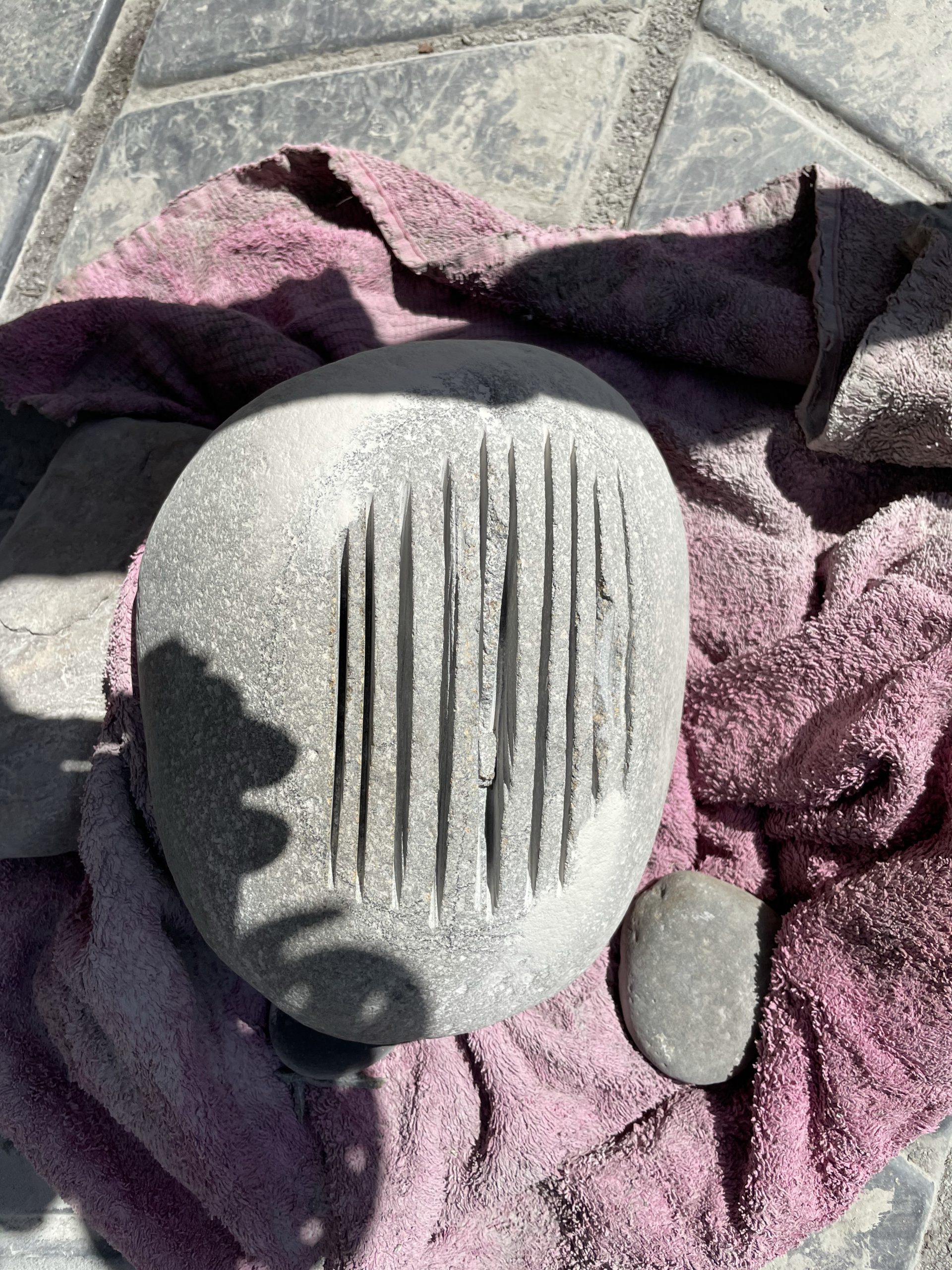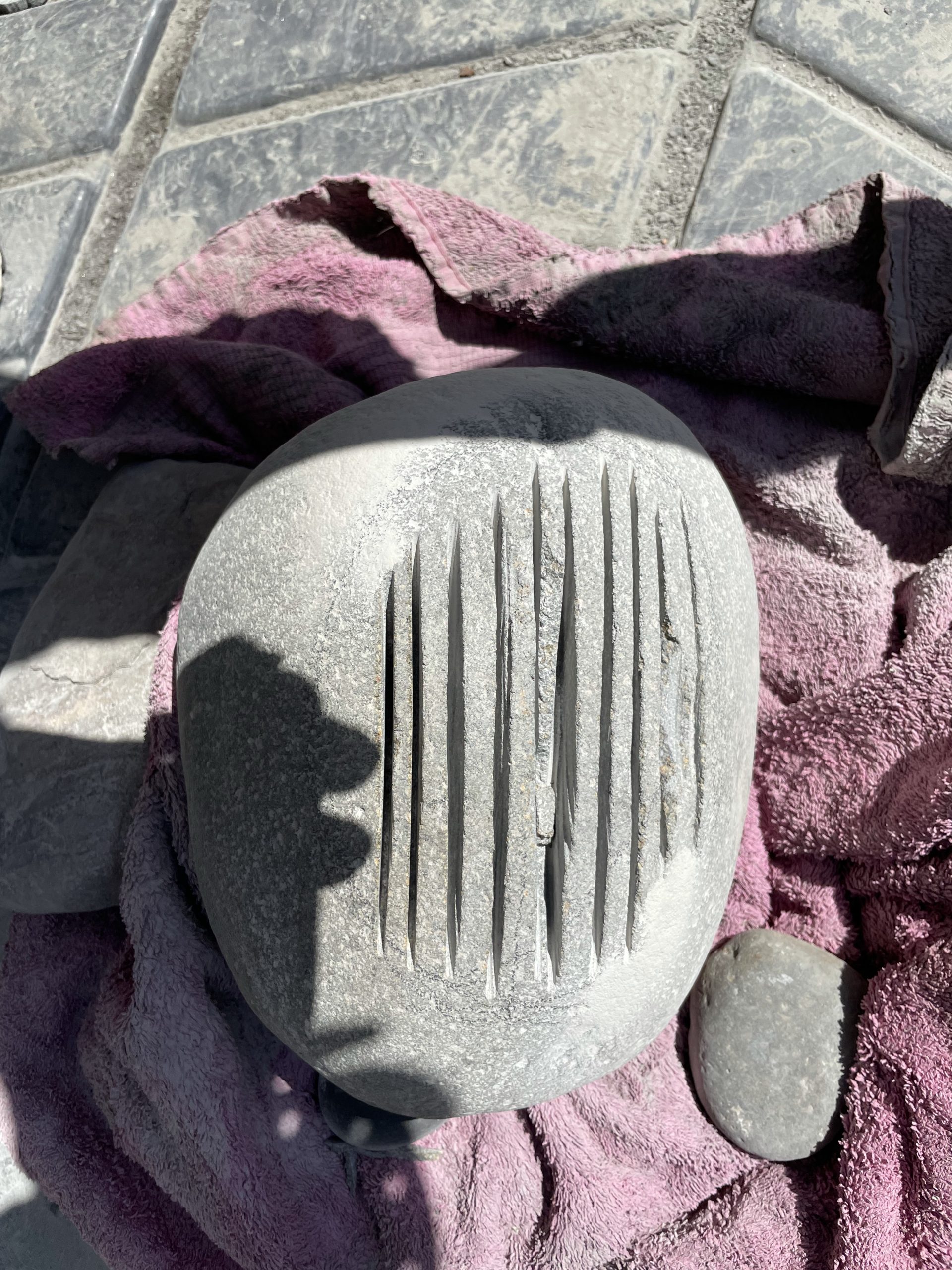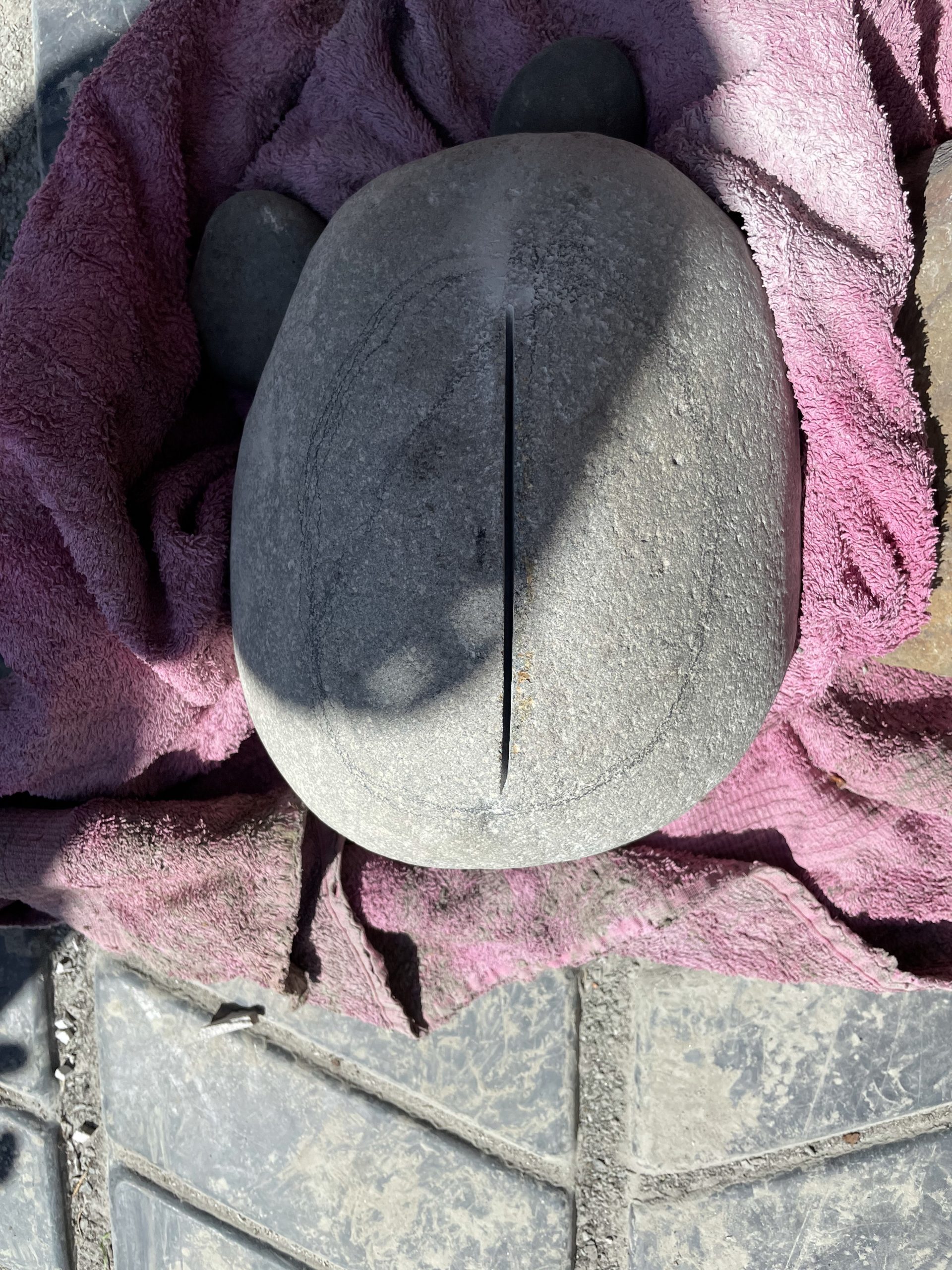 One of the high points of the trip… Beyond just being with family… Was the game taught me to cut, grind and polished stone. I made my first bear birdbath under his expert tutelage.… First I had to find the right stone… Then I had to crisscross it with cuts from a diamond cut off wheel. From that I had to knock The things I cut out with a rock chisel and hammer… To basically shape the rough parts of a bowl. From that I used a 30 grade diamond grinding bit to take down all the roughness that the chiseling have left. From that point it was a progression of 100 to 200 to 500 to 1000 to 1500 to 3000 to buffing Using a water cooled electric grinder…