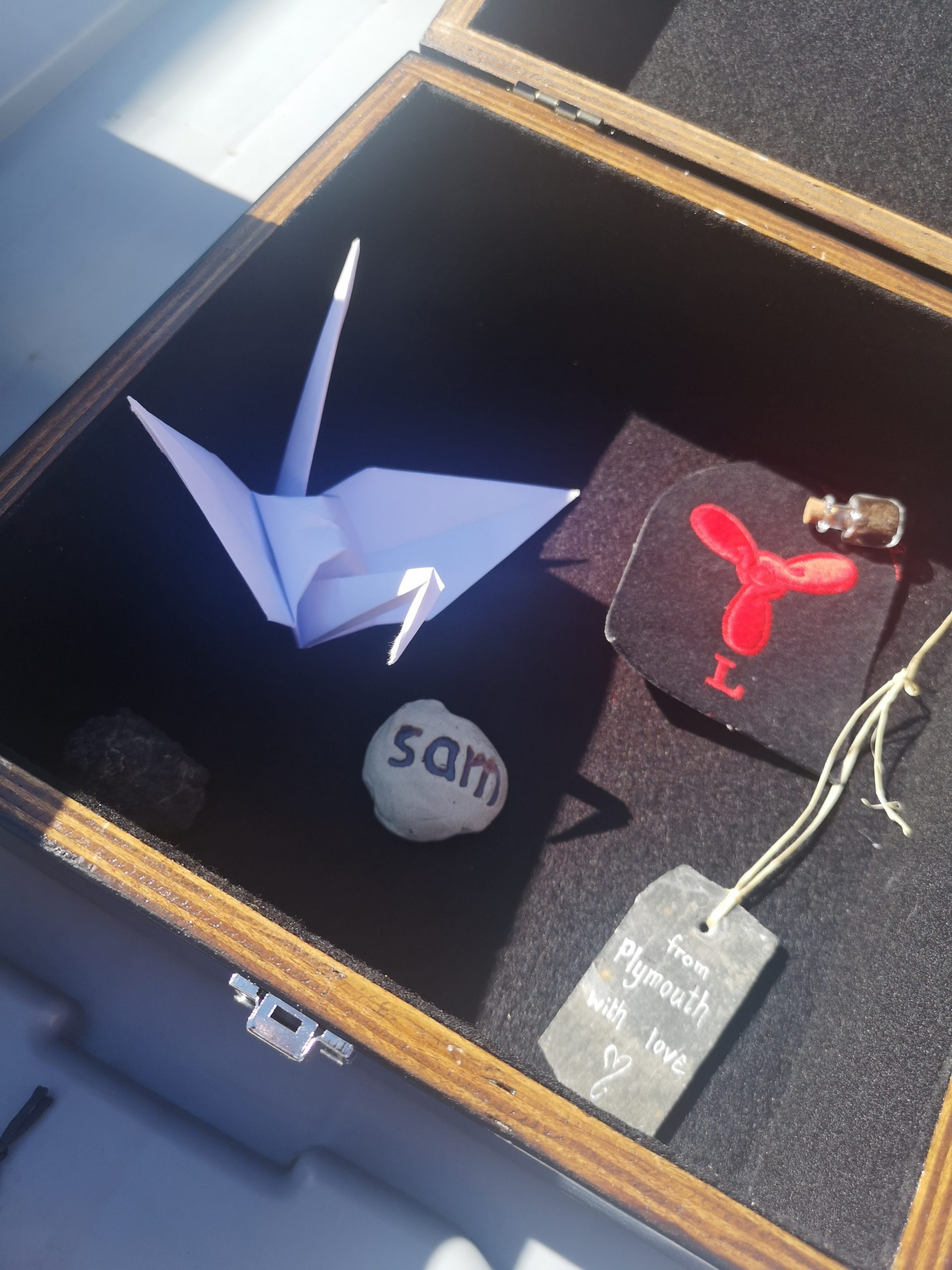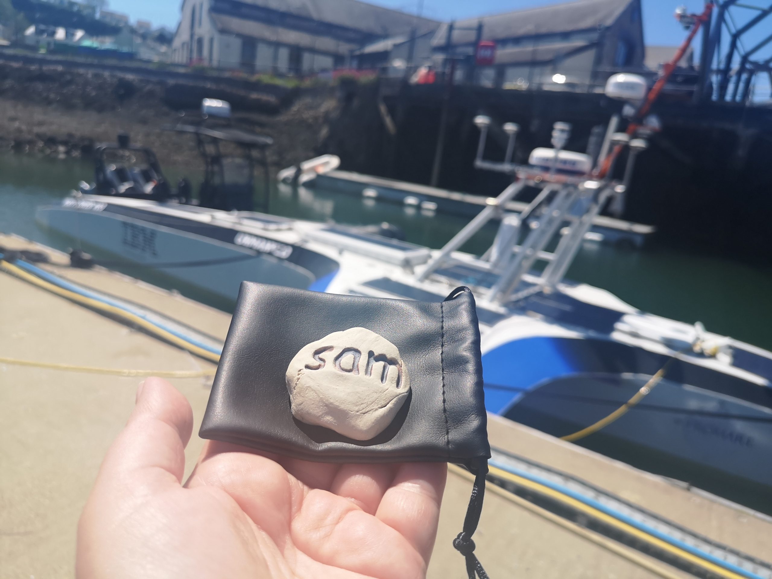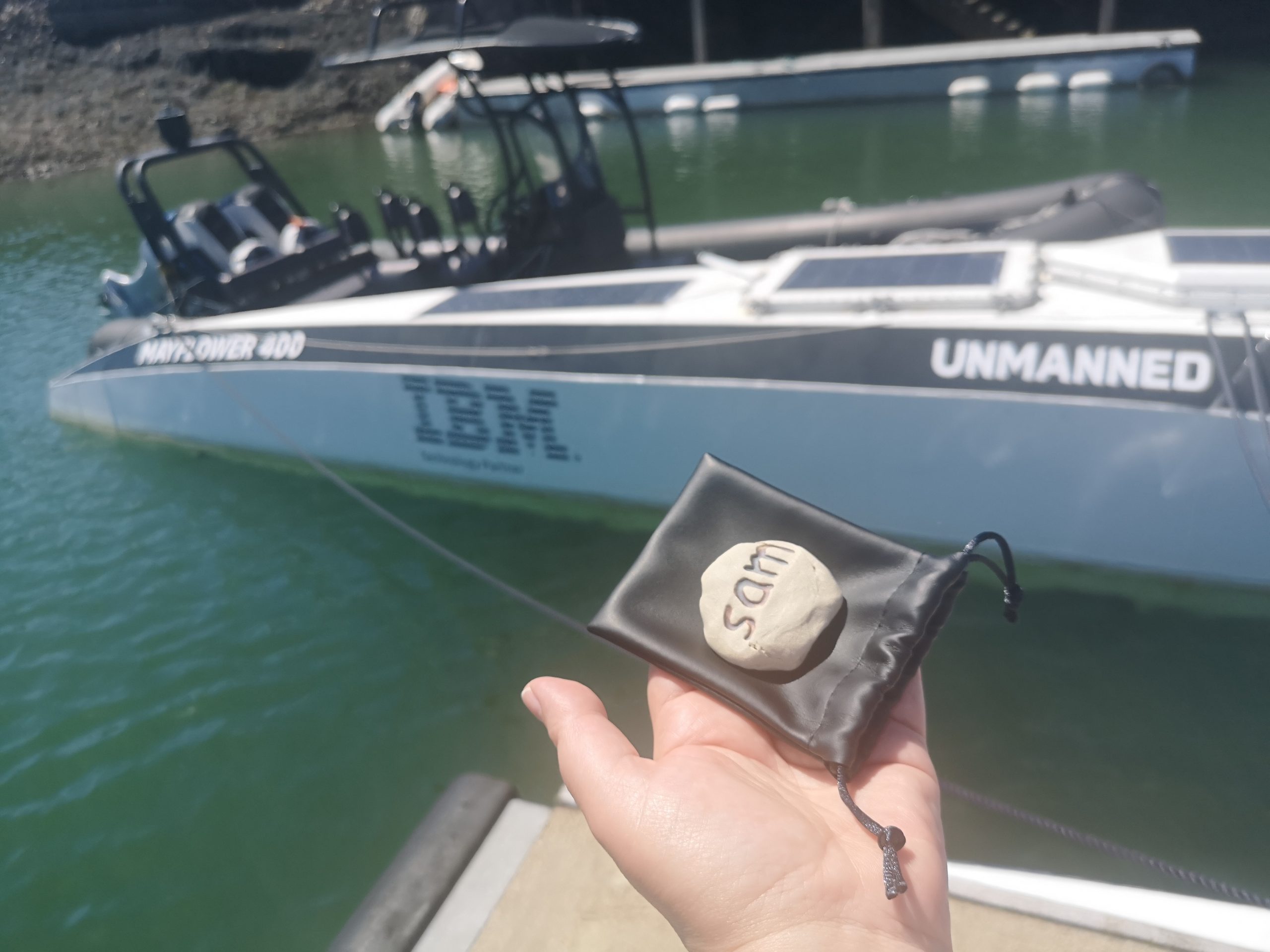 I put the Sam stone in a pouch and placed the pouch inside a box we made for the personal items our team members and their families wanted to send inside the Mayflower Autonomous Ship across the Atlantic Ocean to the USA. This is a ocean science platform, and an autonomous vessel. Let’s hope it makes it. I’m sure Sam’s memory will bring us good luck, and his adventurous spirit is an inspiration. The boat’s location can be tracked here: http://www.mas400.com
