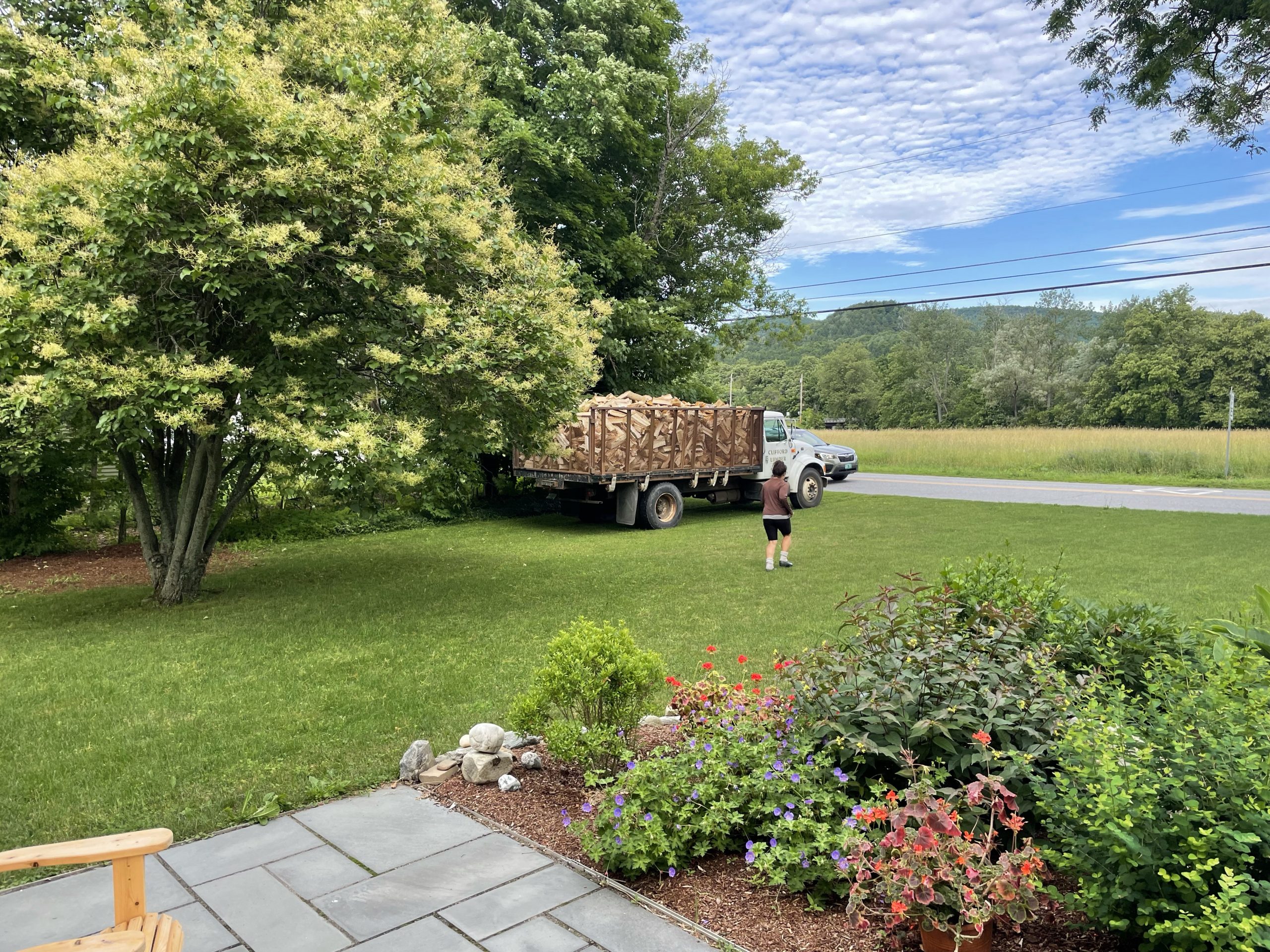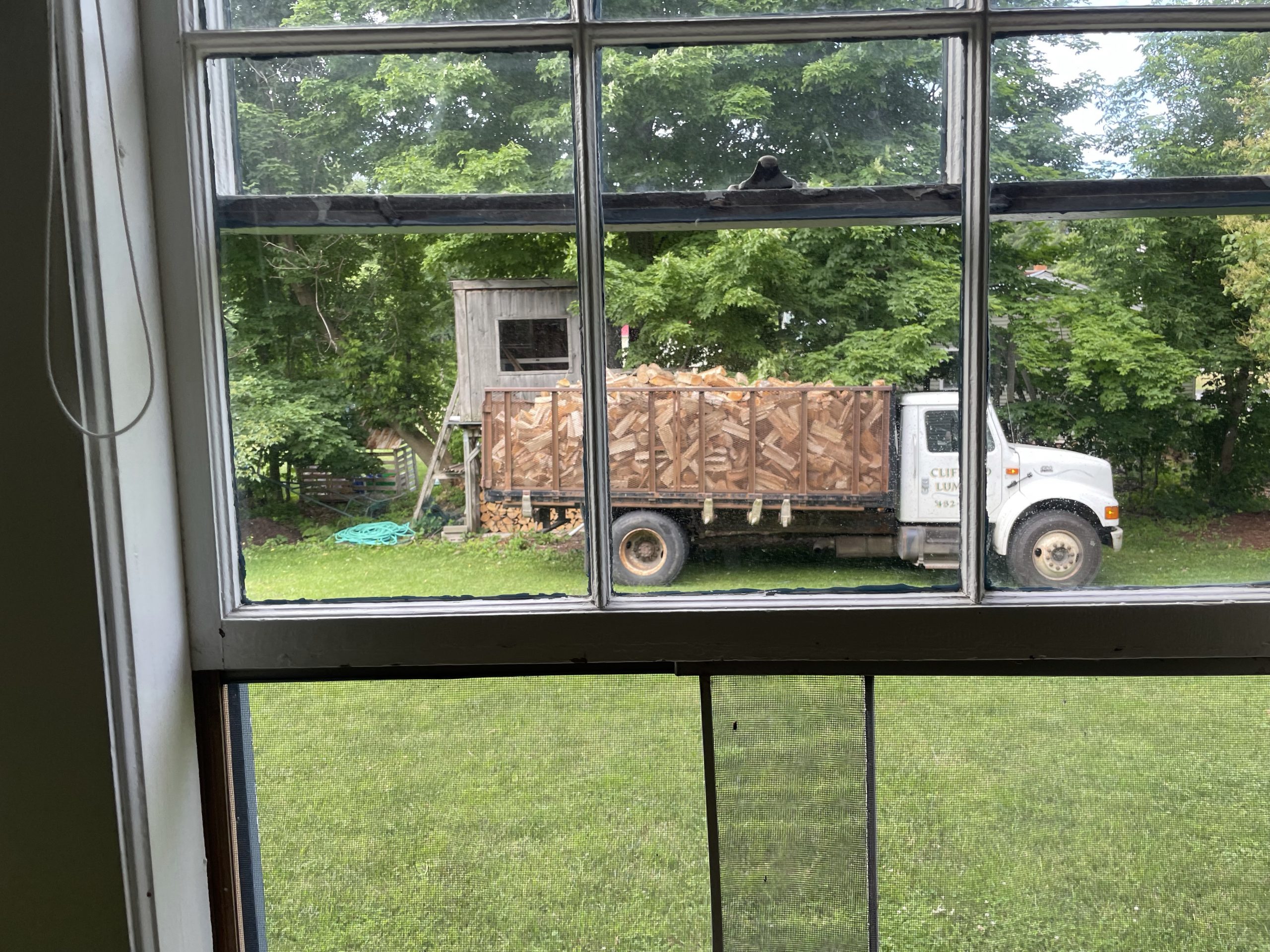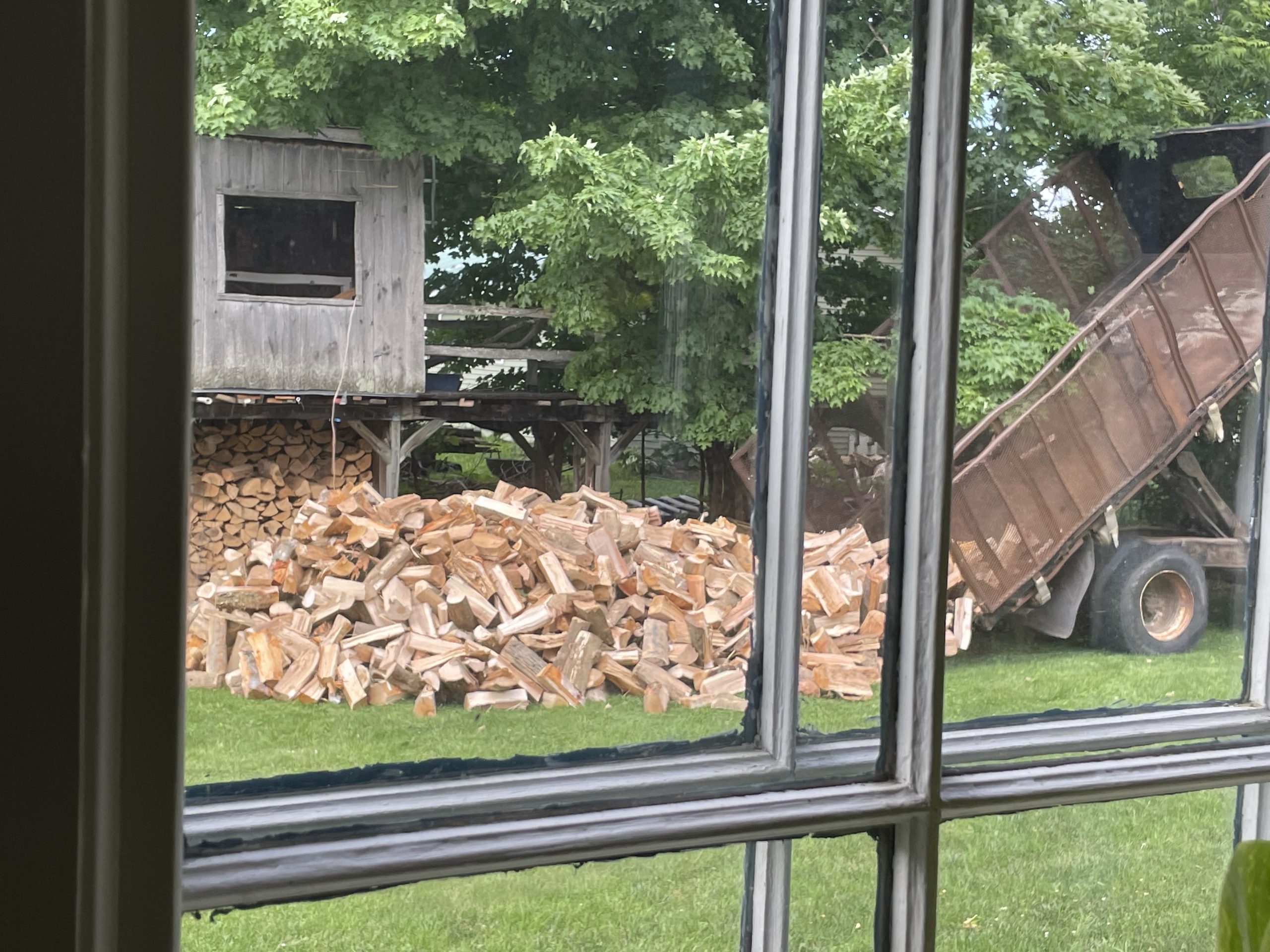 Started the day with a rumble… As our 5 cord of fire wood got dumped out.. We had to drop it Far out in the yard because the family of Robbins that’s still living in one of the base of the wood frame still has it fledged with its babies.