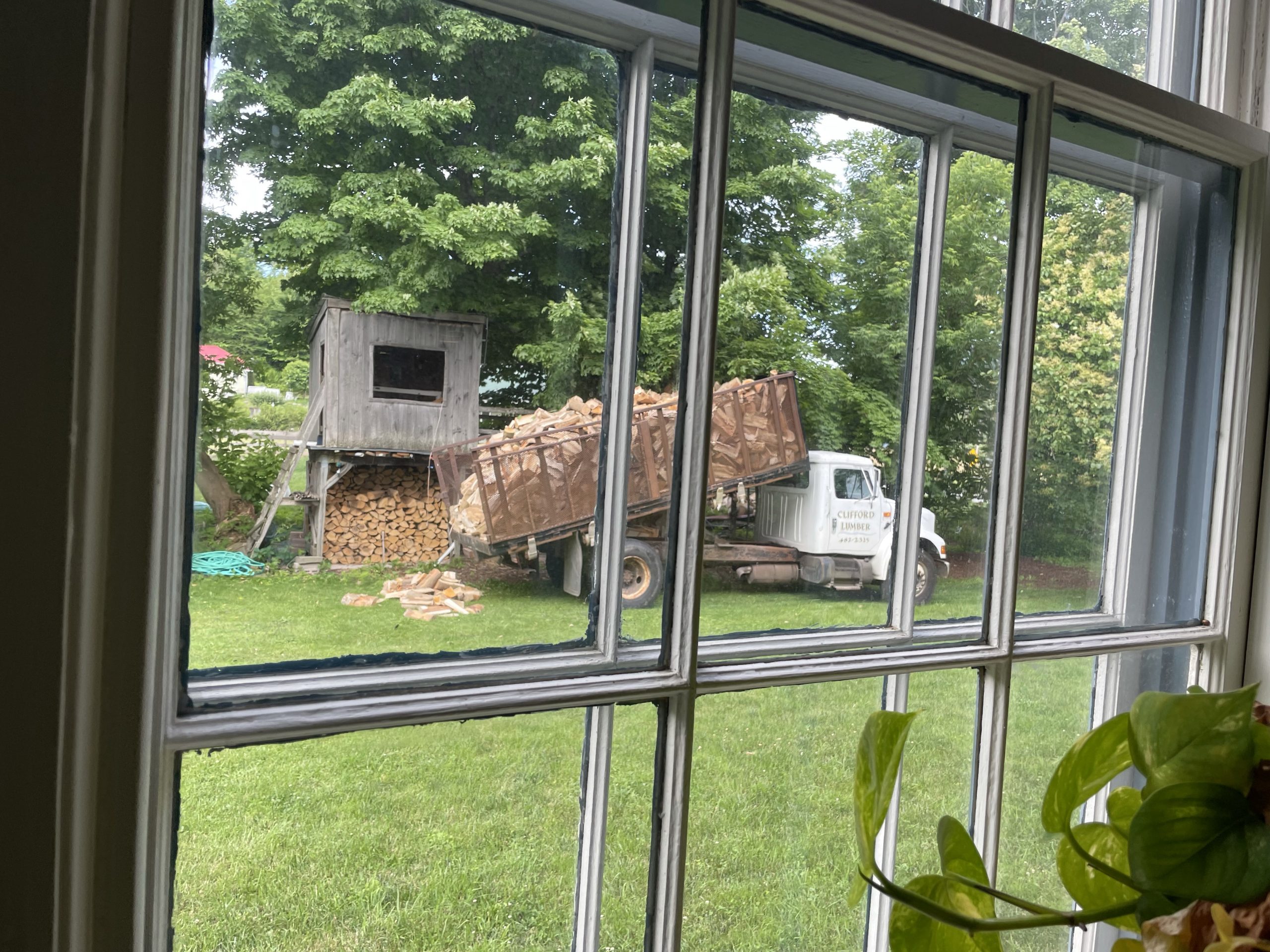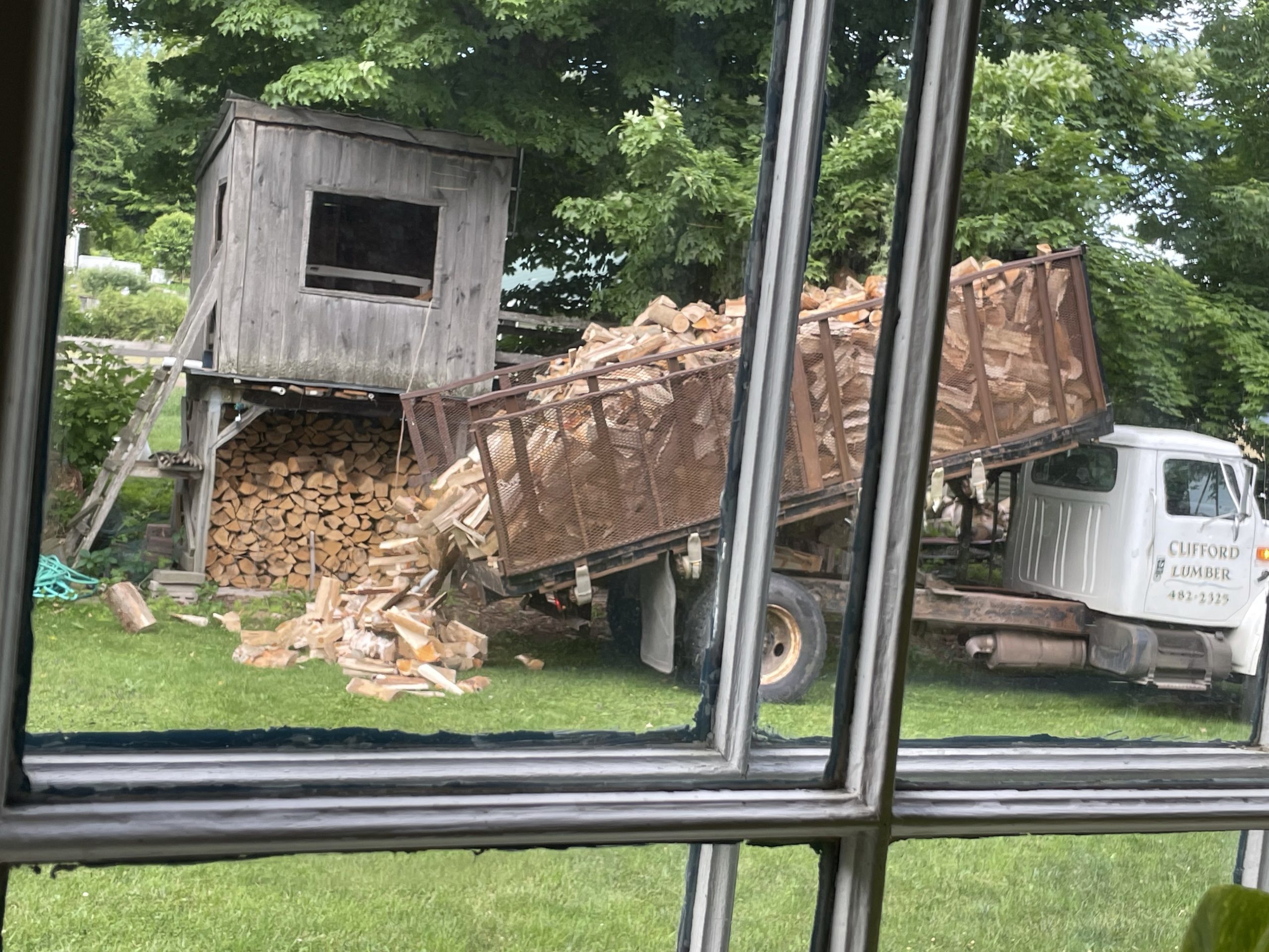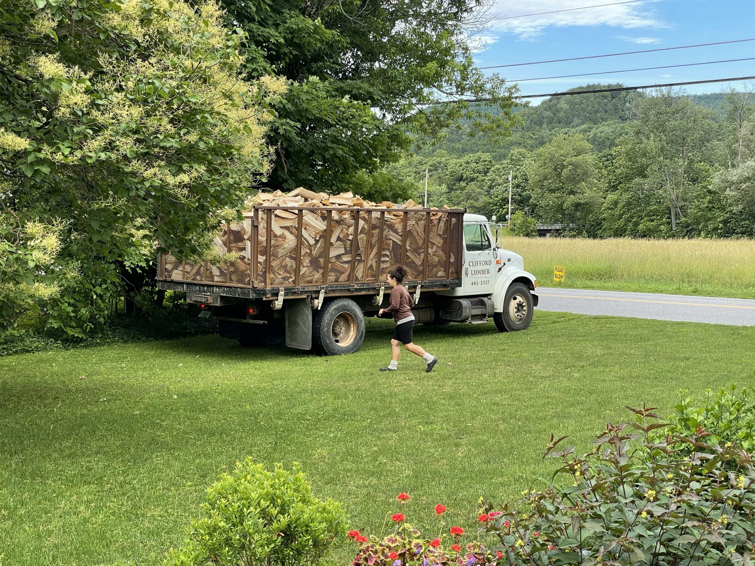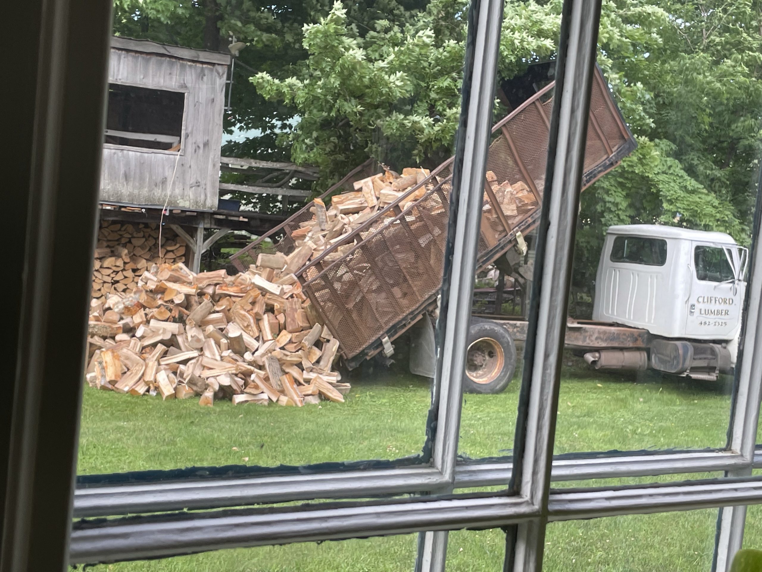 Started the day with a rumble… As our 5 cord of fire wood got dumped out.. We had to drop it Far out in the yard because the family of Robbins that’s still living in one of the base of the wood frame still has it fledged with its babies.