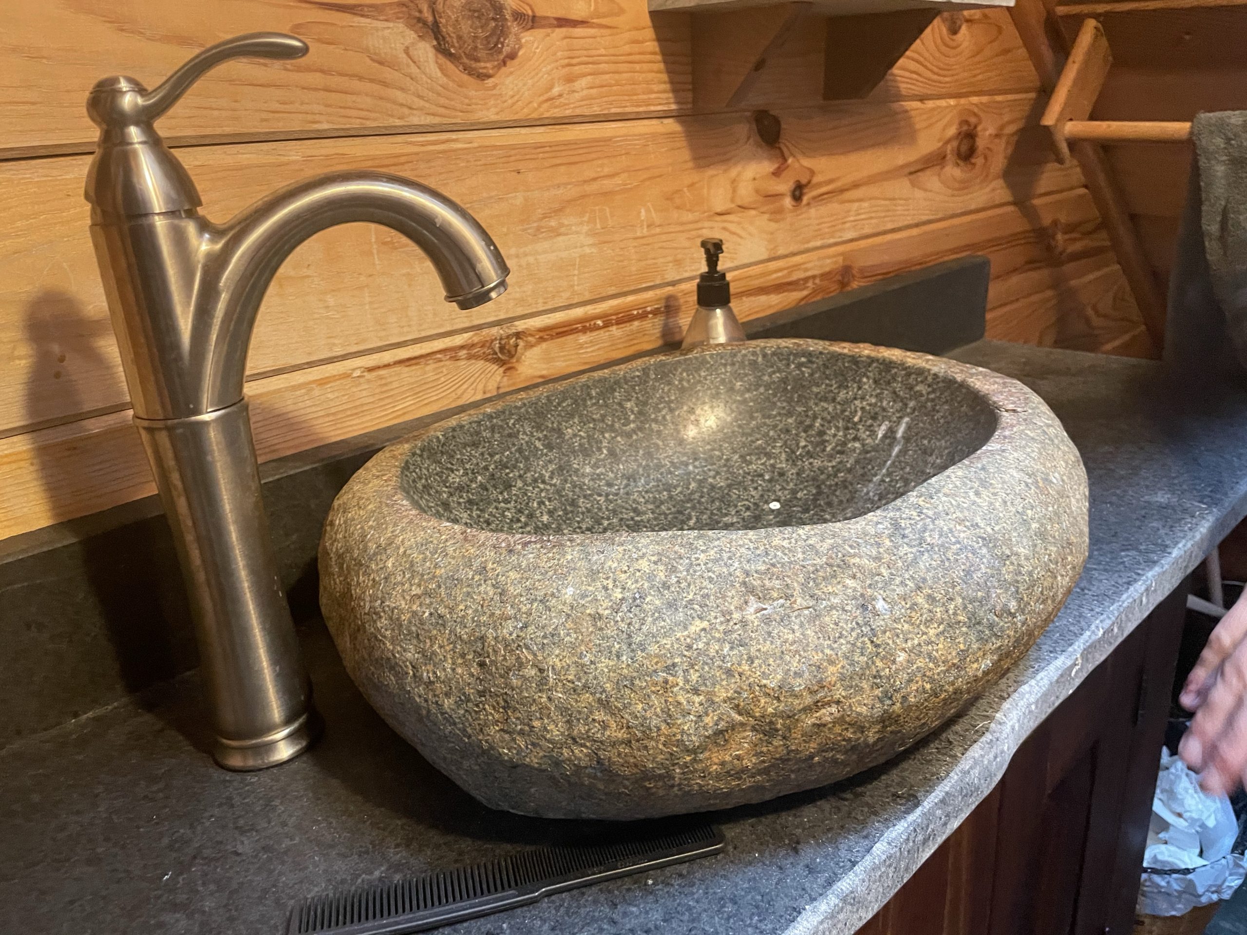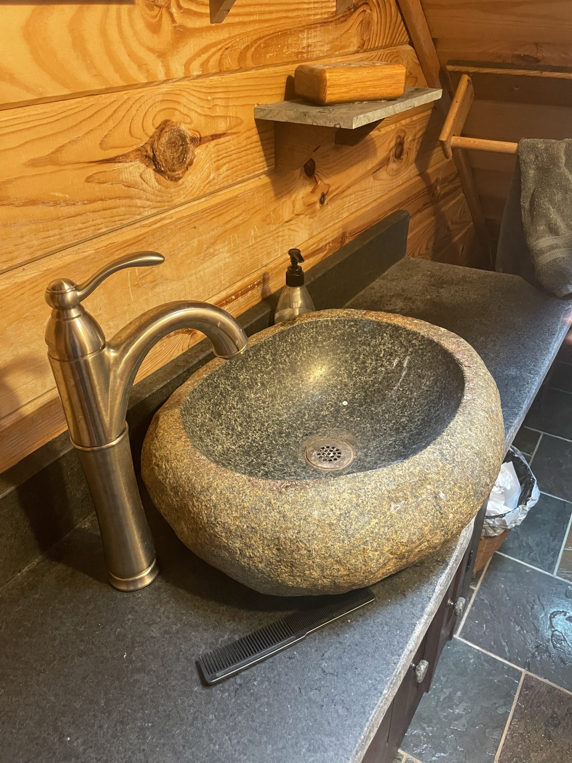 After work Diane and I drove out to see our friend Lee-Ann and Adam out at yoga… They live in a beautiful log house If they built by themselves… It has a beautiful woodwork and stonework everywhere . they’ve raised their four kids here It feels like it would be such a great place to grow up. We had a wonderful time talking with them… So wonderful that I forgot to take any pictures at all… The only picture I did take was of the sink that Adam had made. He bought the stone orange car… But it looks like the kind of stuff that GabÉ does.
