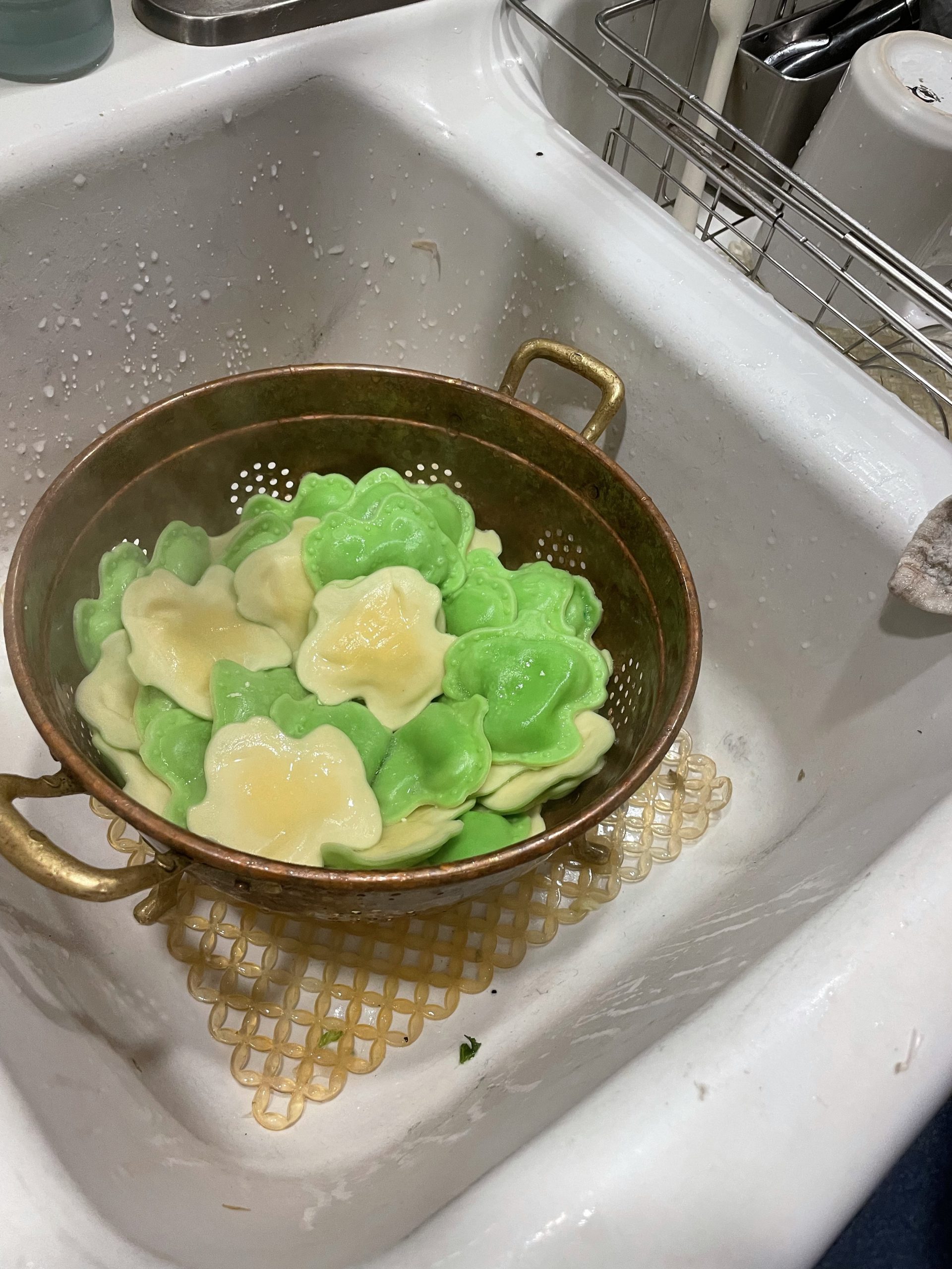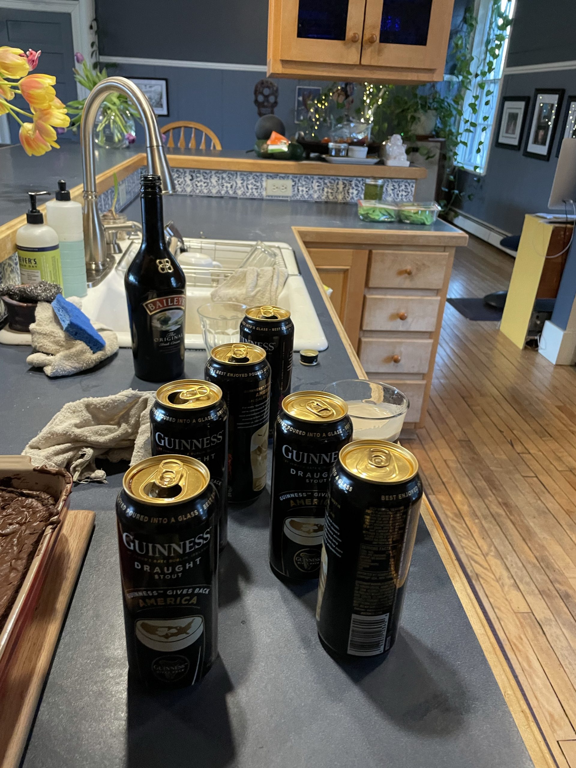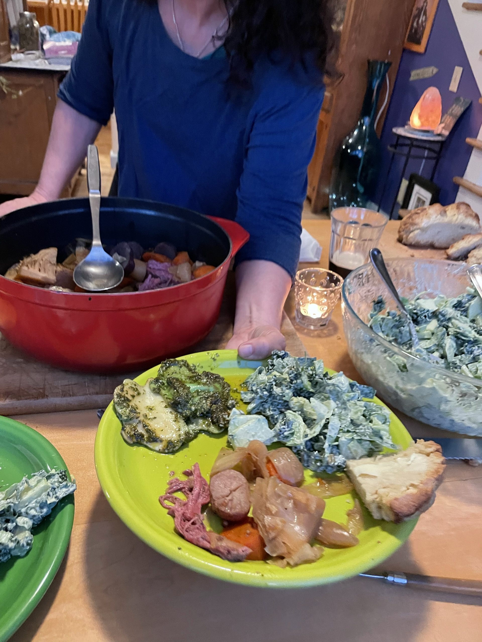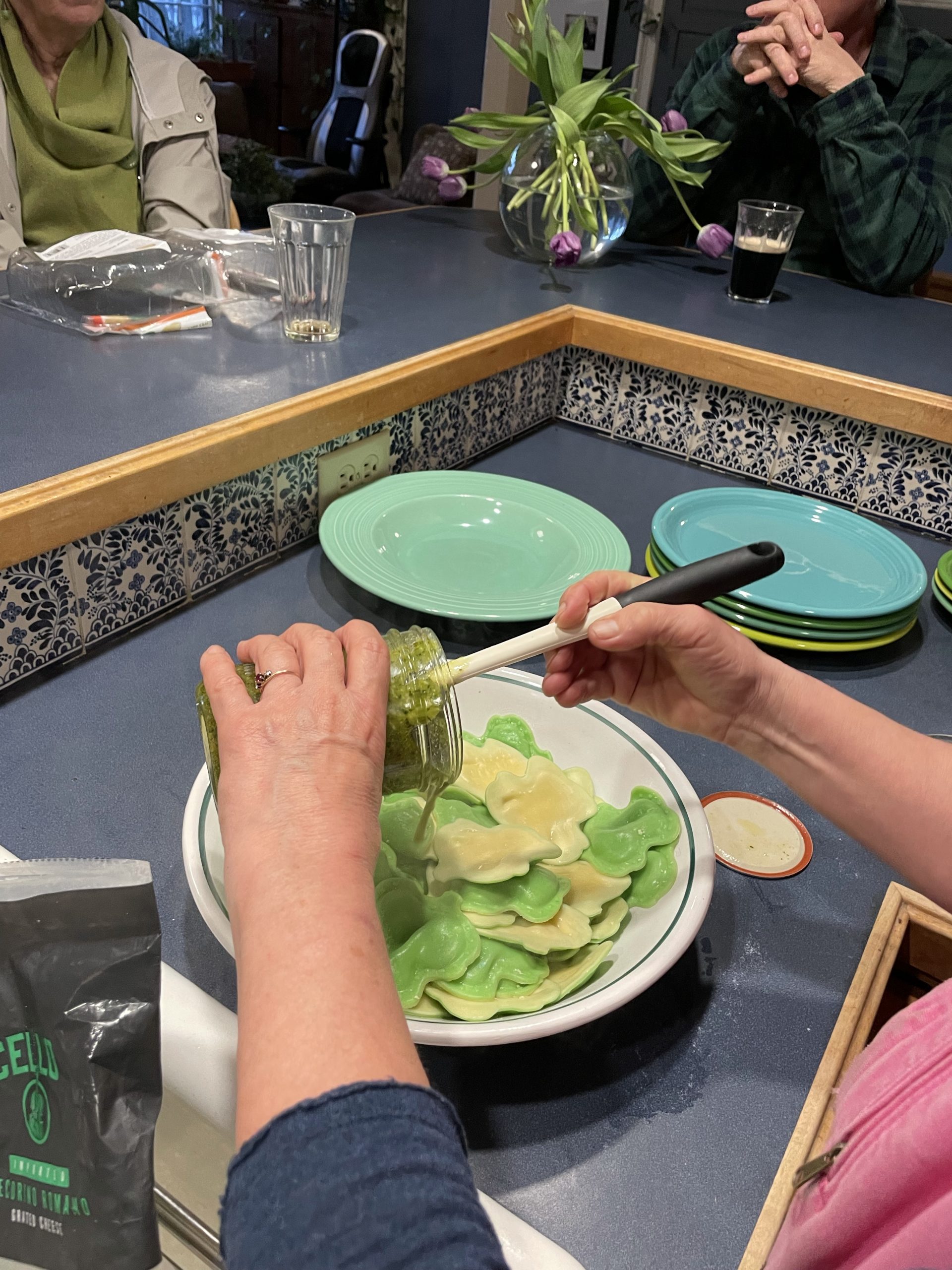 After work I did prince Tim and Jen came over for a full “Irish'” dinner… They brought Conti cabbage… Diane made green shamrock flavored spinach ravioli with pesto and an interesting green salad it was made out of kale and green apples… Diane also made some Irish soda bread which was really yummy.We washed it all down with a bunch of Guinness… I almost felt Irish 🙂