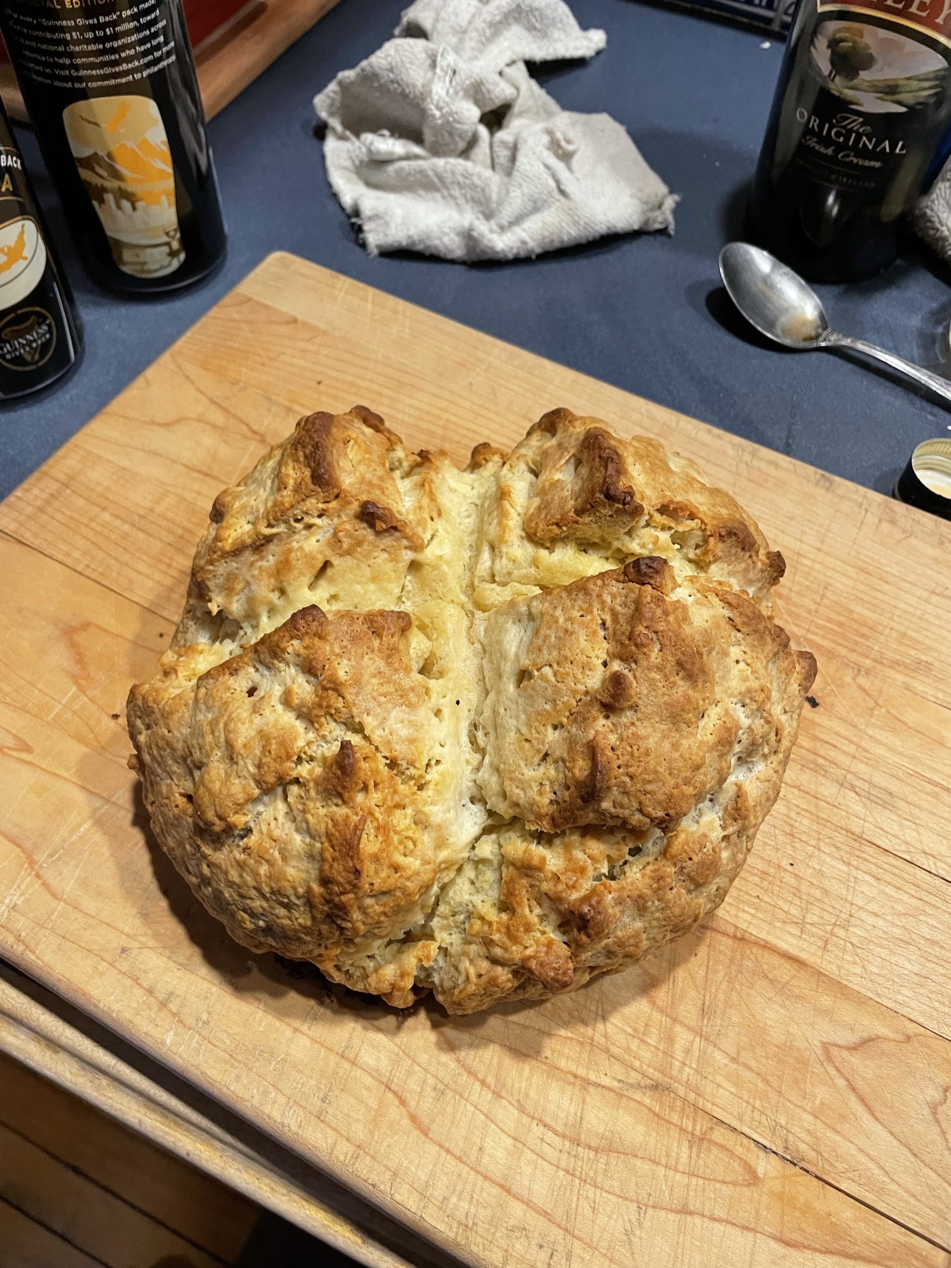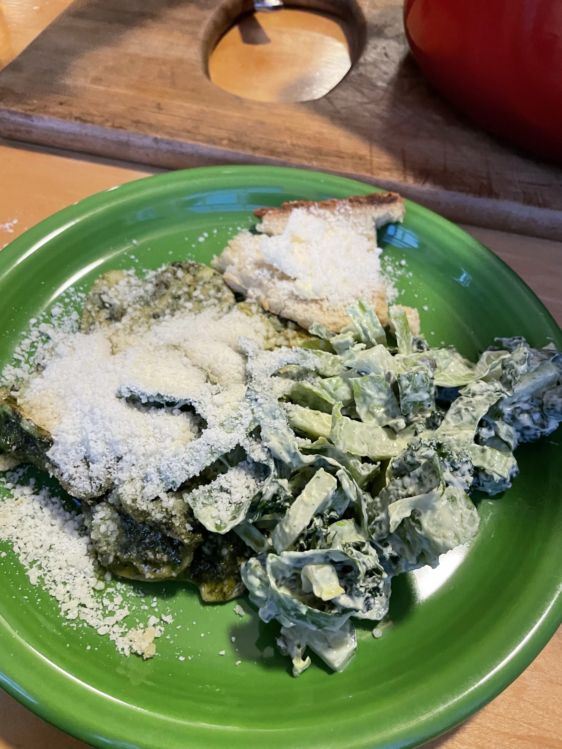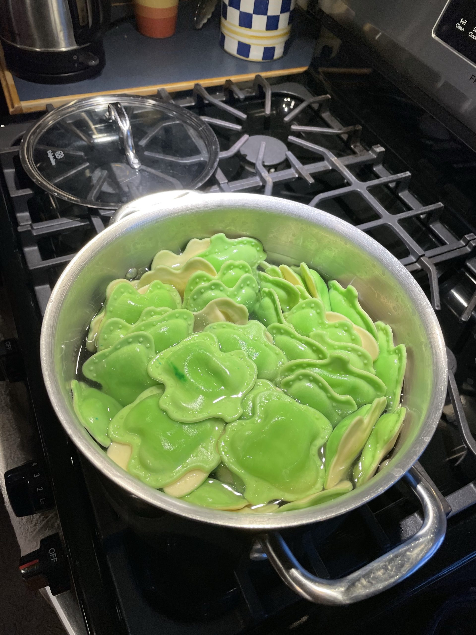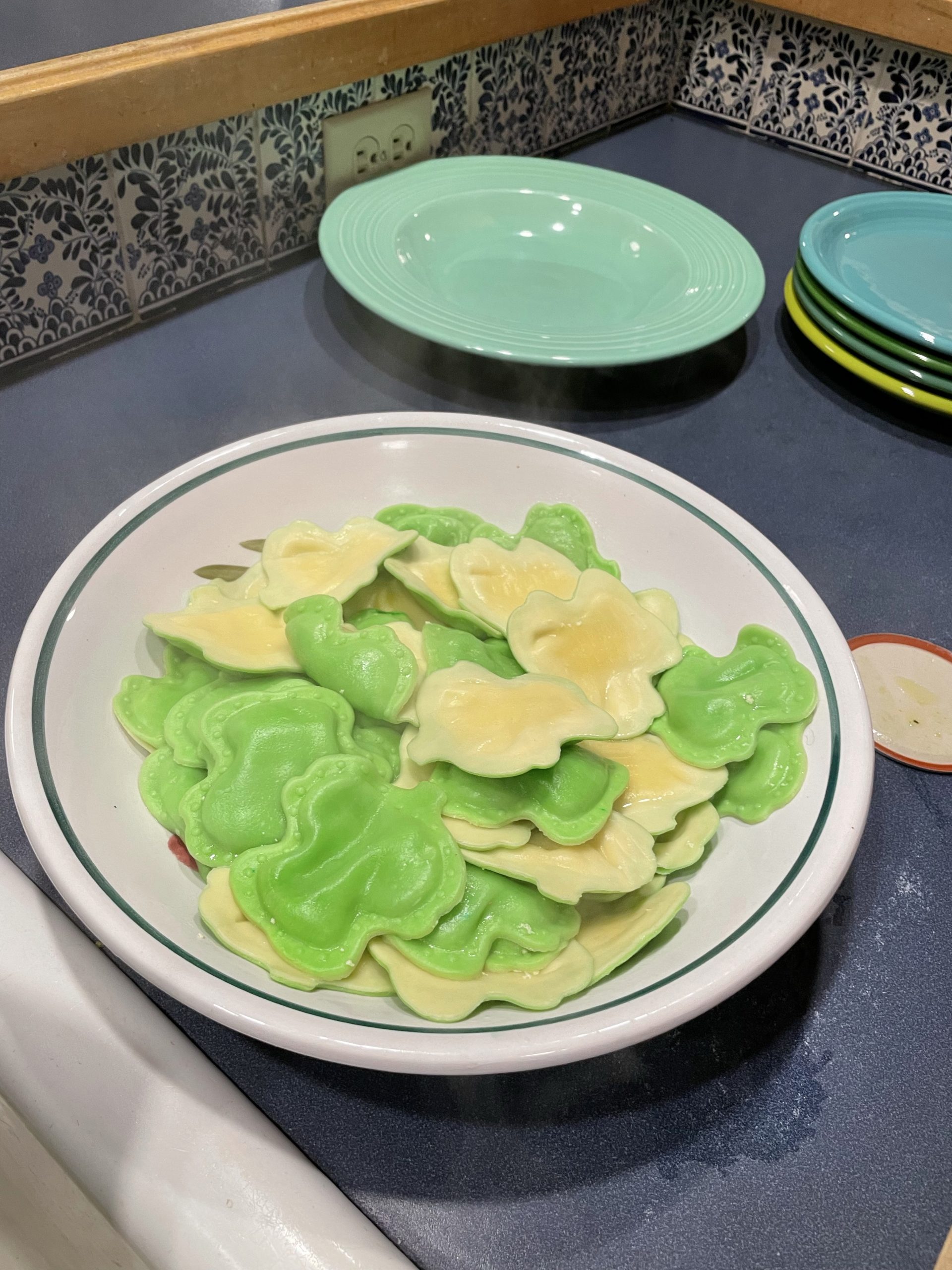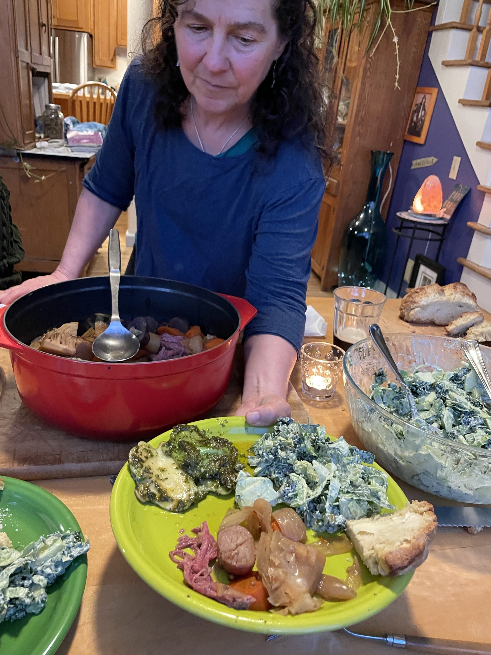 After work I did prince Tim and Jen came over for a full “Irish'” dinner… They brought Conti cabbage… Diane made green shamrock flavored spinach ravioli with pesto and an interesting green salad it was made out of kale and green apples… Diane also made some Irish soda bread which was really yummy.We washed it all down with a bunch of Guinness… I almost felt Irish 🙂