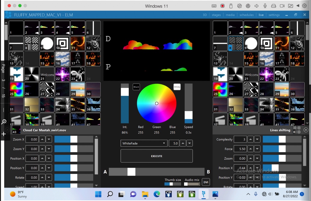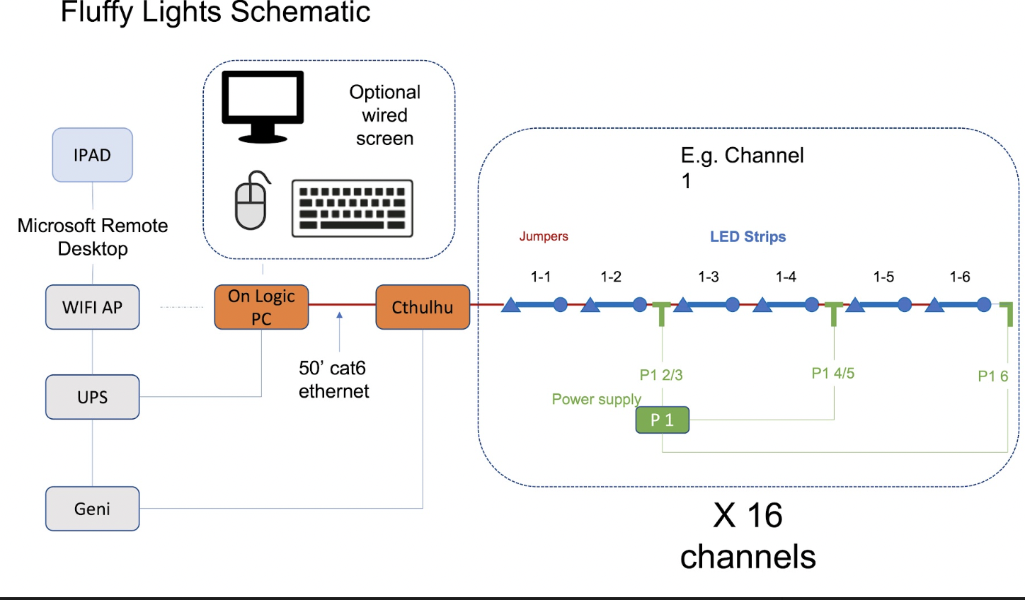 we started with Light school where we went through all the assembly , wiring and testing of the nearly 1100 led strips, the ‘cluthulu’ pixel controller (a pixcon 16 MKII if anyone is interested). Our sparkling new Onlogic K800 ruggedized fan-less computer, the Entek Light mapping (ELM) software, the wireless access point that linked in the iPad to control the software and two levels of back up devices in case that failed.. .. We (marie, aaron S, rebar, gizzo and jack) went through all of Maries beautiful maps of the lights , schematics, player screens.. ..stuff like this..