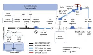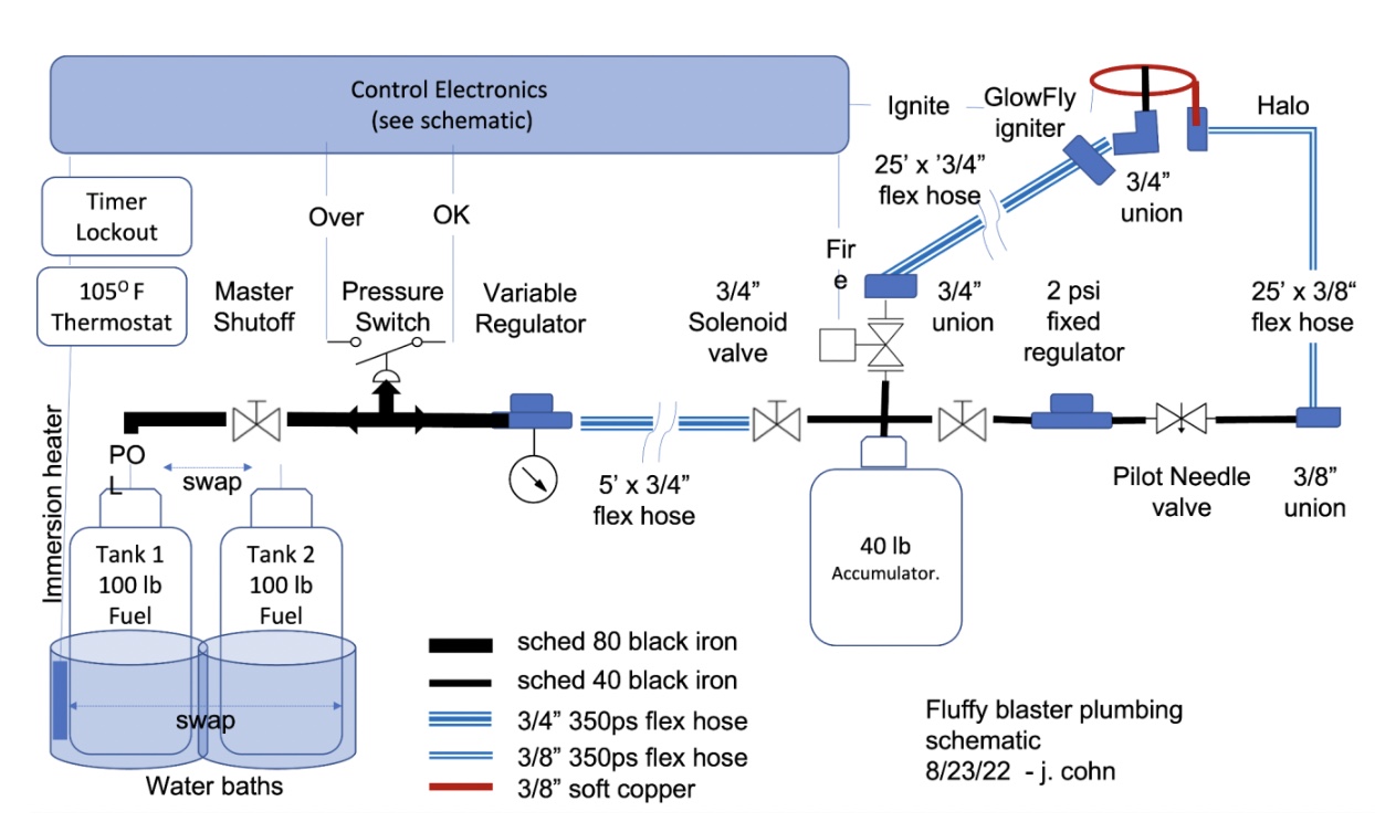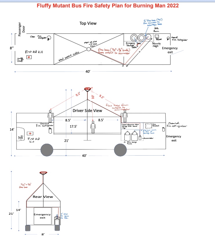 we (rebar, gizzo, .. who else ?) went through all the safety docs that James and I had put together (I’ll be forever grateful to James for all the work he did in helping us write the safety docs !!!!!). We went through the set up (which Rebar already new well).. testing, start up, tank changes and most importantly the emergency procedures. Even though fluffy only has a sing simple poofer, we carry 200 pounds of propane and shoot 10 feet of flame.. safety is a big deal. There has to be a sober person with her/his hands on the control at all times the device is running. Here are some of the docs we went through.. Again.. a ton of stuff