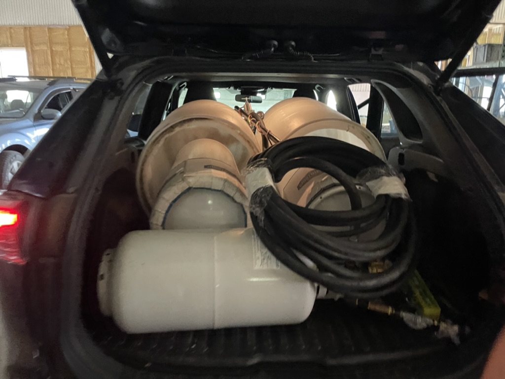 Busy Sunday… We’re startign work in earnest on the fire effect for Fluffy the burning man bus. First step in that was to transfer all the remaining parts from our house to Nordic.. That included 2 new 100 lb porpane tanks with quick fill valves.. they are sweet. Anyway.. our car looked kinda suspicious with all that gear