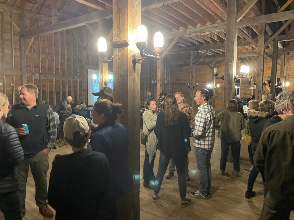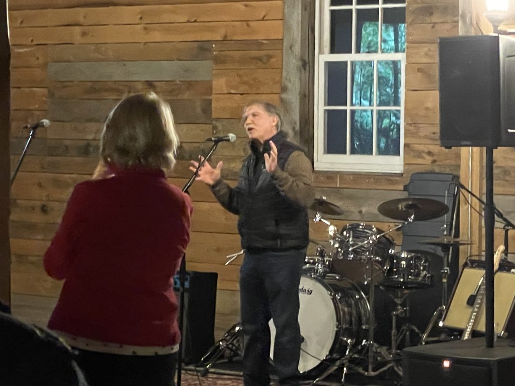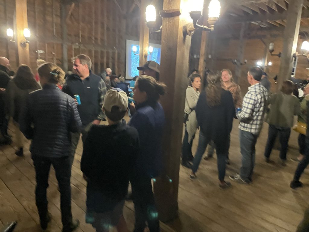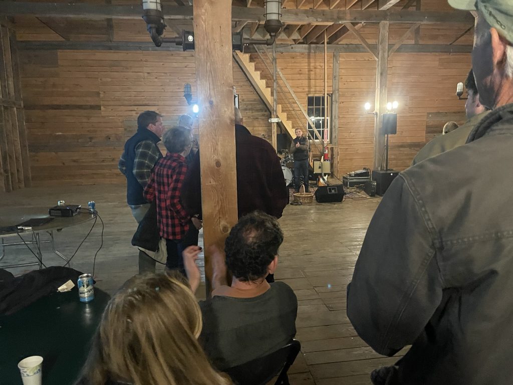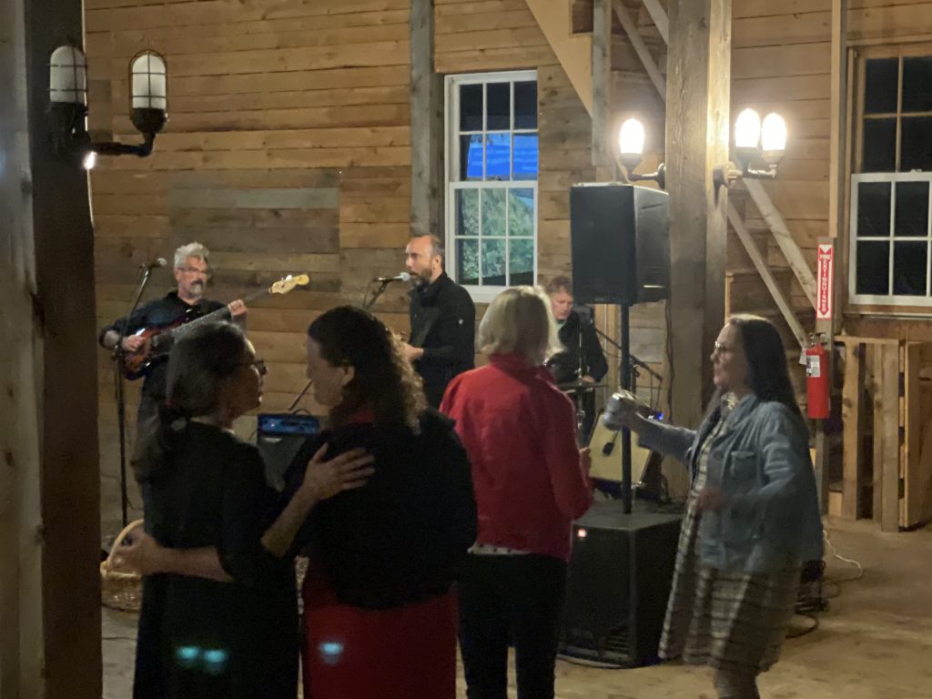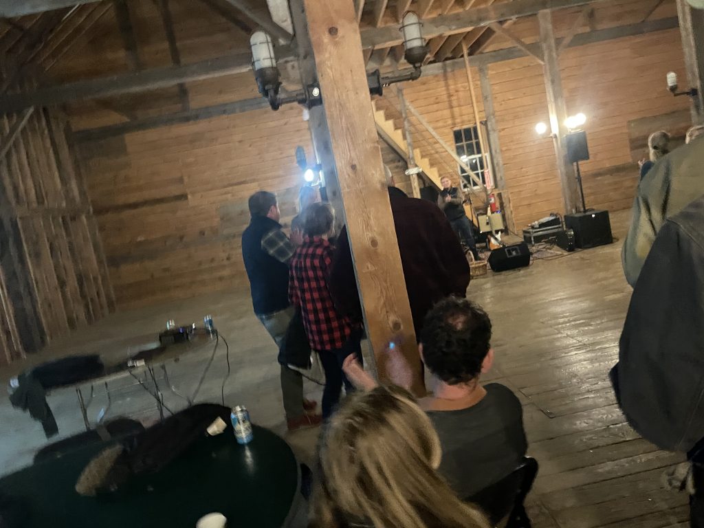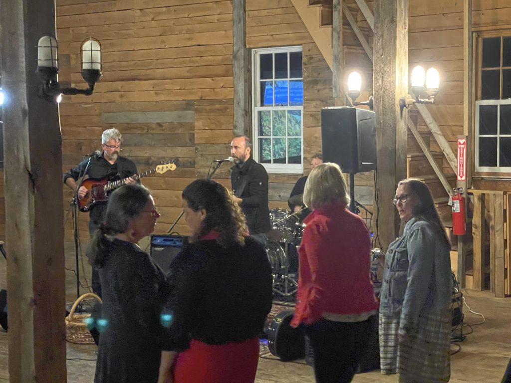 around 6 I headed over to the monitor barn for the land trust barn dance . the band red hot ju a was playing with erik k on lead guitar . erik was two of the kids english teacher at mmu.