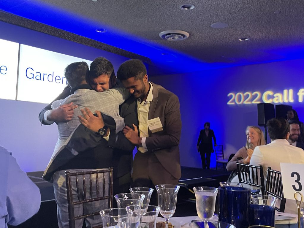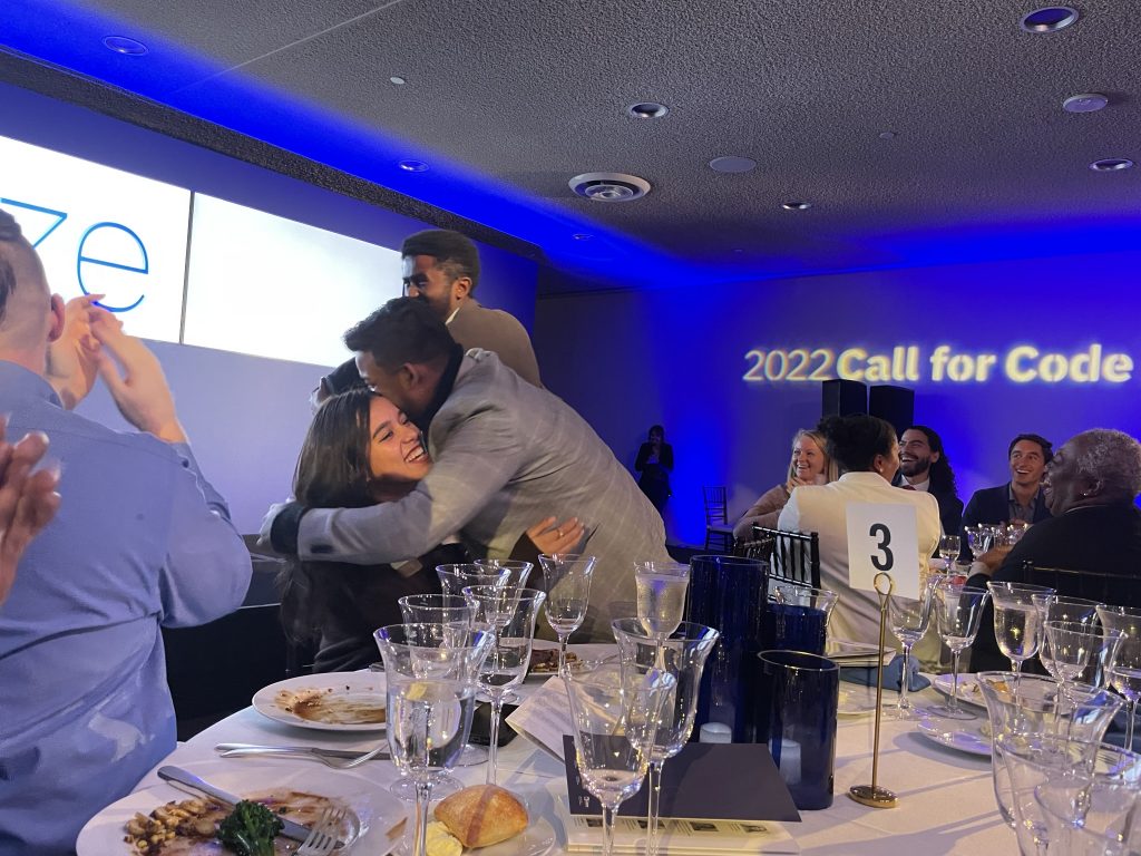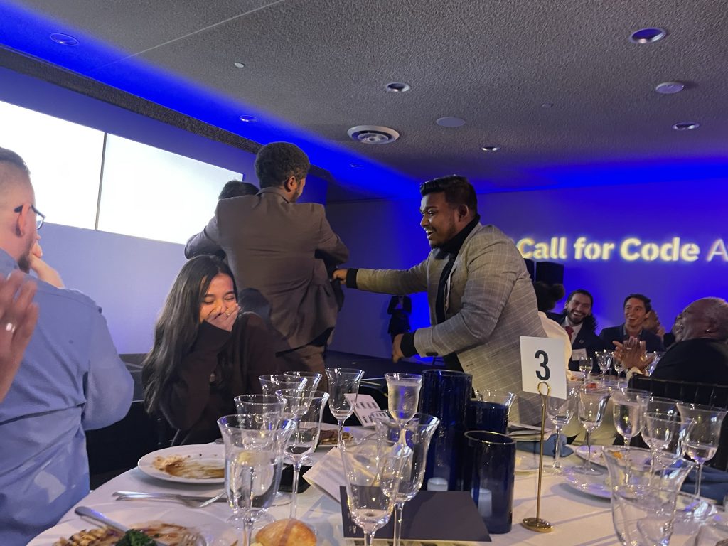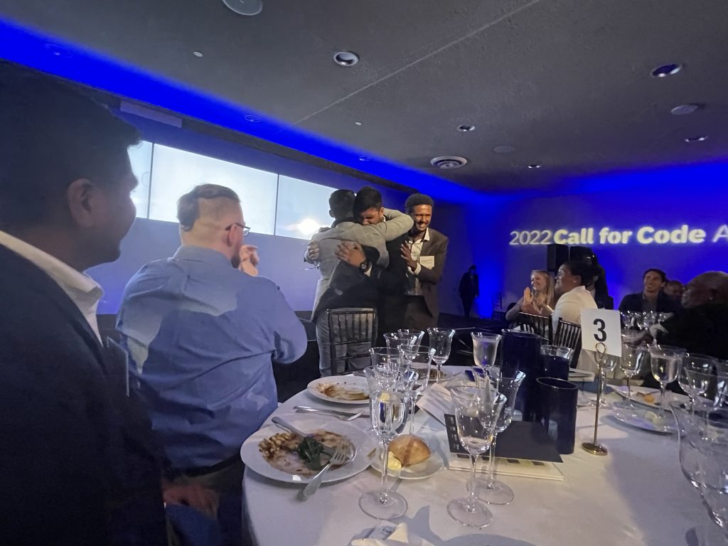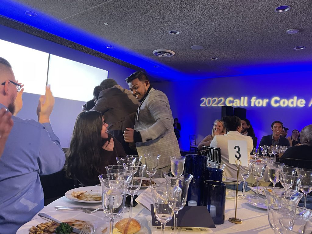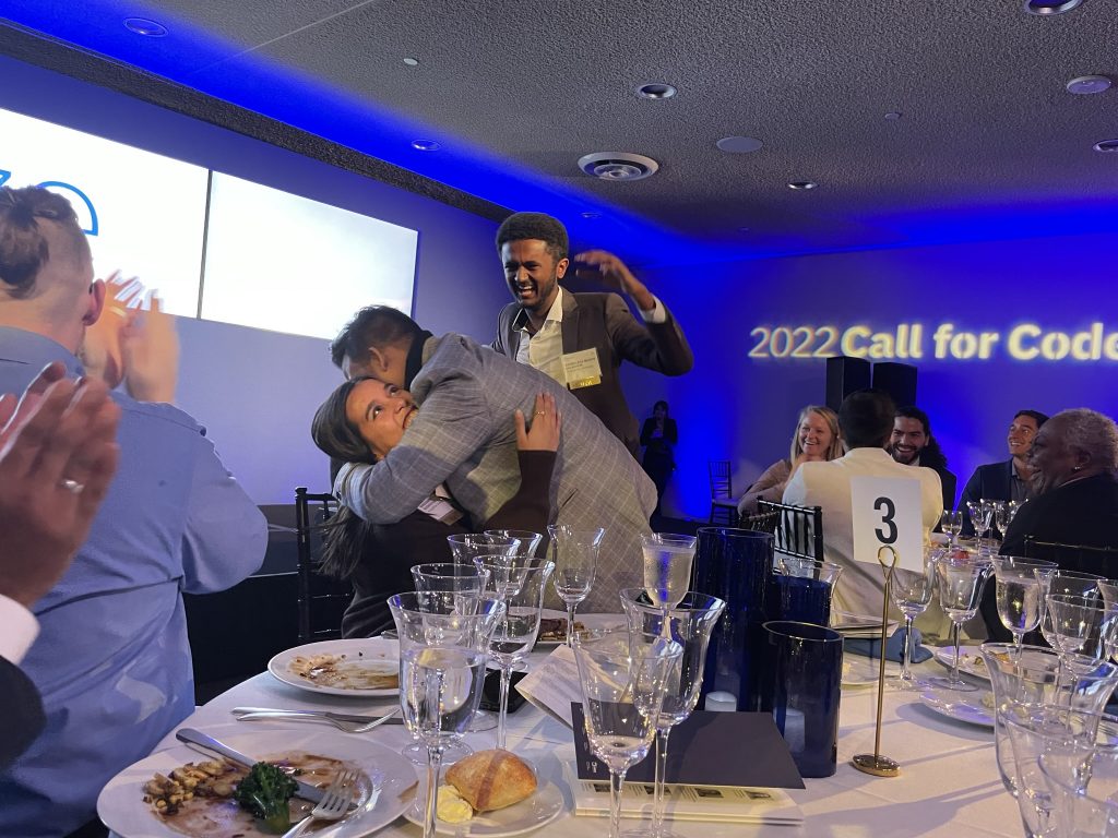 Then the 2nd place winner was announde.. they were several tables away.. it took a few moments to register but then the other team at our table realize that they were the 1st place winner. They were getting eh $200K and the technical help to develop and deploy their solution in the real world. When it hit them , they all jumped up in tand started hugging each other.. some of them were crying they were so happy. i The team were all international students from Augustana University in South Dakota..Two of the team members were from India, One from Ethiopia and one from Nepal. t was so wonderful to see their joy !