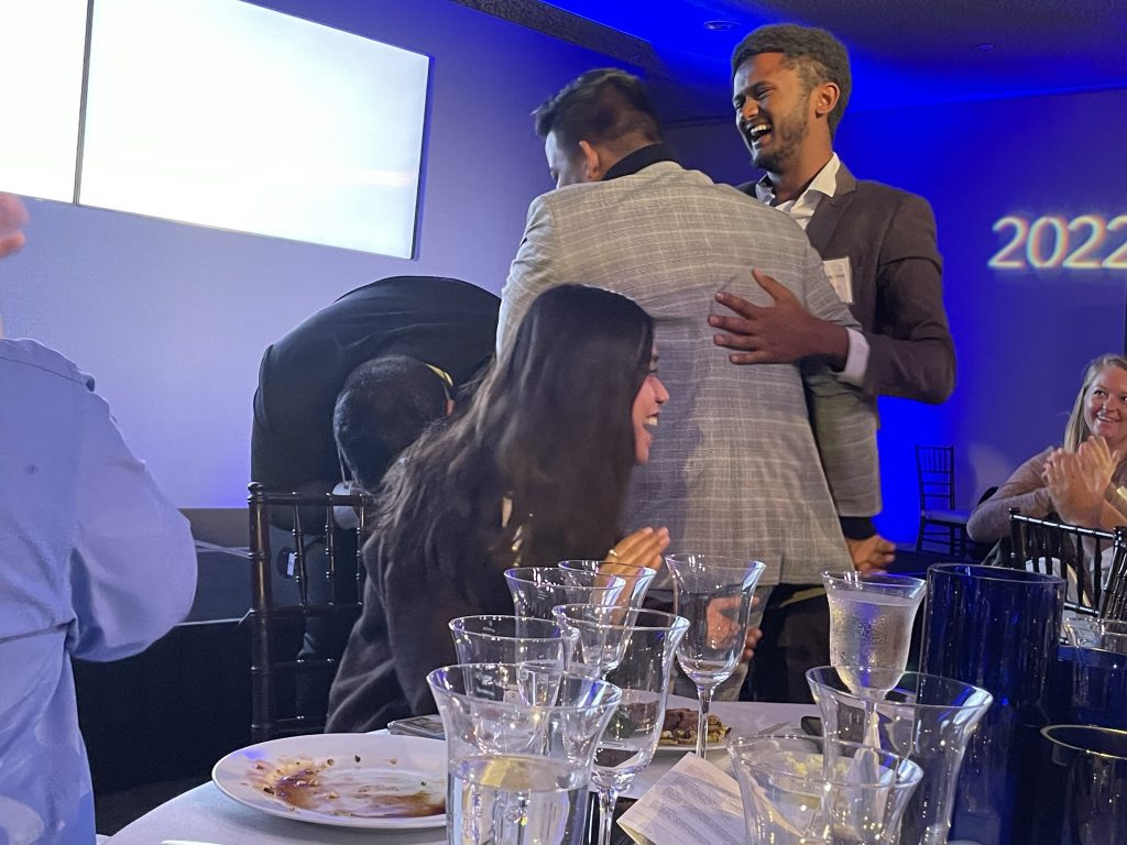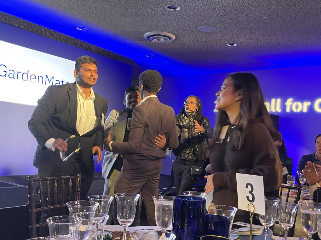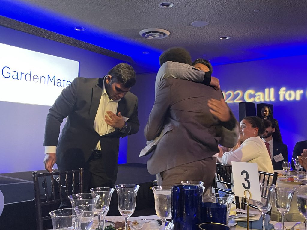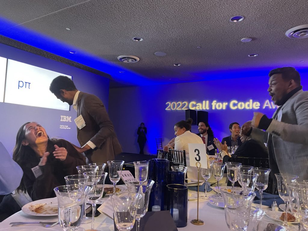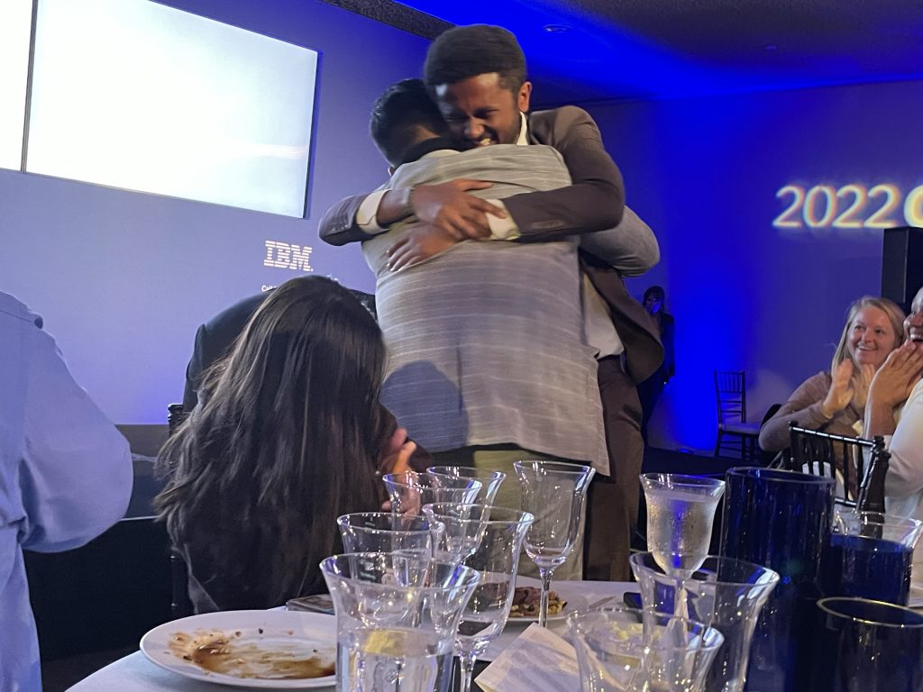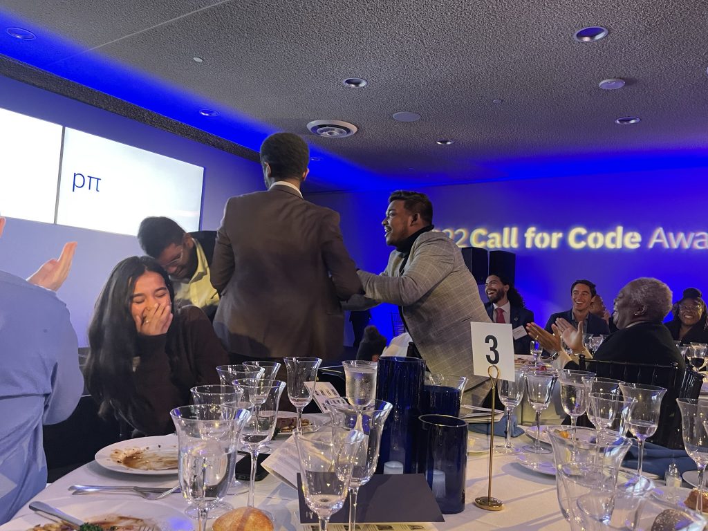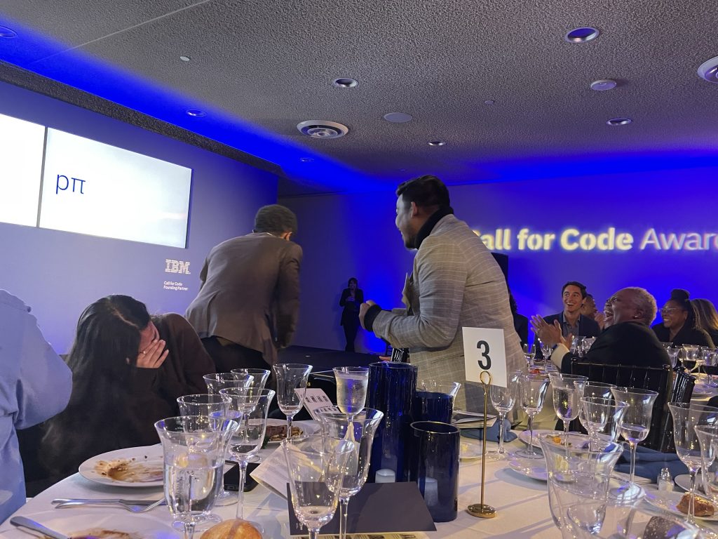 Then the 2nd place winner was announde.. they were several tables away.. it took a few moments to register but then the other team at our table realize that they were the 1st place winner. They were getting eh $200K and the technical help to develop and deploy their solution in the real world. When it hit them , they all jumped up in tand started hugging each other.. some of them were crying they were so happy. i The team were all international students from Augustana University in South Dakota..Two of the team members were from India, One from Ethiopia and one from Nepal. t was so wonderful to see their joy !
