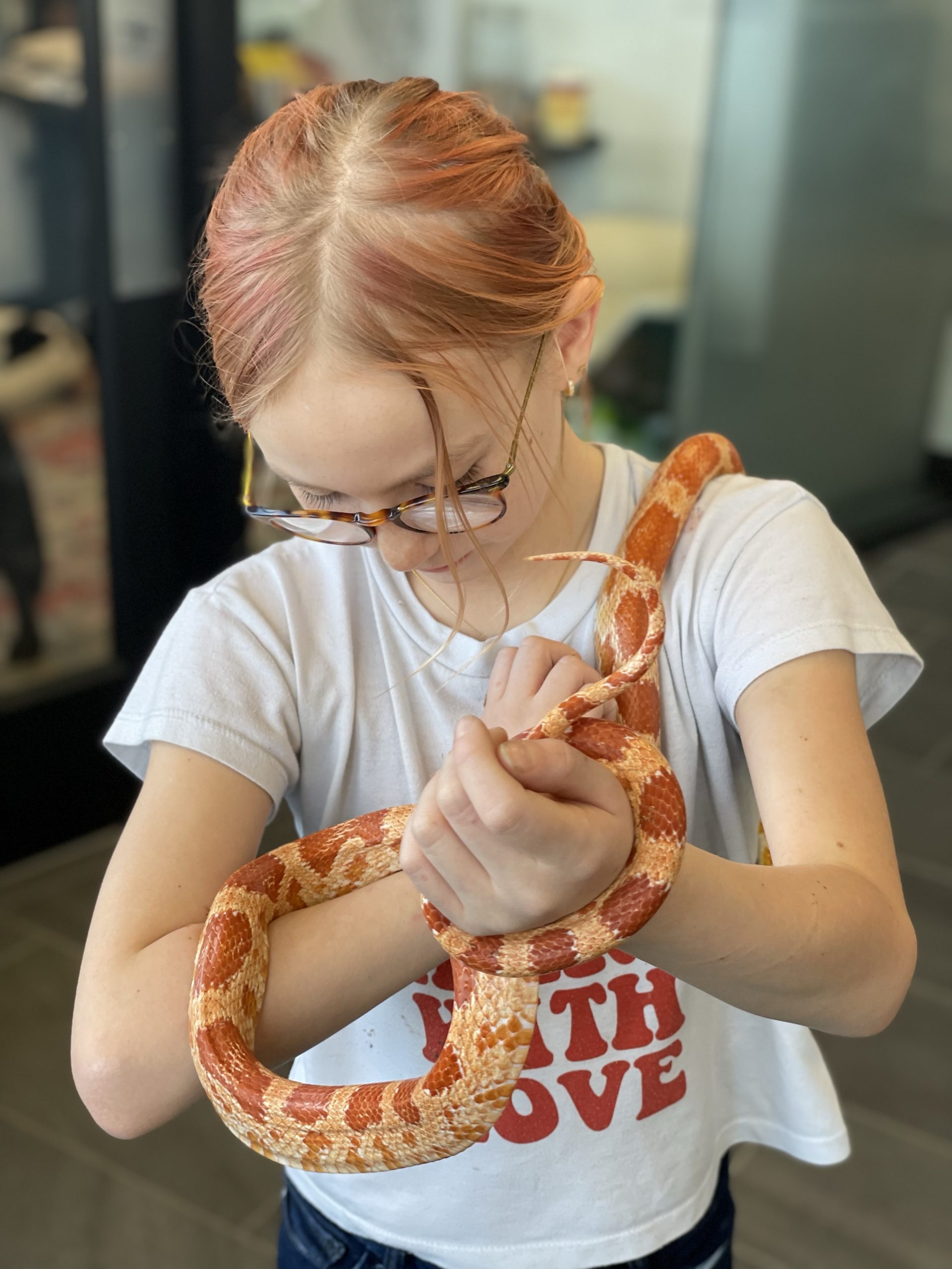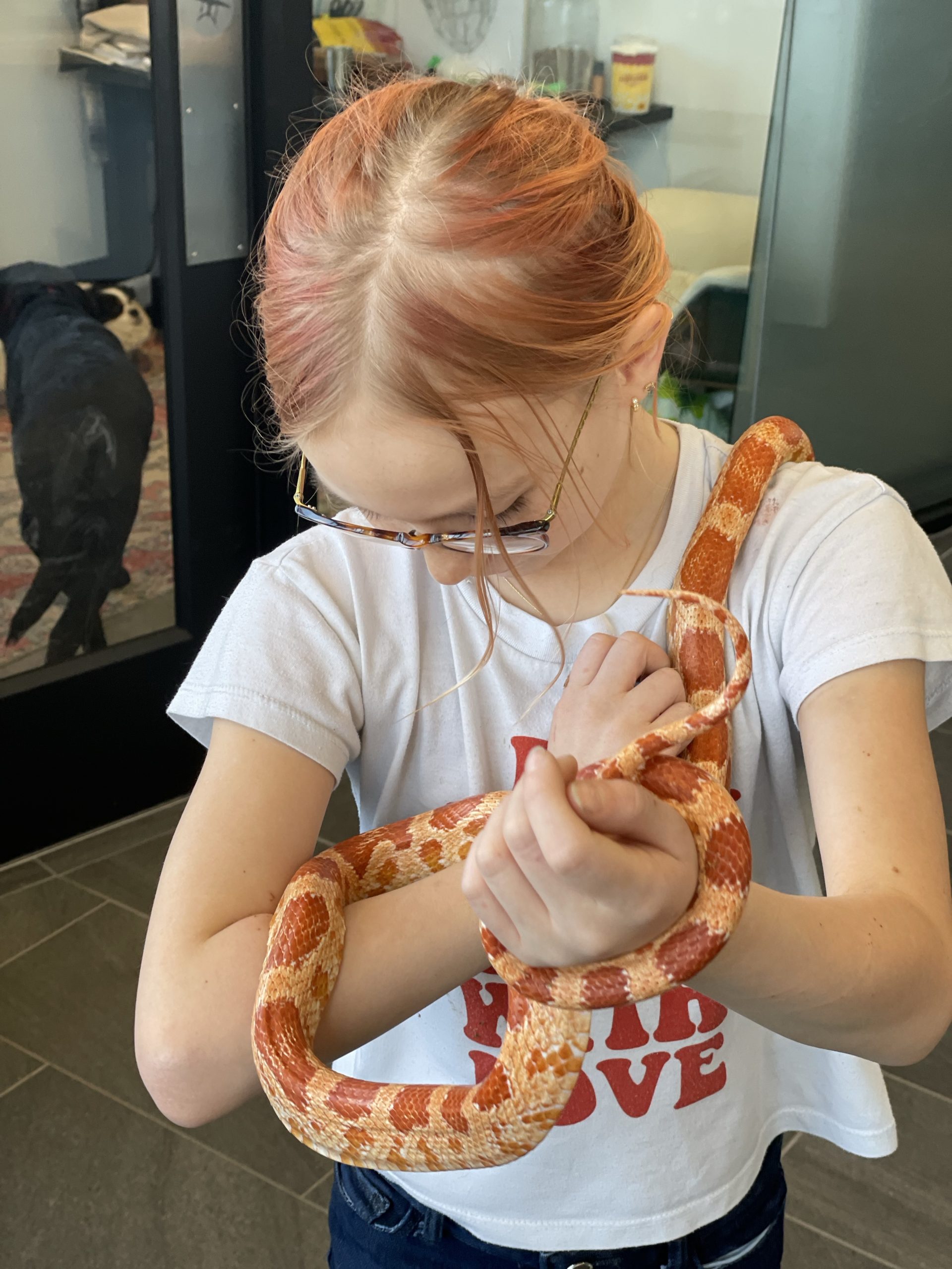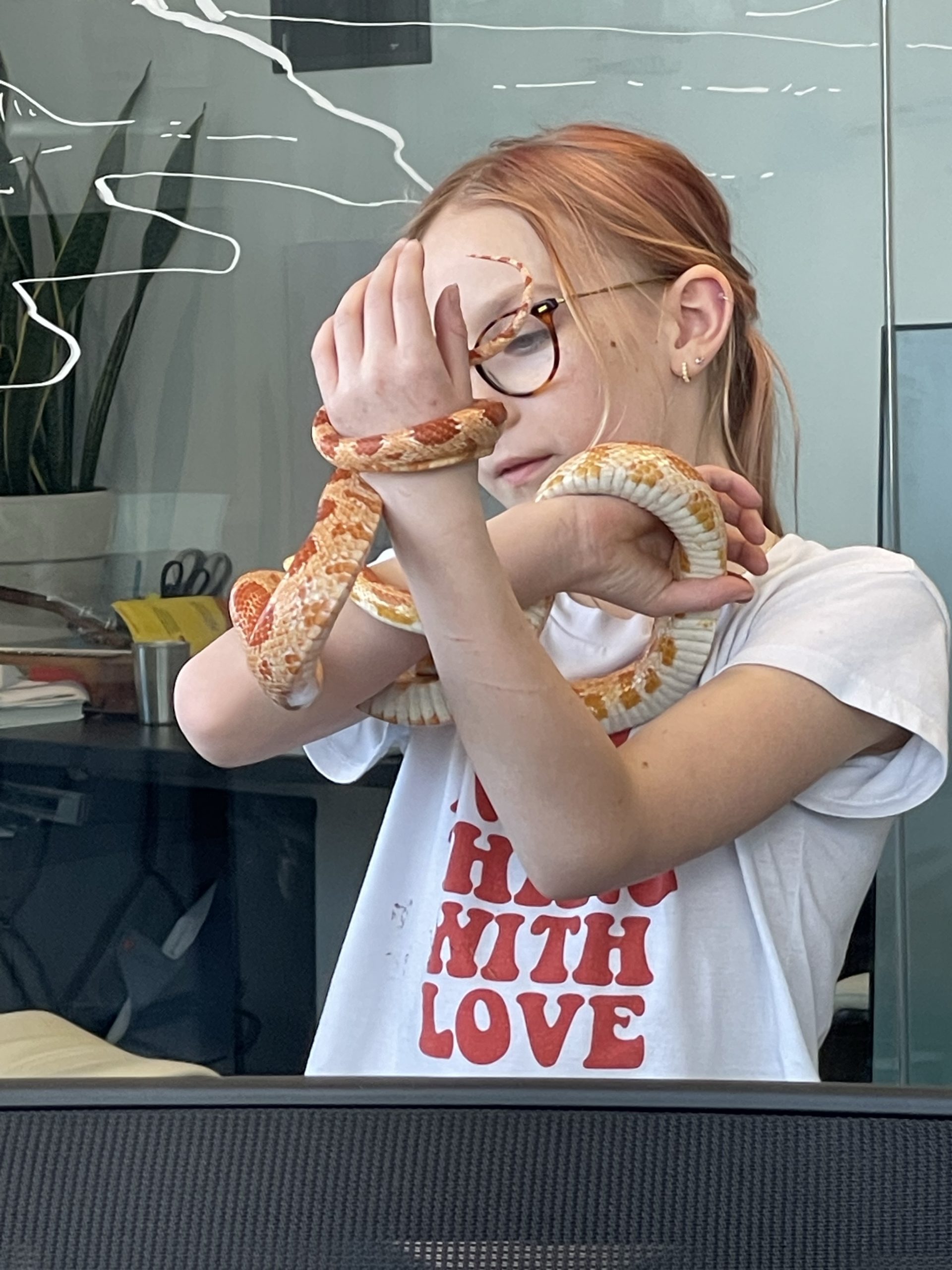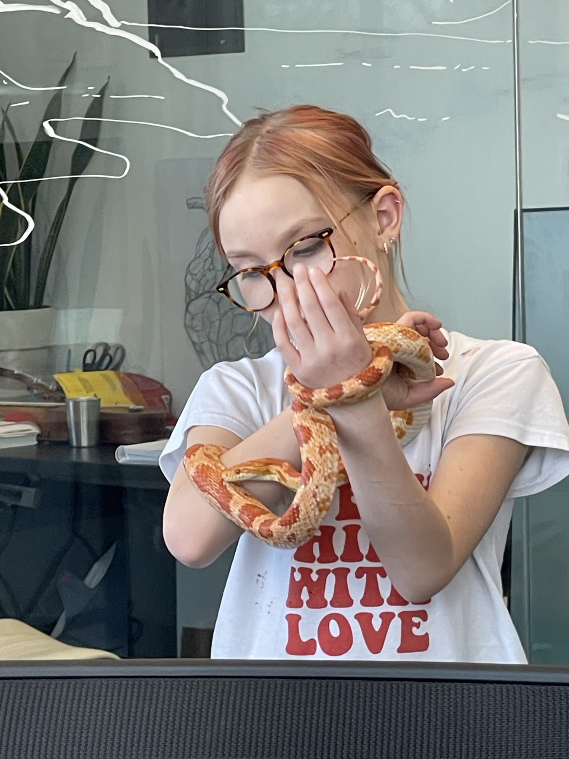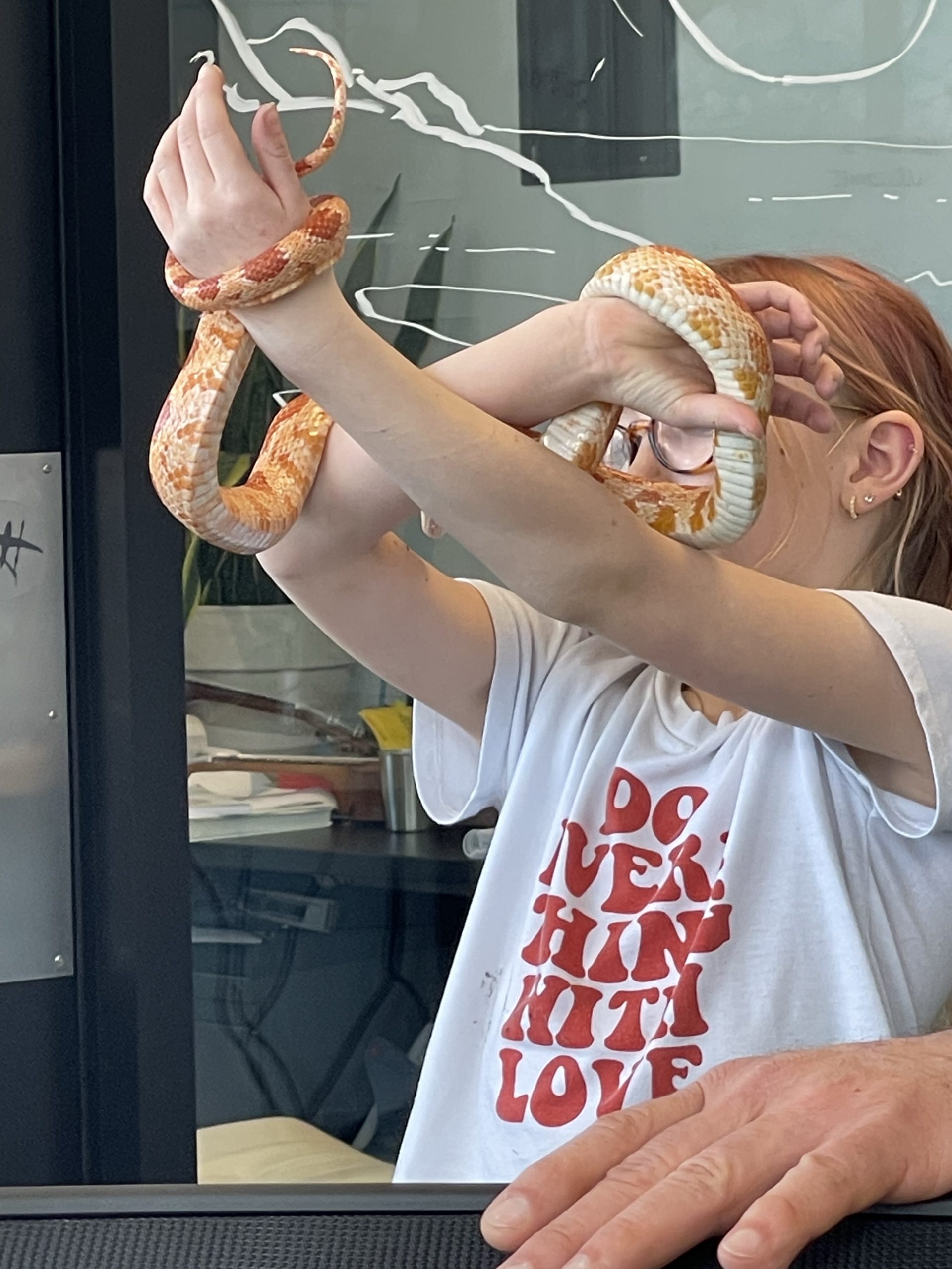 Then A cool surprise at work… My good friend aaron brought in his snake… Call Clementine. She’s a rare covering. I thought her coloring really matched her friend Ruby’s coloring… We took lots of turns handling snake… Such a cool creature