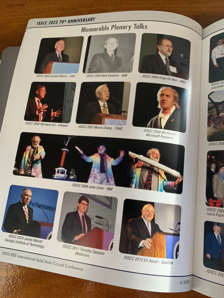 My friend Xin is out this week at the International Solid State Circuits Conference.( ISSCC) ISSCC is the bigist and most important circuits conference in the world. Its really the heartbeat of the electronics industry. . This is the 70th year os ISSCC.. and every decade they put out an anniversary booklet. Xin sent me this picture of one of the pages. It calls out memorable Plenery talks during the history of the conference… ..It was nice seeing these pics.. also of my good friend Nick !