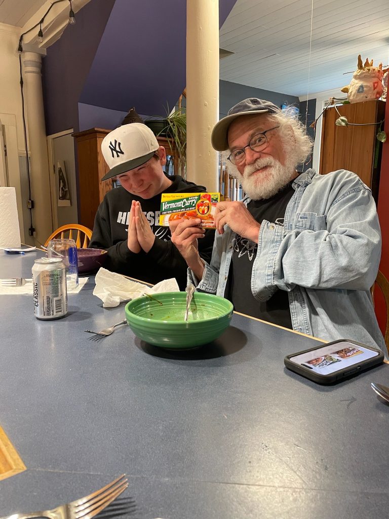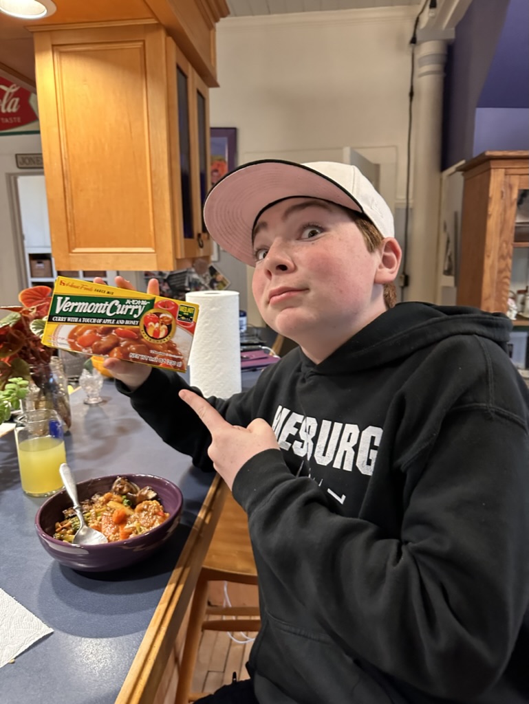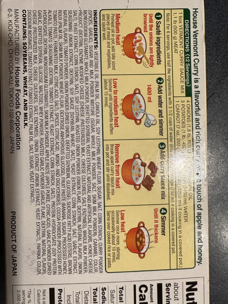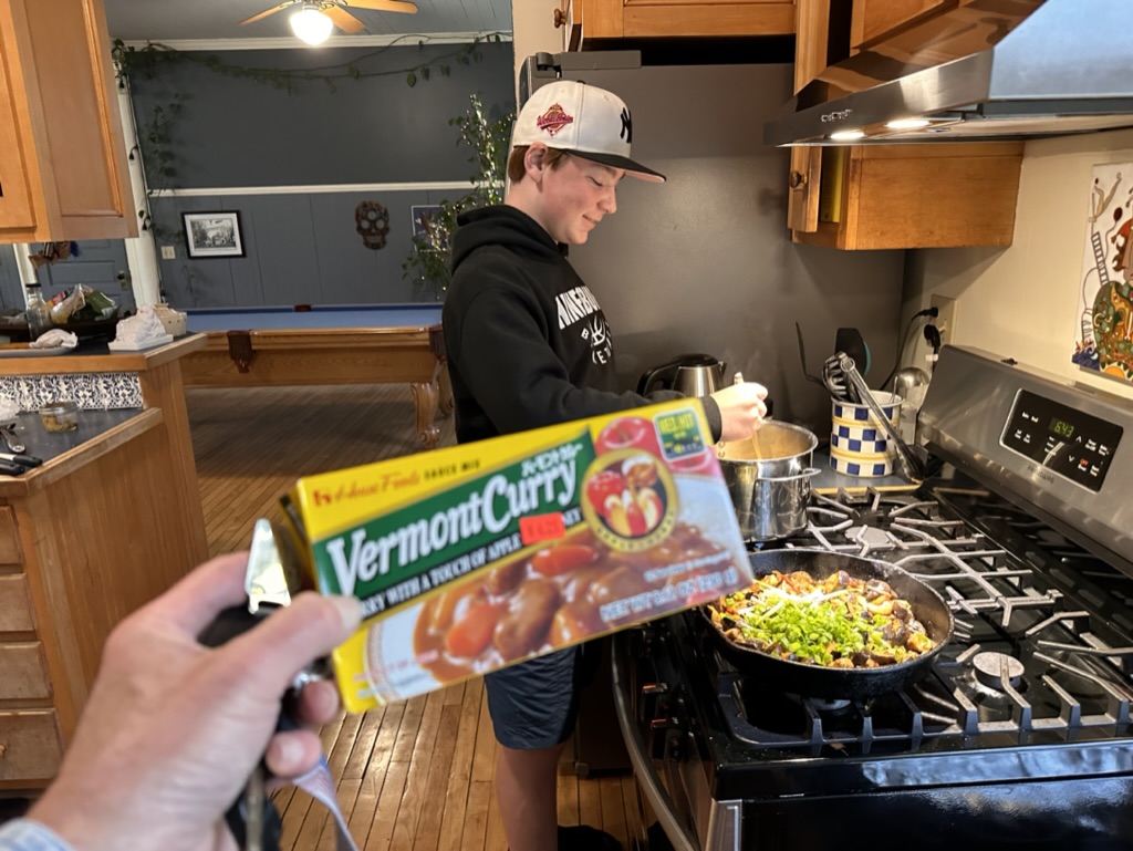 That night we all made ‘Vermont Curry’.. Diane and Finn had found it at Sakura.. our favorite Japanese restaurant. Vermont Curry is famous in Japan because of a food fad back in the 70s(?) When apples and apple cider vinegar were thought to have great health benefits. Weirdly the stuff got and stayed famous in japan.. even though it has neither apples or apple cider vinegar in it. You can find it anywhere .. even in gas station groceries like I did here many years ago. Look at the ingredient list !