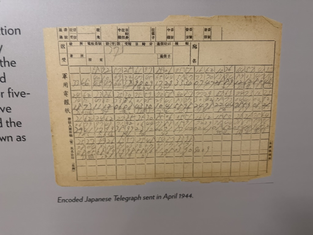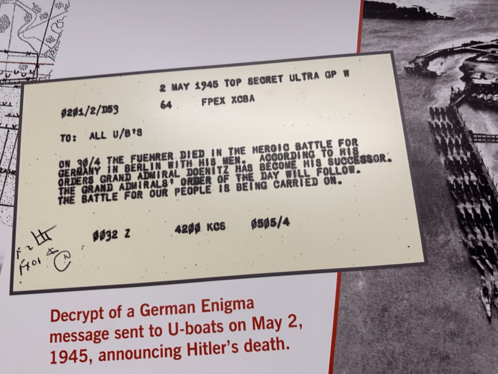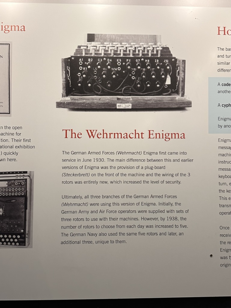 I particulalry liked seeign the equipment including the German Enigma encoding engines and the first digital computers built buy the british to help decode the ciphers. I loved the stories of how the crypologists worked through the complicated moving codes.. It was often an error.. like a retransmitted message that provided the crucial clue needed to decode a secret message.