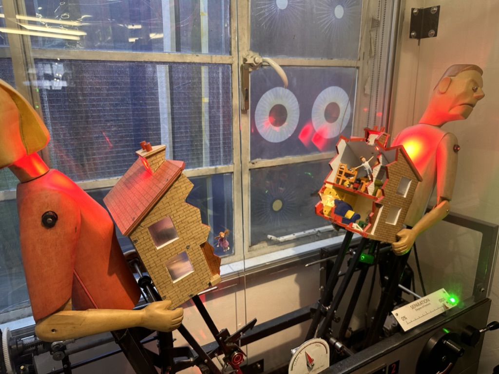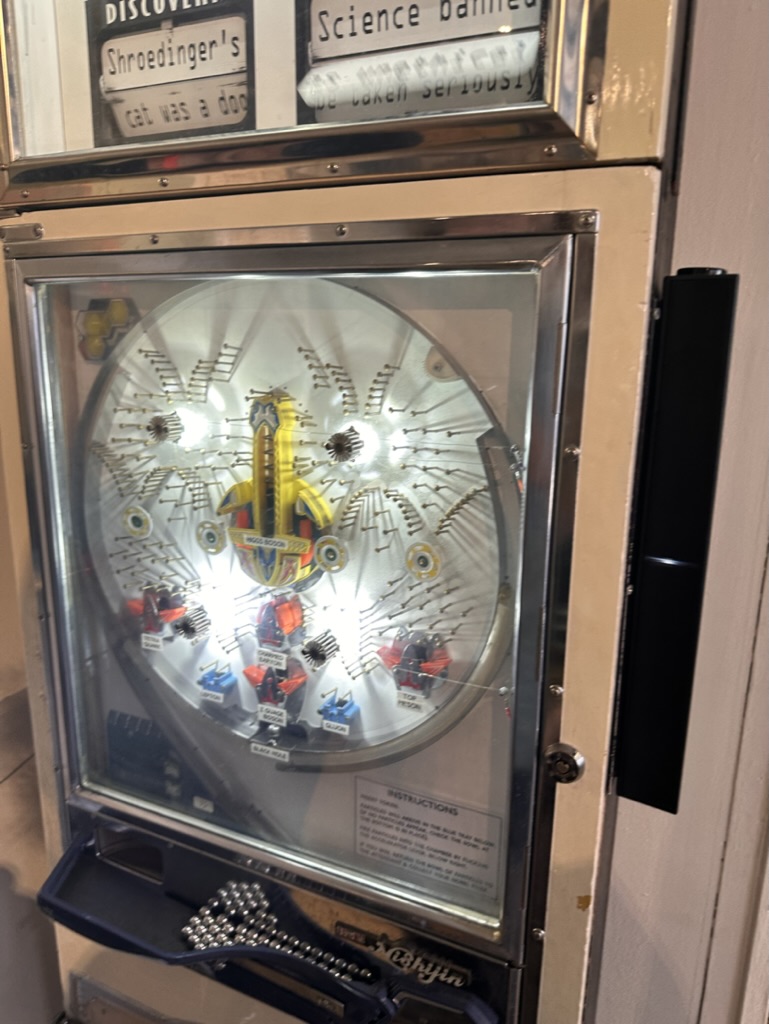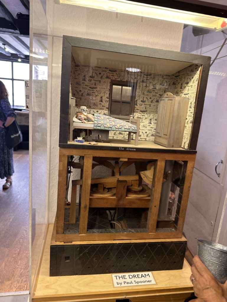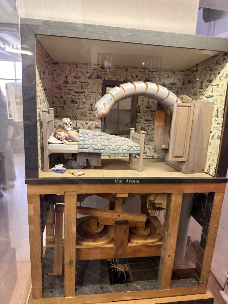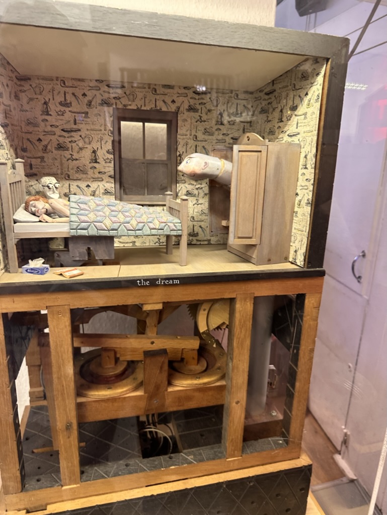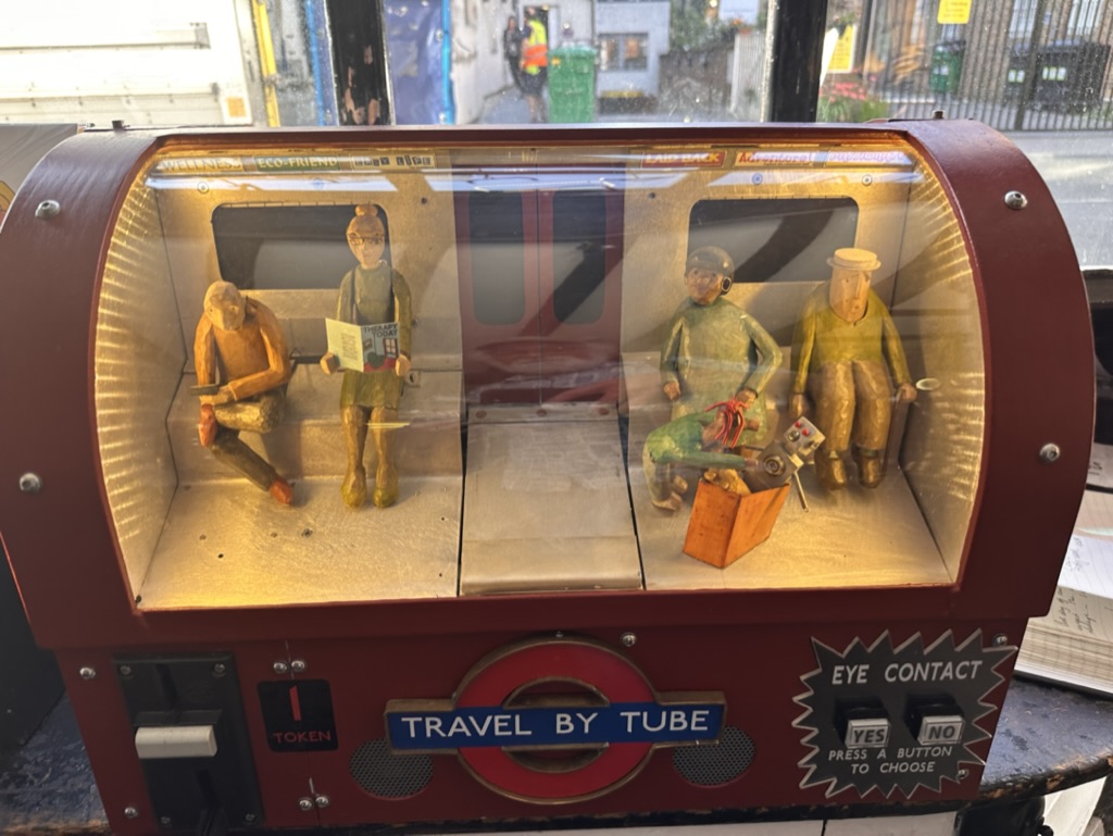We went eight from our train to the Museum of Novelty Automation . It is a small place that shows the amazing contraptions from Artist and Inventor Tim Hunkin.. We first came to know his work from the wonderful water clock that once was in Neils Yard.. We used to visit when Diane and I lived in the UK from 1984-86 . The clock is no longer there.. but this museum had more than a dozen of Hunkins peices.. >. You baught tokens..and used them to interact with the exhibits.. they were so amazing and fun ! FOr example.. you put you hand in a cage where an animated dog luncges and growlss a, slobers and snaps at your hand.. the longer you keep your hand in there .. the more you win. Or a game you play by steering a runnign man through a forest of cell phone zombies.. people walkign while looking at the phones… Or another where you put an object into a try and an automata descides whenter its art or not.. or an eclipse booth, or nuclkear control rod insertion gamwe with a defective clw.. or … or .. or…. .. it was nuts !