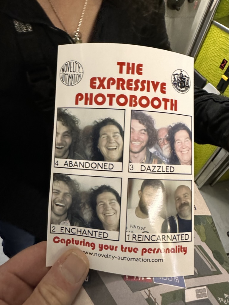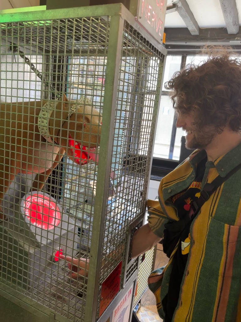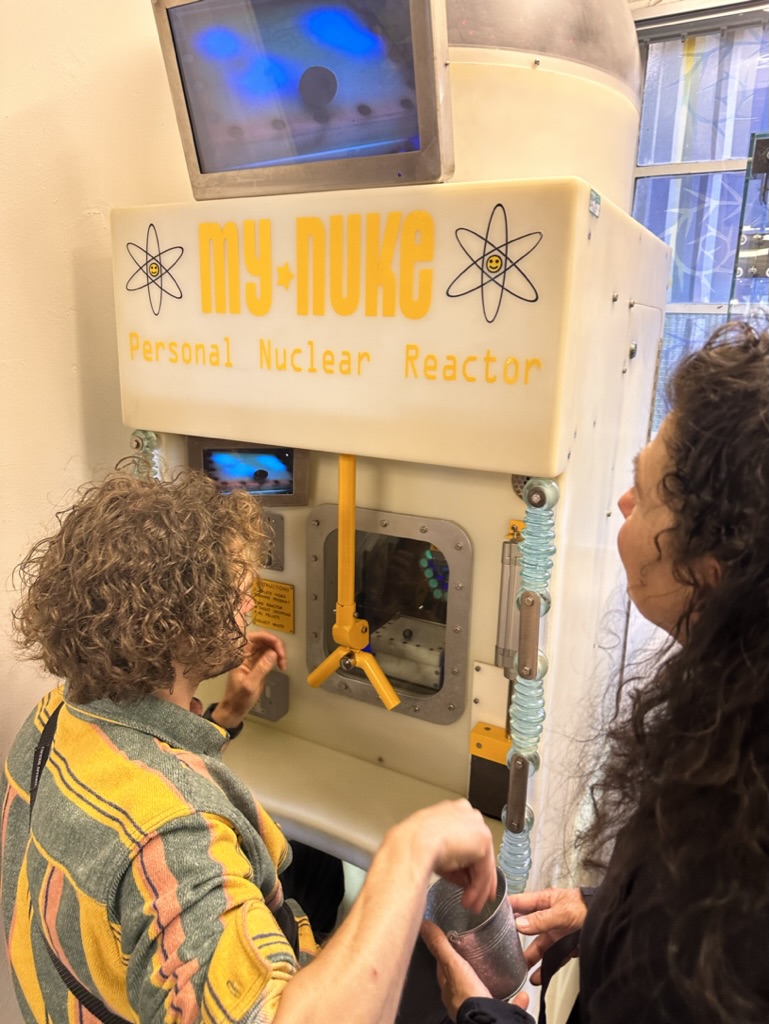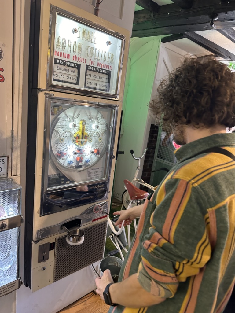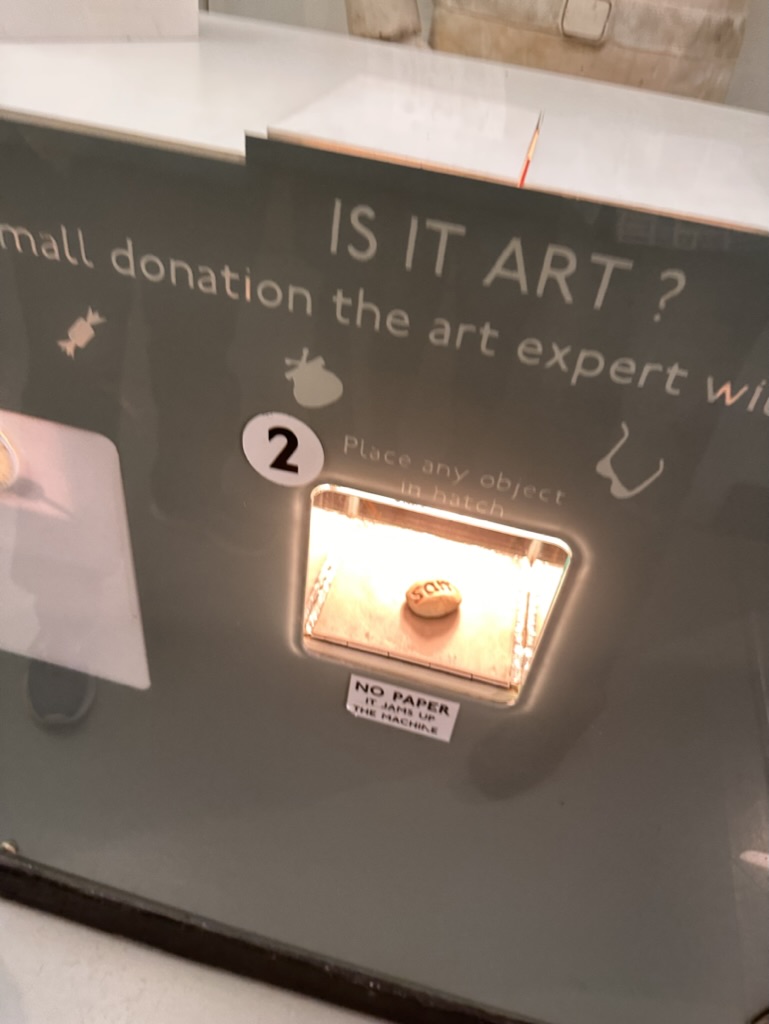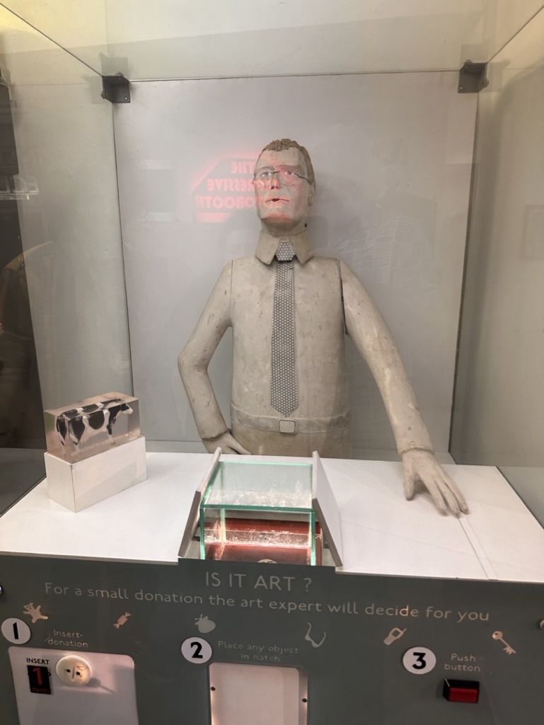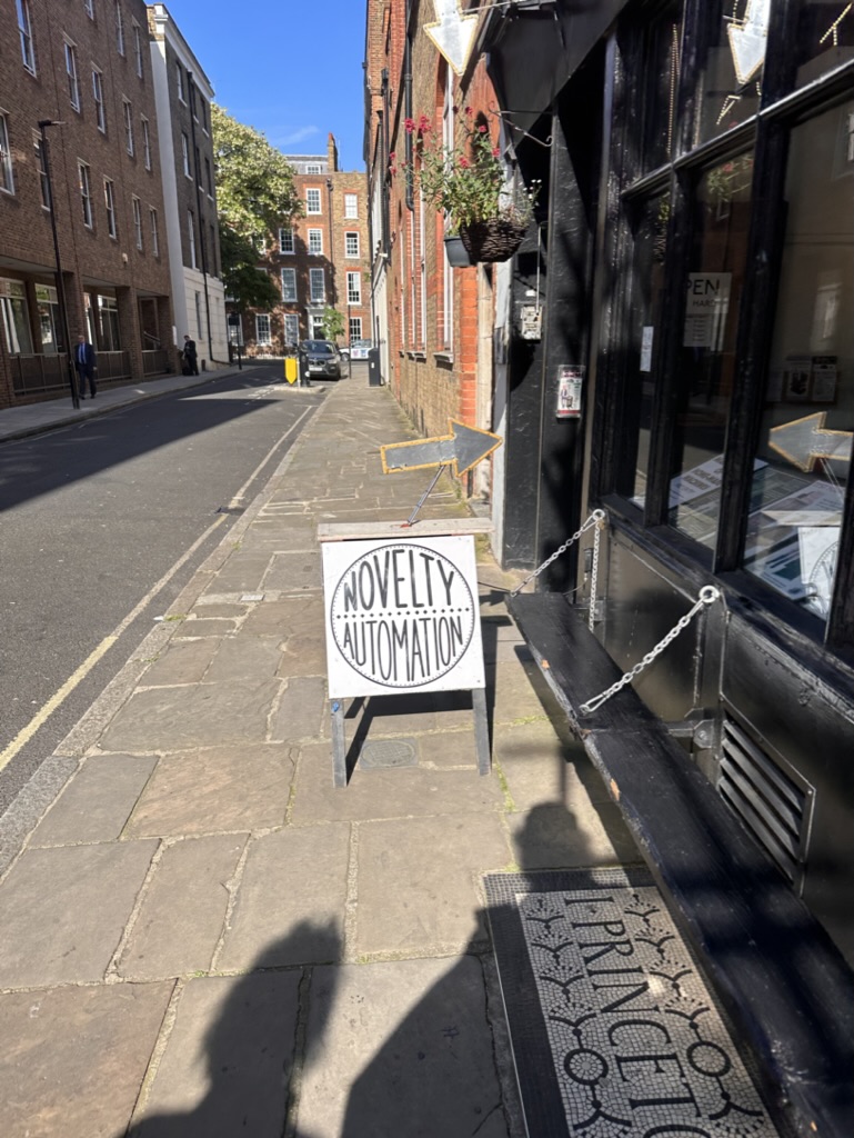 We went eight from our train to the Museum of Novelty Automation . It is a small place that shows the amazing contraptions from Artist and Inventor Tim Hunkin.. We first came to know his work from the wonderful water clock that once was in Neils Yard.. We used to visit when Diane and I lived in the UK from 1984-86 . The clock is no longer there.. but this museum had more than a dozen of Hunkins peices.. >. You baught tokens..and used them to interact with the exhibits.. they were so amazing and fun ! FOr example.. you put you hand in a cage where an animated dog luncges and growlss a, slobers and snaps at your hand.. the longer you keep your hand in there .. the more you win. Or a game you play by steering a runnign man through a forest of cell phone zombies.. people walkign while looking at the phones… Or another where you put an object into a try and an automata descides whenter its art or not.. or an eclipse booth, or nuclkear control rod insertion gamwe with a defective clw.. or … or .. or…. .. it was nuts !