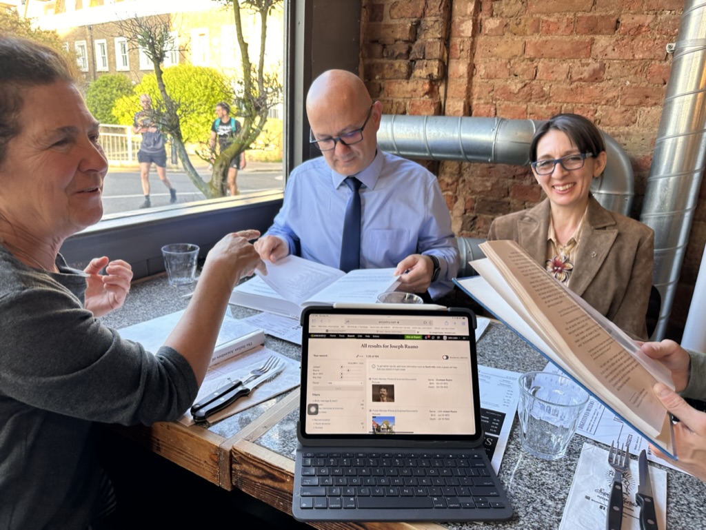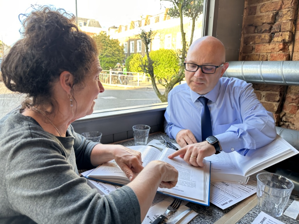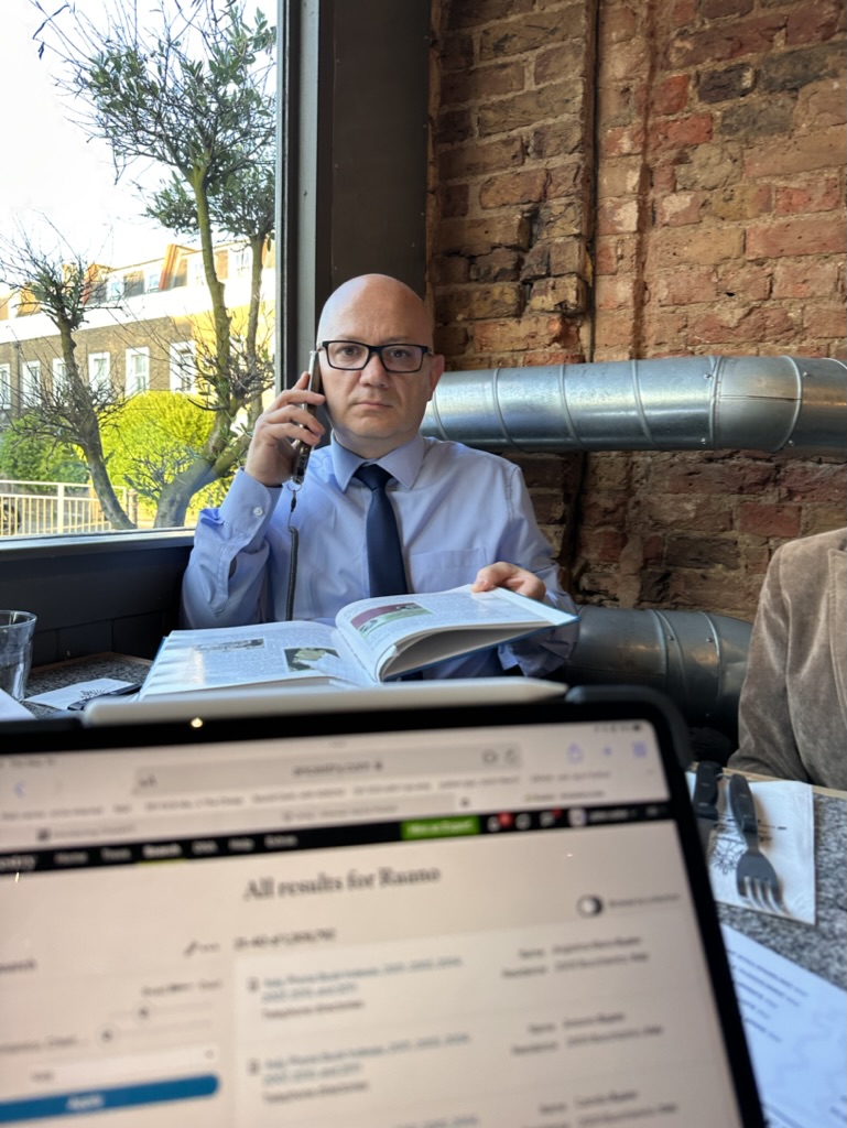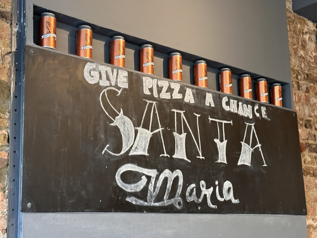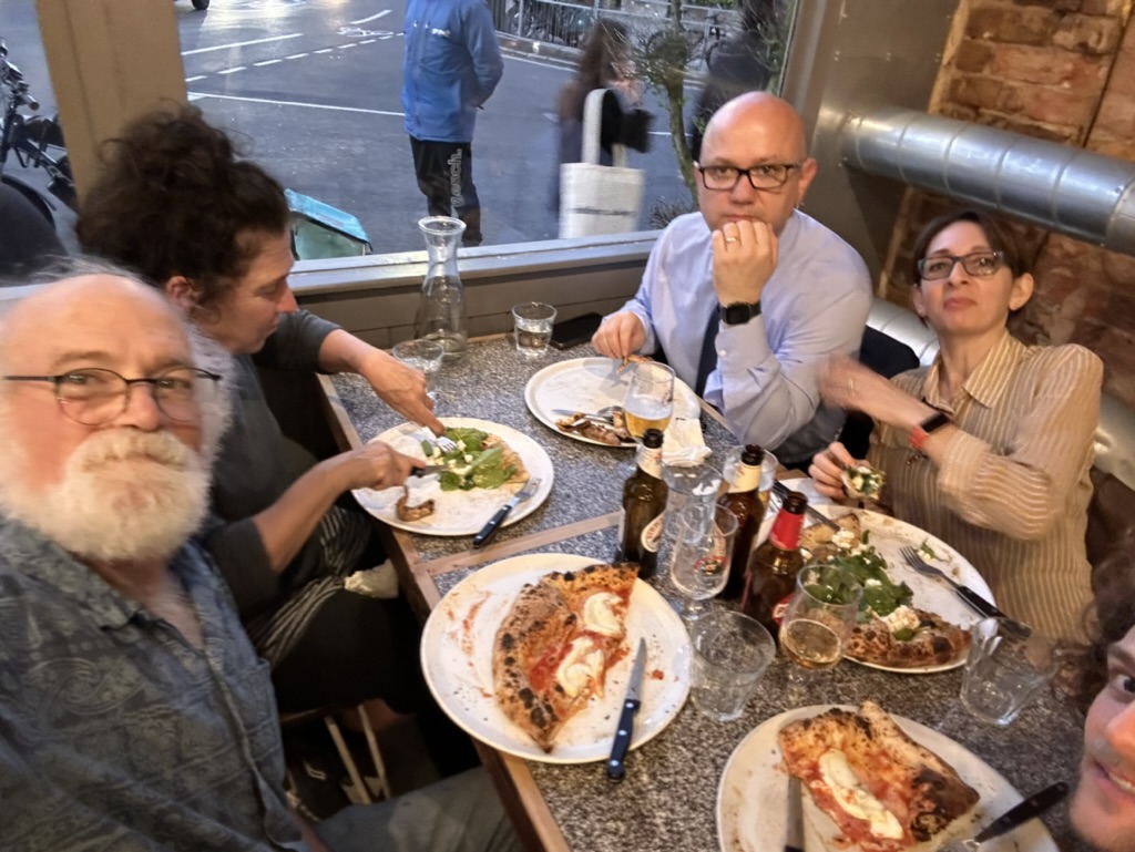 That was already a very full day.. but it wasn’t over by a long shot ! We tube the tube back to the house. Took a short rest.. then began a mile walk to Santa Maria… a pizza place chosen by Diane’s distant cousin Massimo.. We’d made connection with Massimo by way of Diane’s brother Steve who’s done extensive genealogical research on both sides of his and Diane’s family (and his wife’s family as well) . Steve had reached out to Massimo several years ago by mail after he and his wife Gulia had moved from Italy to England. .. Steve lost track of Mssimo a couple of years ago… . I was able to reconnect with Massimo on Linkedin and we’d made a plan to meet up when we were in London. Massimo had chosen the Santa Maria Pizzaria because.. he and Gulia felt it was thepest aNapolese style pizza outsode of Naploi… Massimo said it was even better than the pizza in Napoli !