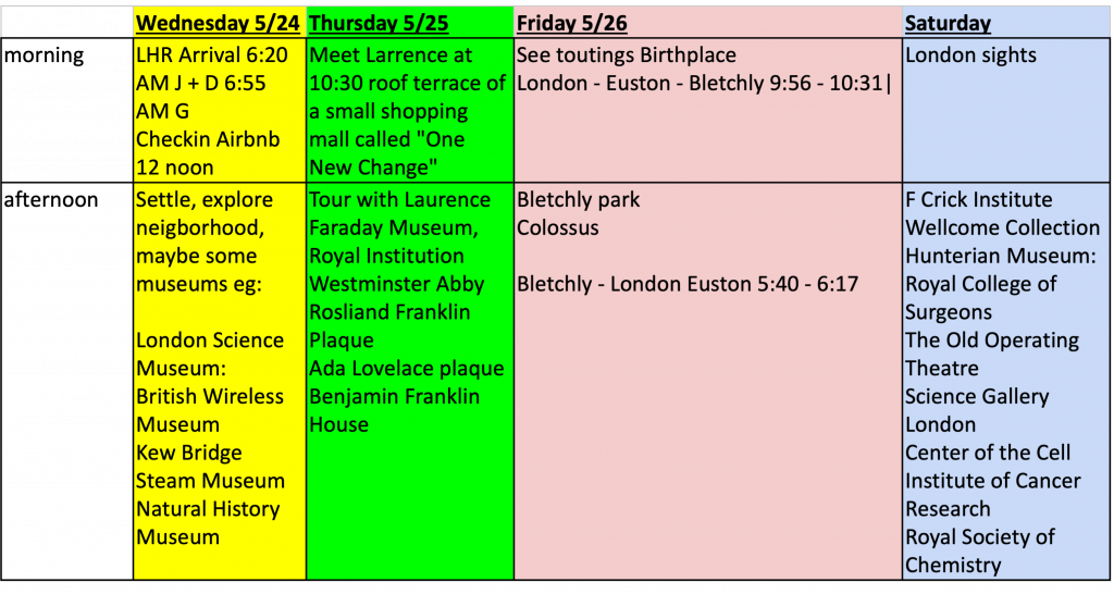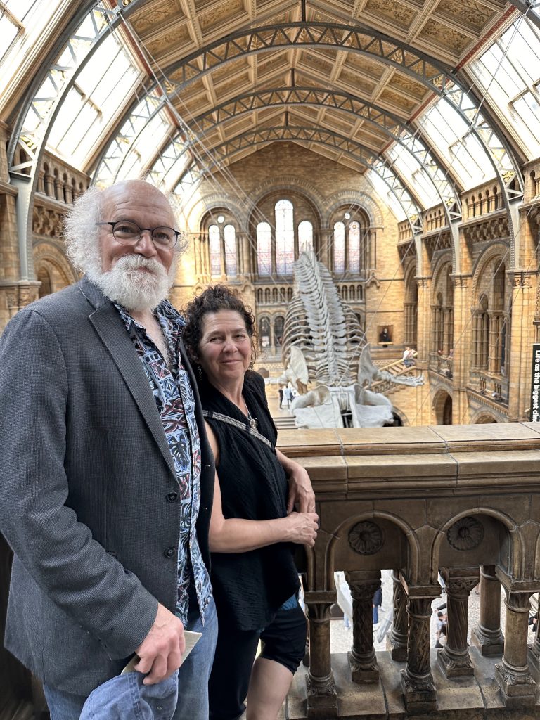 We took the Tube to town , grabbed a bite in Regents park.. then wandered over to the Natural History Museum and checked our bags. This was stop 1 on our ‘Science Obscura’ trip. It was an idea Gabe had come up with to visit places of scientific interest between his field (biochemistry) and DIane and my fields (Physics and Engineering). With eh help of a zillion google searches, webstes, youtube and eventually ChaptGPT we came up with he following Itinerary.. (which in hindsight worked very. very well !)