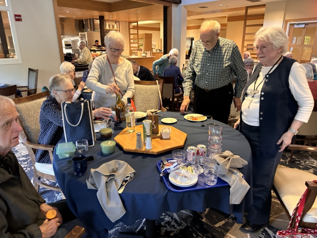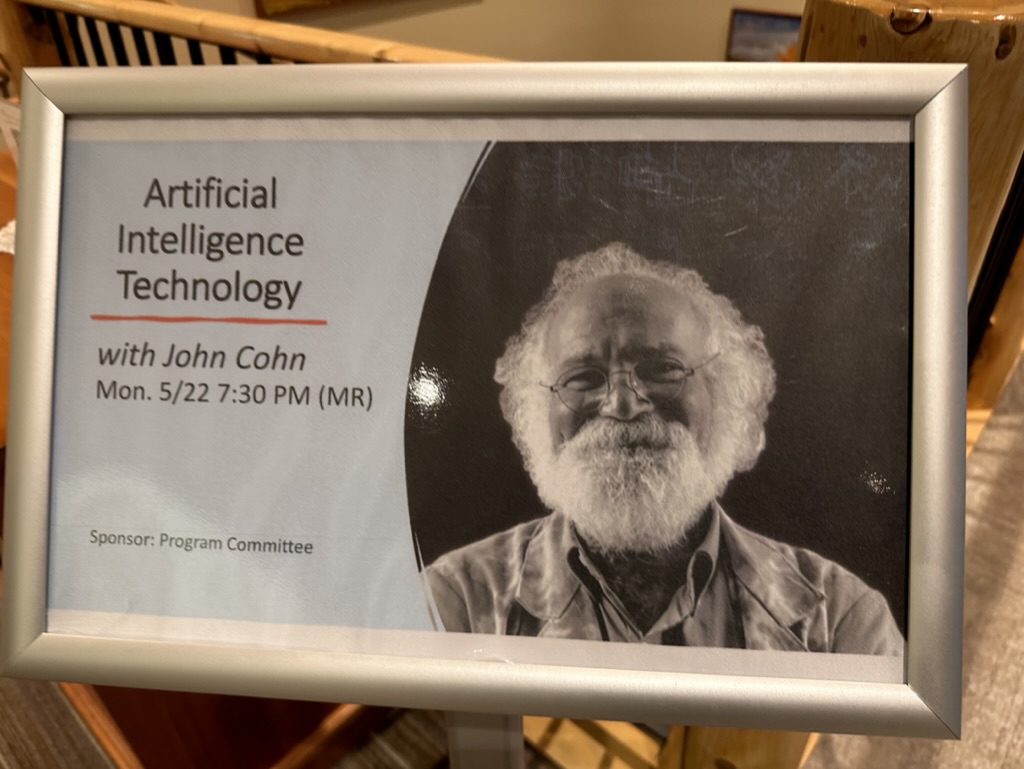 This evening I gave a long postponed talk on AI to a group from Wake Robin Community. Wake Robin is a ‘life plan’ community where folks can live out the rest of your lives. Its an amazing place with many very active seniors… they host tons of talk and outings… and I was honored to be asked to lead a conversation on AI.. AI’s a topic on everyones mind these days. I had a nice dinner with my host Joyce and some of her friends before the talk.
