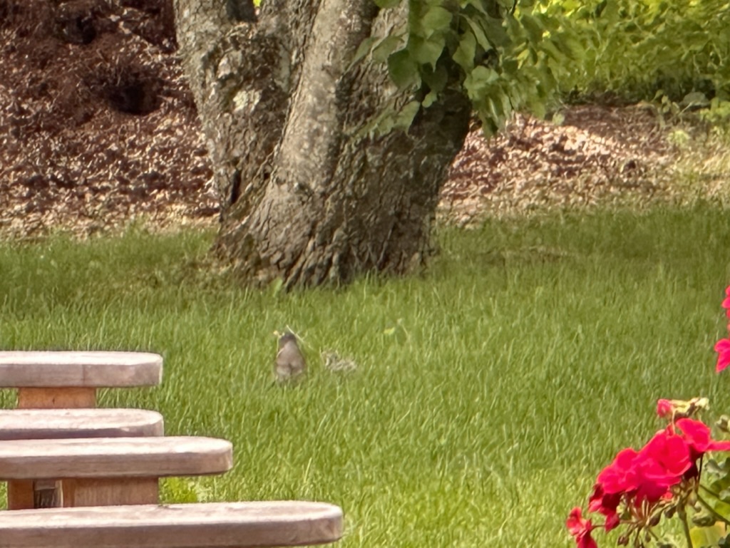 As I was walking to the beach last night I came across there baby birds huddled together on the grass under a lilac tree in our yard. I could see the nest they must have been in . They were very young.. they had feathers.. but couldn’t fly.  I assumed they’d fallen out of the tree.. I  didn’t know what to do. Diane and I did a little research online and read that it was much more likely that the parents had kicked them out of the nest and would be looking after them.. sure enough  this morning the baby birds were still there and mam and poppa bird were takign turns feeding them..