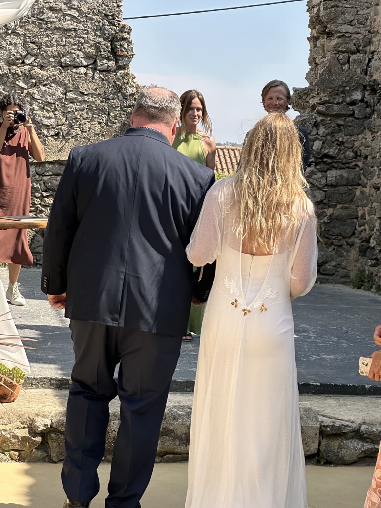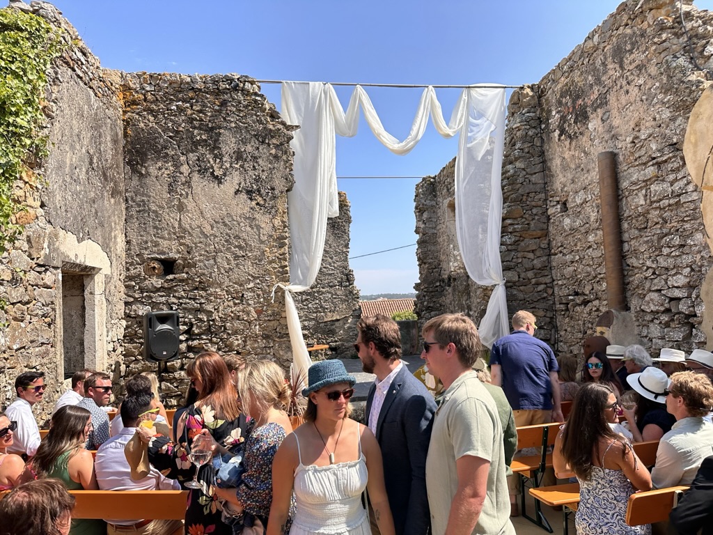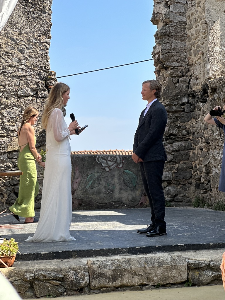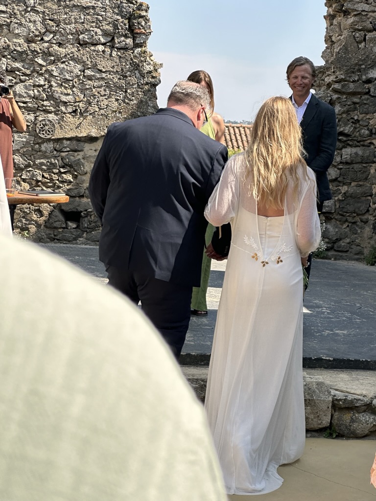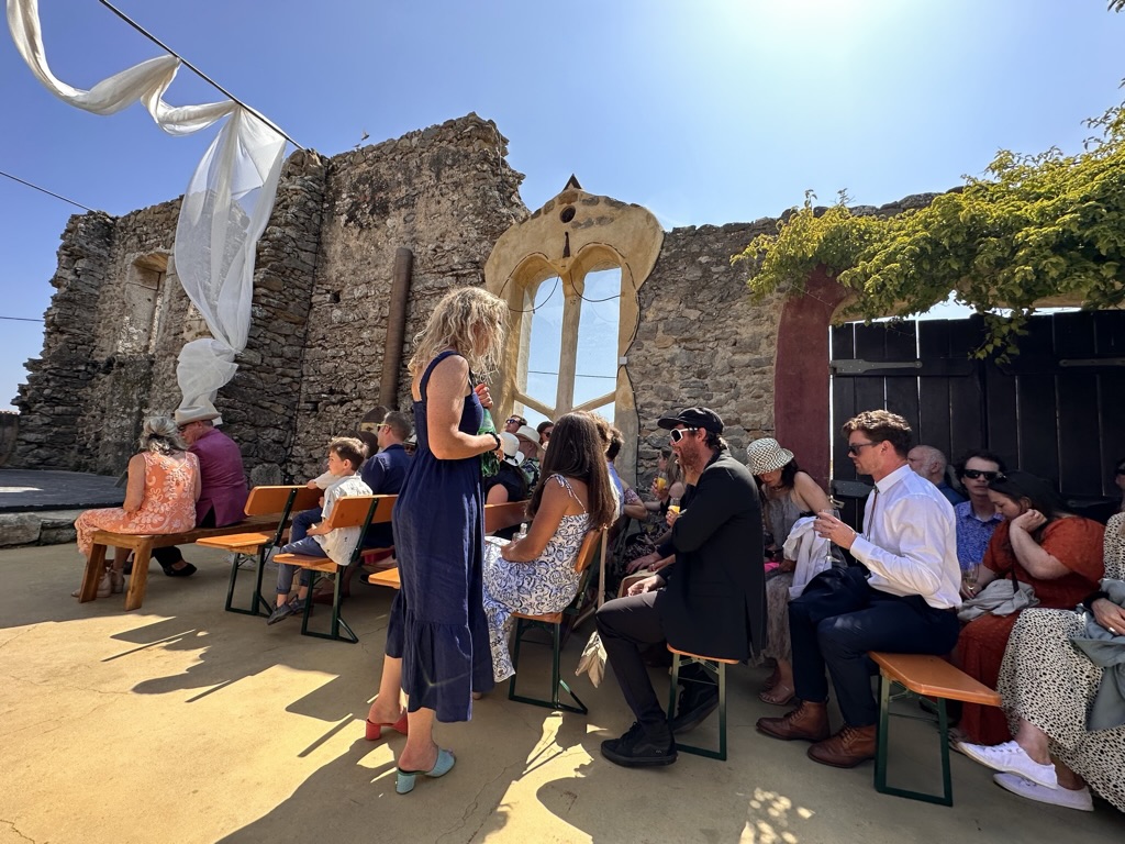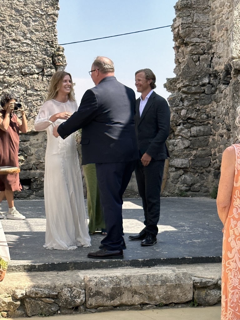 In a short bit. we were all called into the room where the wedding would be.. I say “room” .. but it was actually a many hundred year old runoi of a monestary that had long said goodbye to its roof :-).. We all sat down and waited.. The weather and setting were truly perfect !