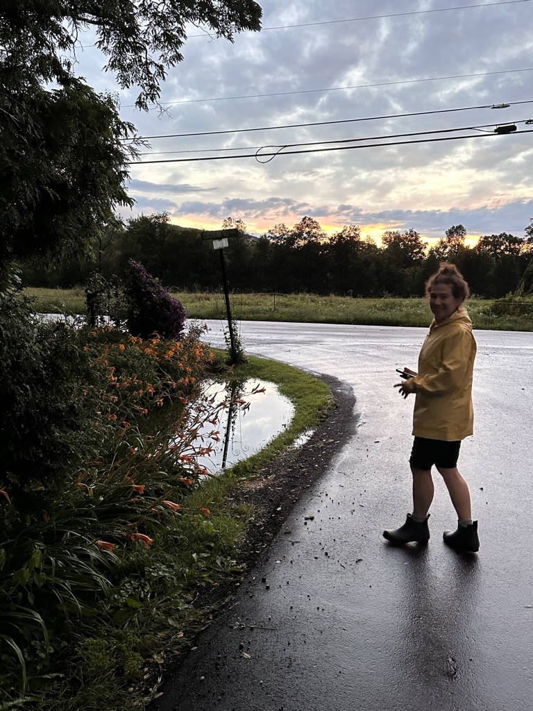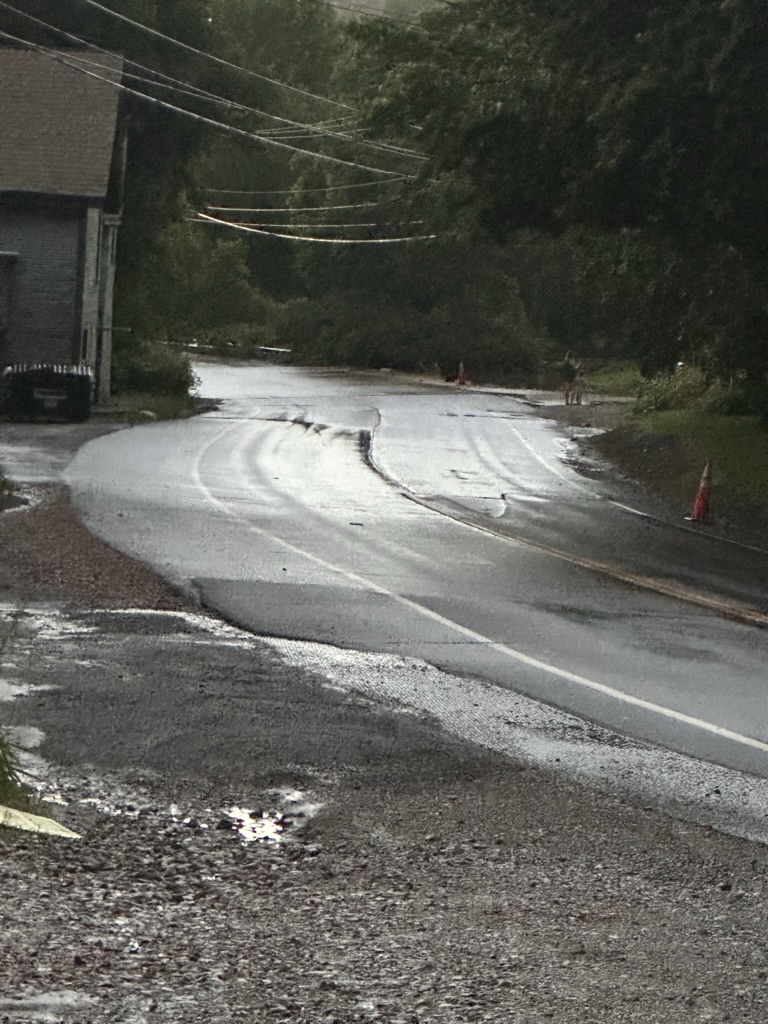 By the time we dropped the car and came home. only 30 minutes.. .all the roads into richmond were underwater and closed.. Rt 2, Cochran Rd, Duxbury Rd./. we tried to come back via Fays Corner.. there we found that the small stream that usually runs by the road had come completely over the road.. and it had washed away a good chunk of the asphalt on a section of the Huntington road. We ended up snaking our way through swamp road, Sherman Hollow and Dugway to get back home.