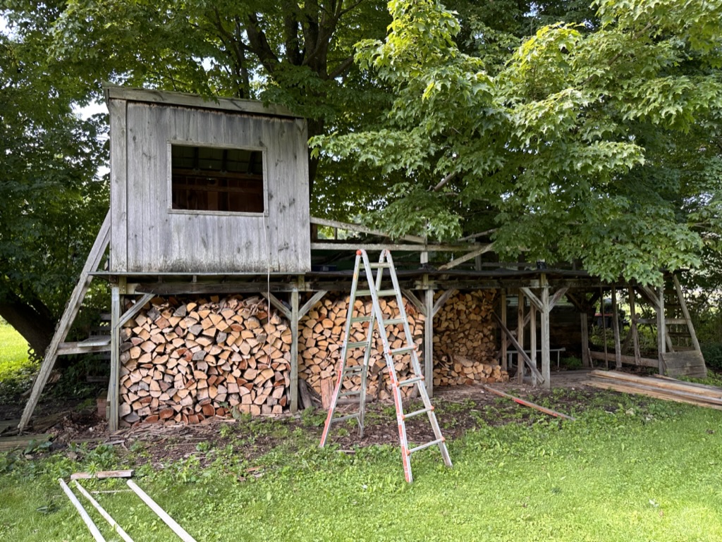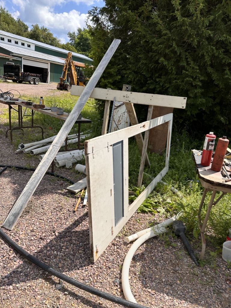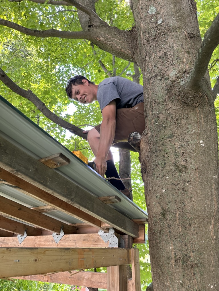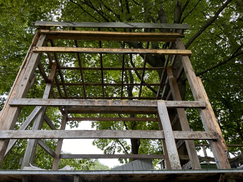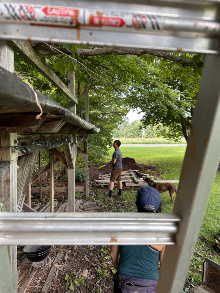 Today we started the demolition of the top of the woodframe. The top is getting pretty rotten after about 20 years ., so we’re working with our  freind Eliot to rebuild it. The big job today was to take down all that rotted wood , tarpaper and steel. It was hard work.. and again a little hearstring pulling. All three kids used that room on top as a fort. Still it feels good to rebuild