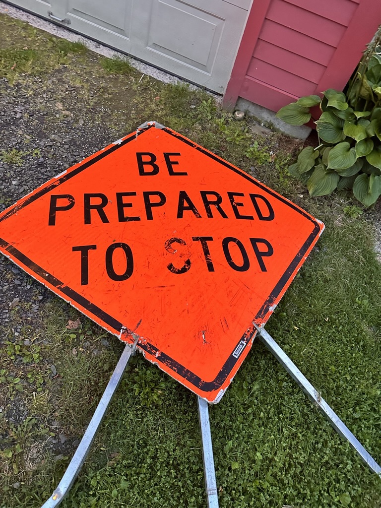 We got hoem and foudn that opne of the road crews had accidentlay lost a sign in our front yeard.. it sauid “Be prepared to stop”..