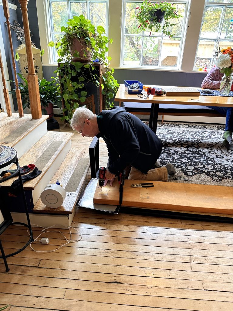 Ever busy george took it upon himself t fix one of the benches from our table (actually hannahs table) tjat we use together so many people/