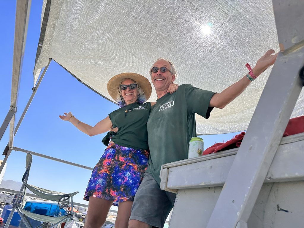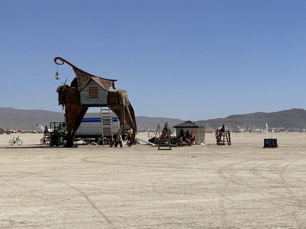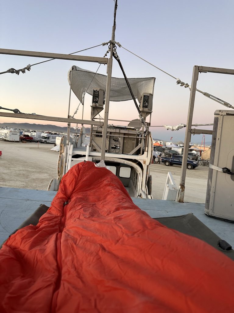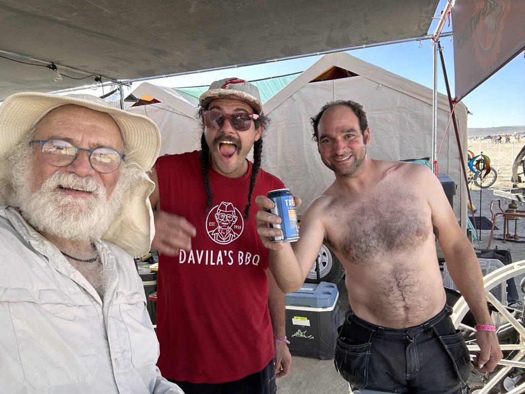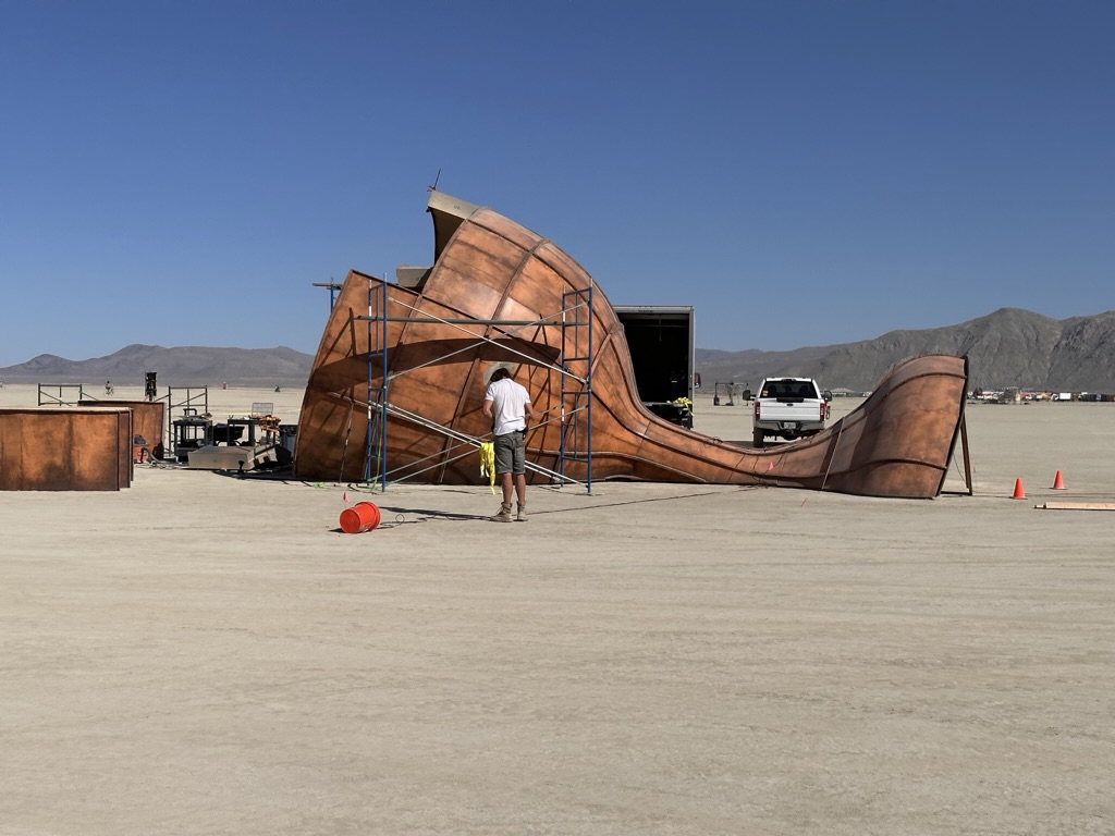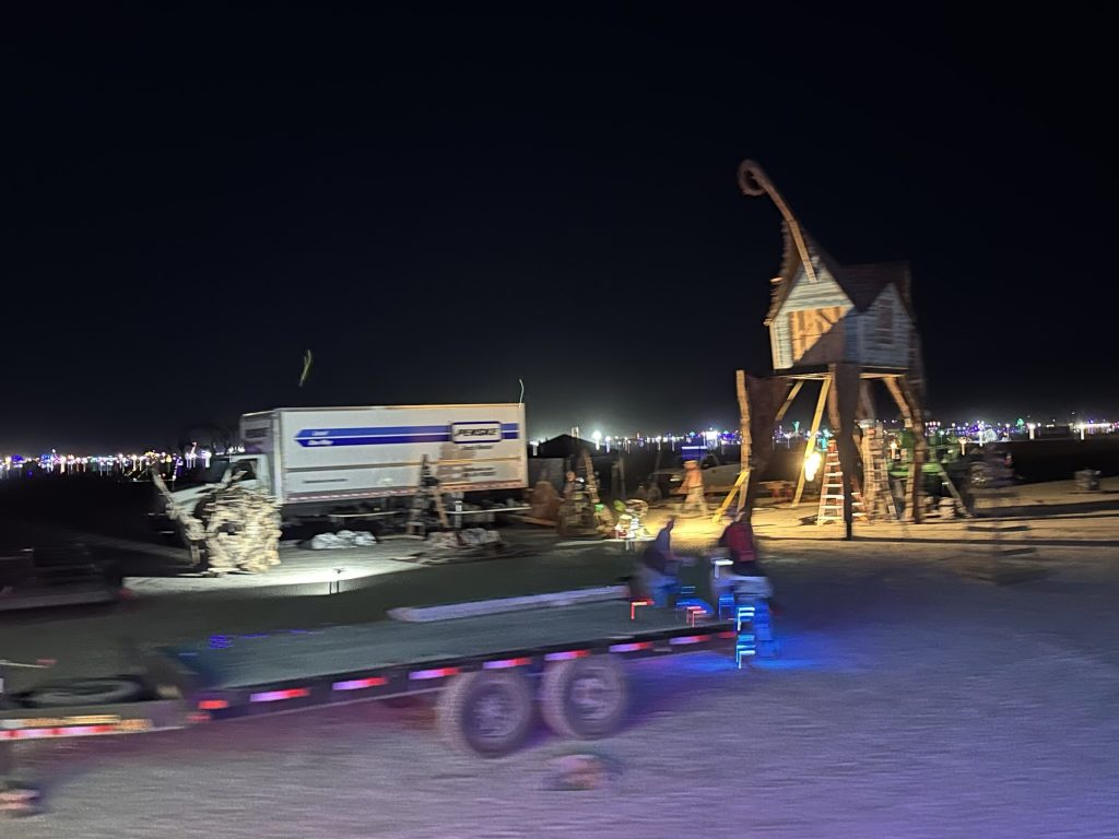 We got up, ate.. and started working. Today was the first official day of burning man week.. and most of our teammates were filtering in. So great to see all my old friends !I’d hoped to spend the day exploring the playa and finding friends. But there were a number of small problems with the fire system that needed work ..I was tryign to get a little more ‘oooomph” out of the poofer.. eventually got it working. Gizzo helped me which was fun. . I didn’t get out to explore until 3… and I had to head out at 6PM.. still had so much fun !