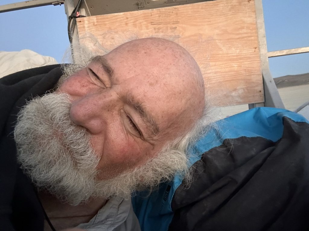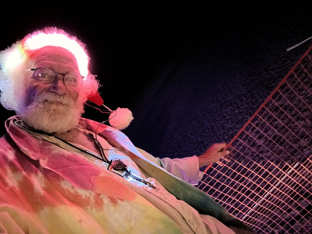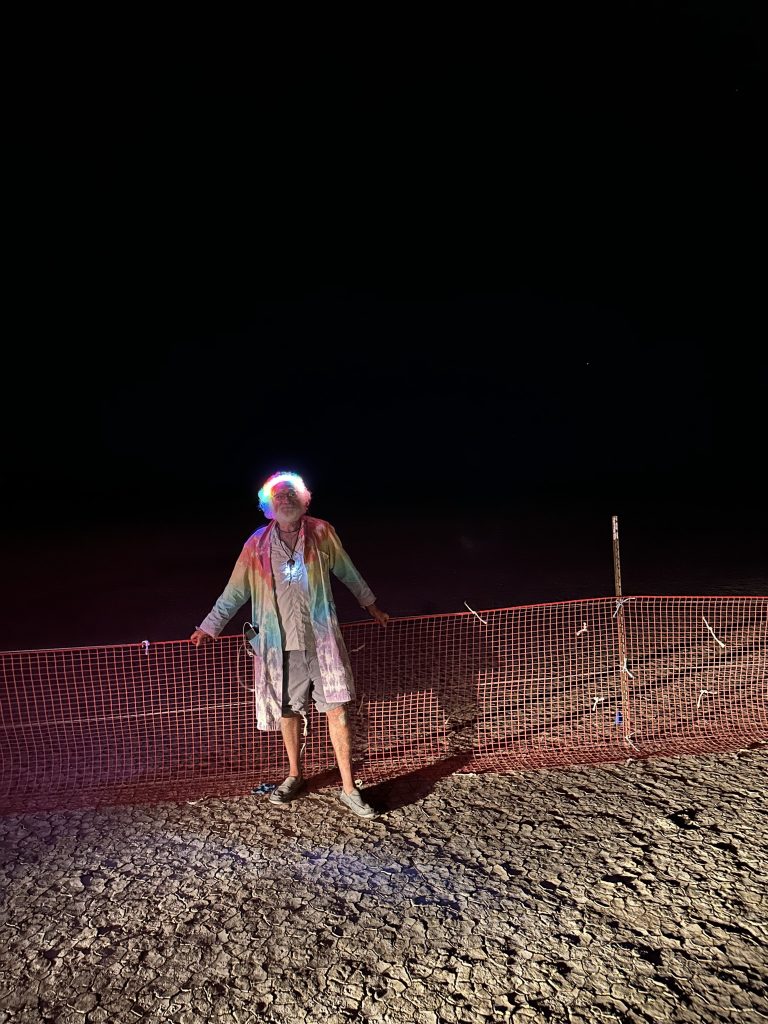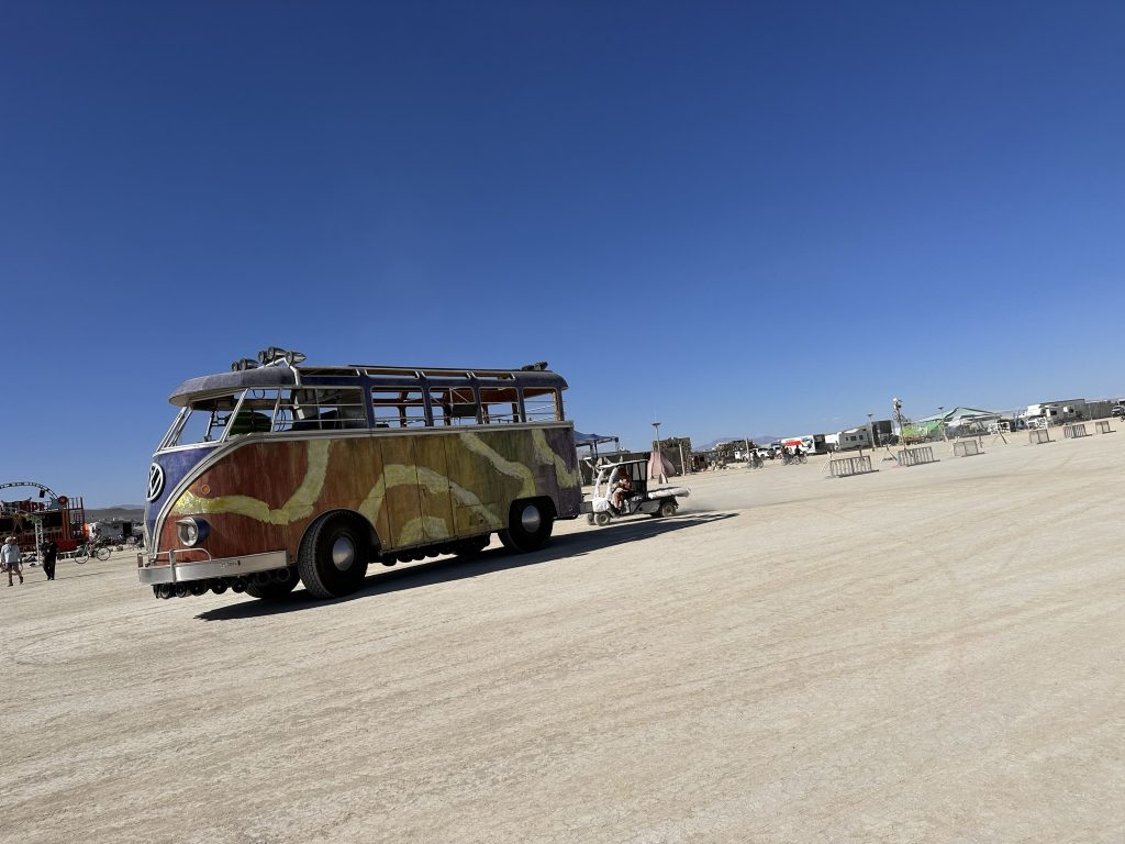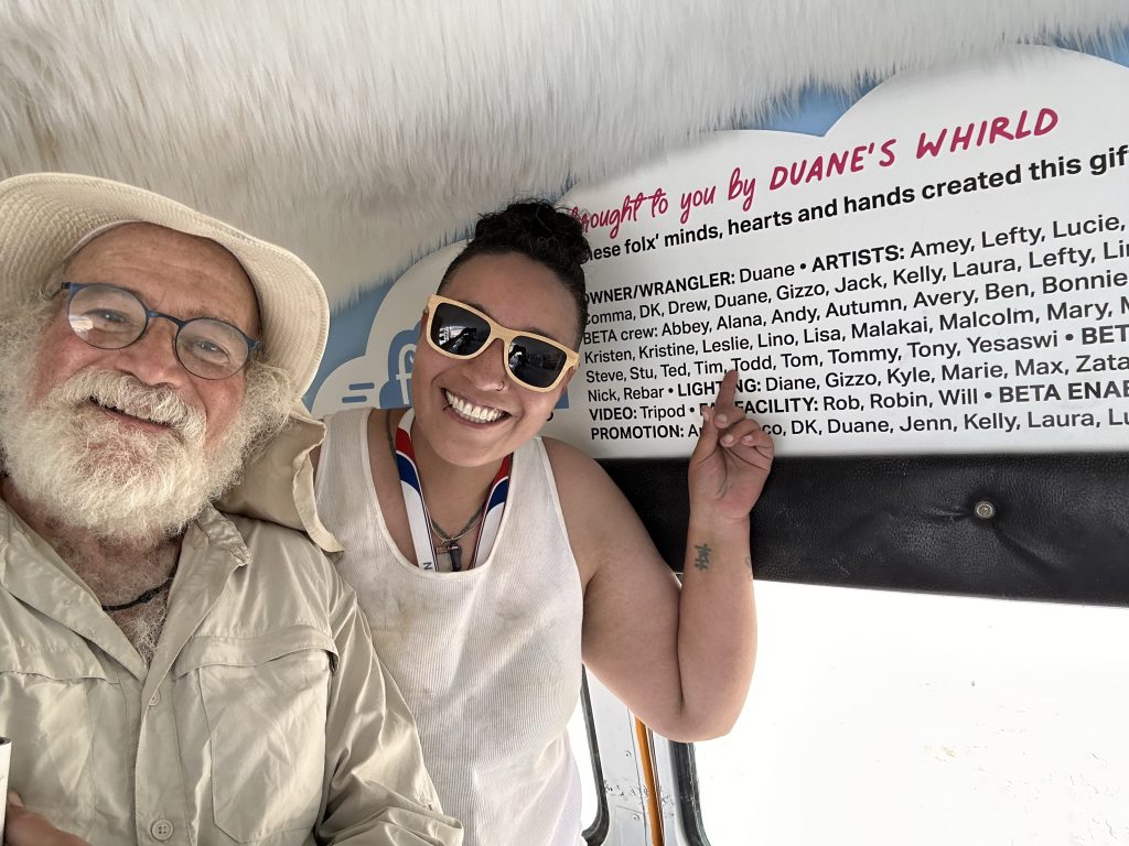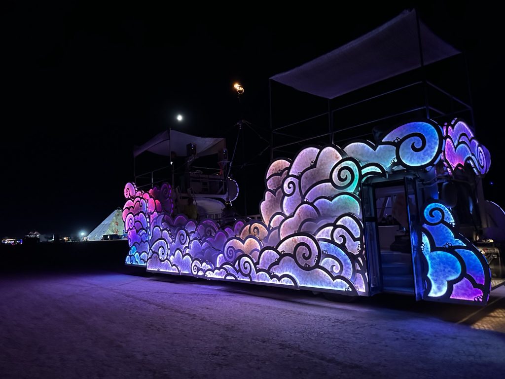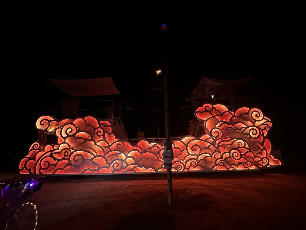 After getting our Night driving permit, Rebar took a few of us on a tour of the playa in Fluffy.It was after midnight .. so technically Sunday already. It meant so much to me to be able to actually drive around in her.. after so much work, this is the only time I’ve been able to participate in the Fluffy experience. Even though there were only 4 of us.. it was like my own private burning man !.. We went out to the trash fence.. which is the outer perimeter of the 25 square mile burning man venue. Got to see some art along the way. We also ran into Danny and Arron … coem to think of it.. the only folks I ran into that I knew outside of our camp