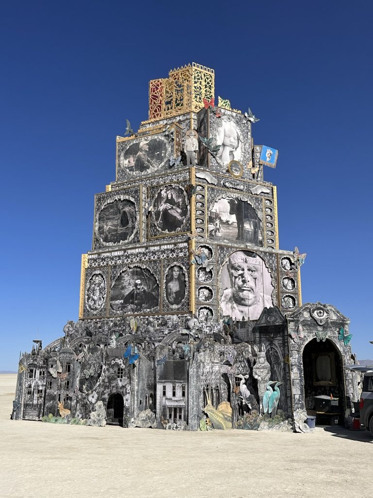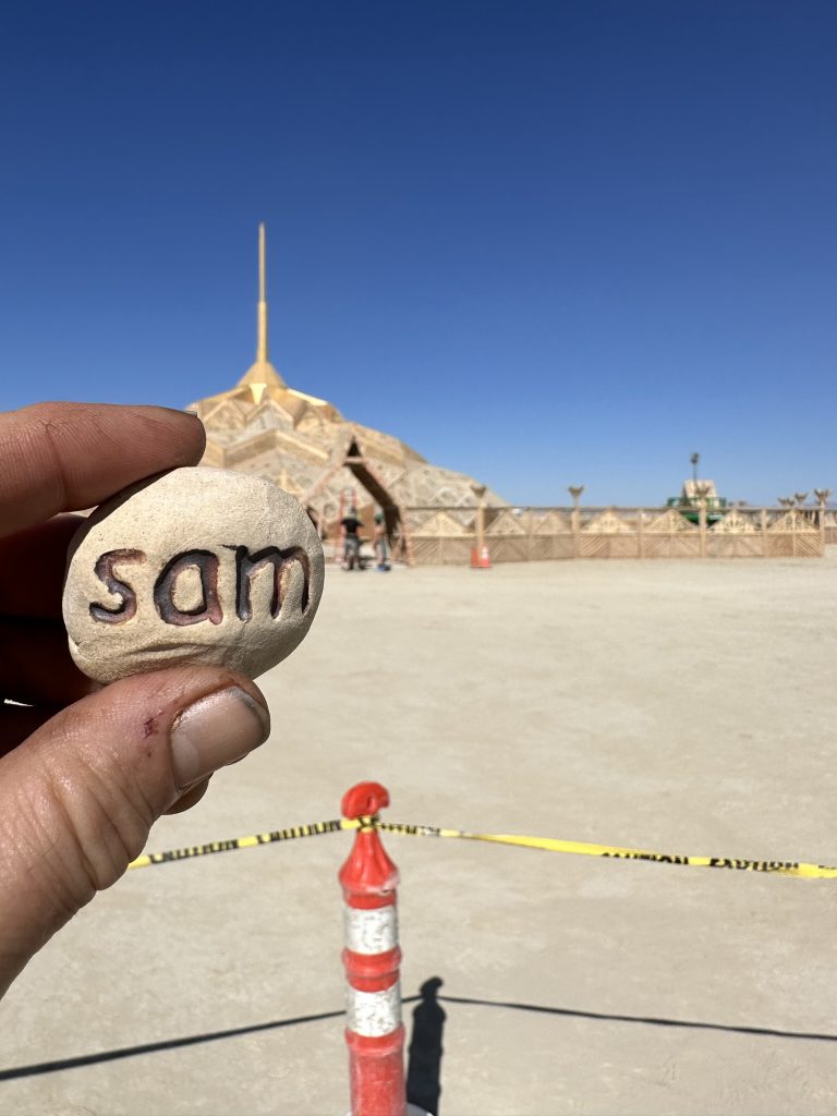 One of my missions was to get a samstone into the temple The temple is a beautiful building where people [put memorial objects and wishes in tribute to others. Its always burnt on the last night of burning man with a totally silent crowd. I always but samstones in there. This year the temple was still under construction because of the earlier rain delays .