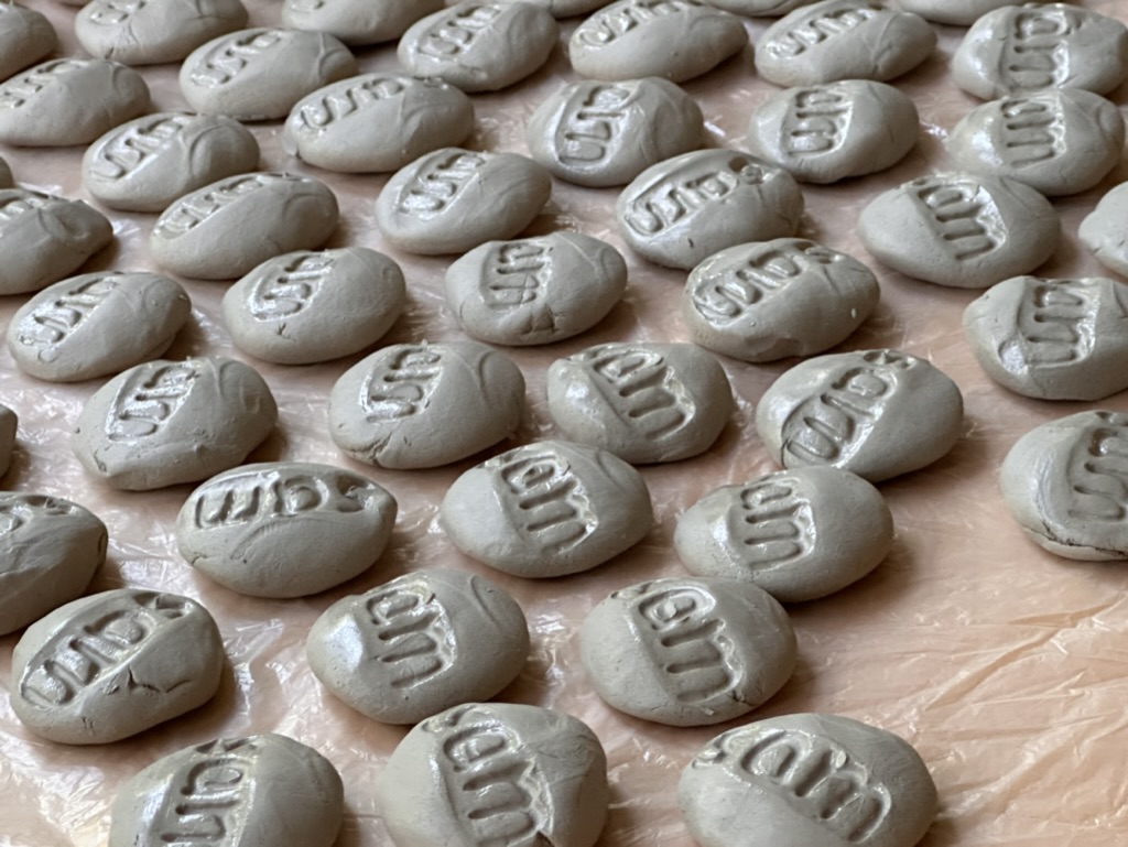 I came home late last night and found a bunch of freshly made samstones on the table drying. Diane rolled them, pressed them and stamped them all. It’s a meditative process which we still do after nearly 17 years I find them really beutiful when they are in this state