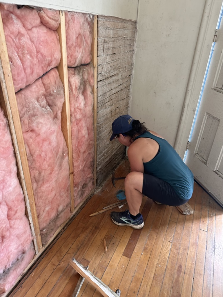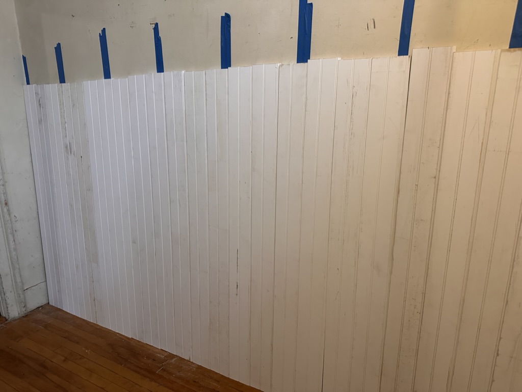 With Fluffy basically completed for the season, we got back to our house projects… Our big one for the week is to install wainscotting in the entrance way.. the wall had been destroyed by years of stackign wood there.. we decided to give it twainscotting to match the reso of downstairs. That meant removing the old sheetrock.. Below that we found a mix of ‘modern’ studs and insulation and some stretchboard and horsew hair plaster of the original walls.. Then we marked the studs and qwere ready to install the plywood underwall.