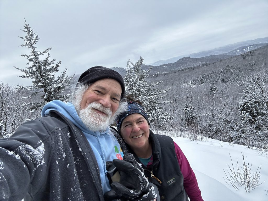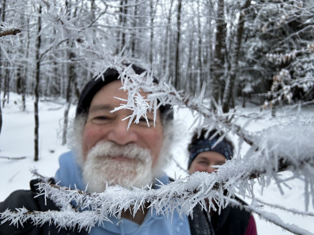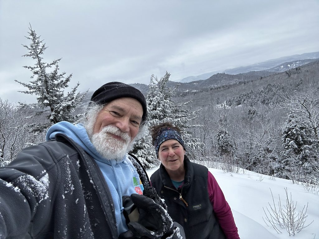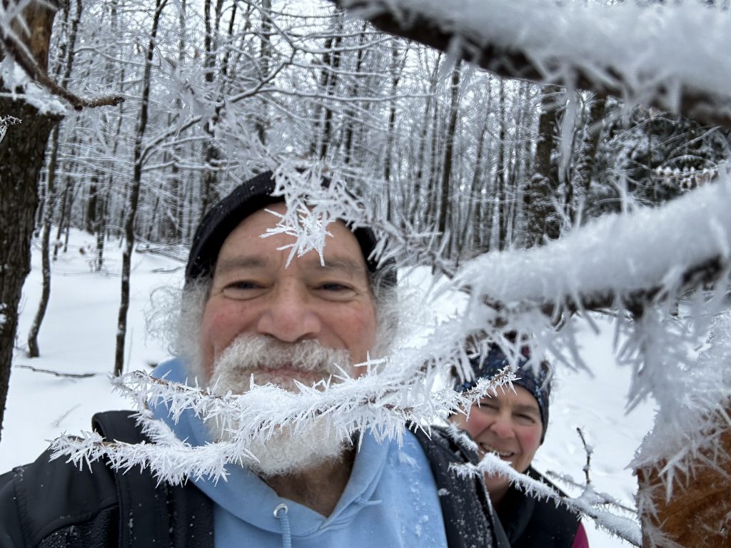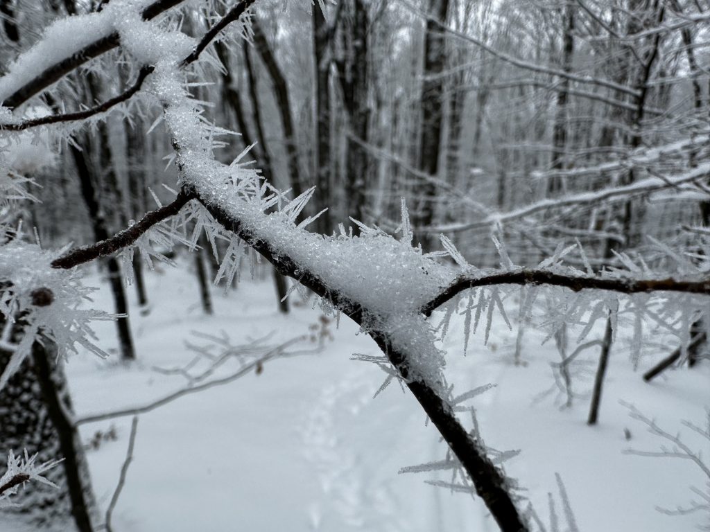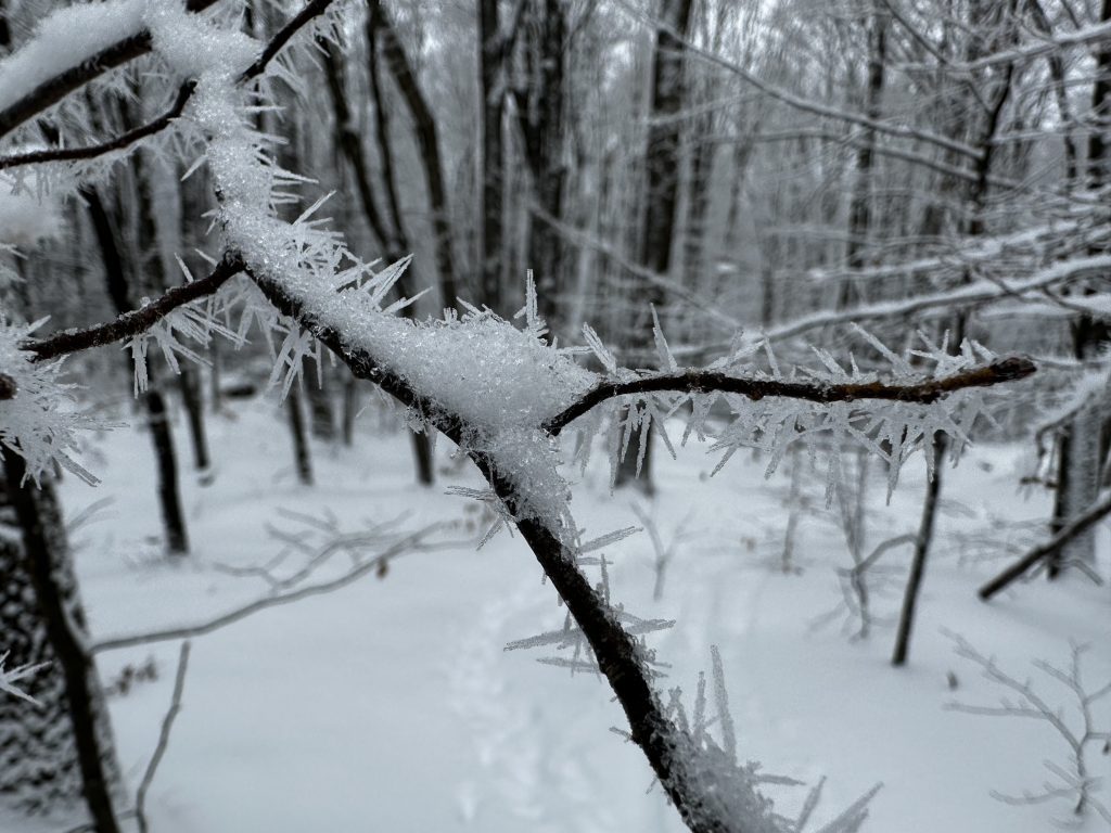 Beautiful snow today so diane and I went up one of our favorite ‘nontrails’./ we hiked up the hills around honey hollow . The snow wasn’t deep enough yet for snowshoes (hasn’t been all winter !.). but glad we had spikes on !